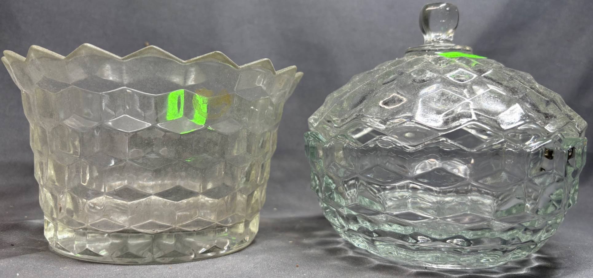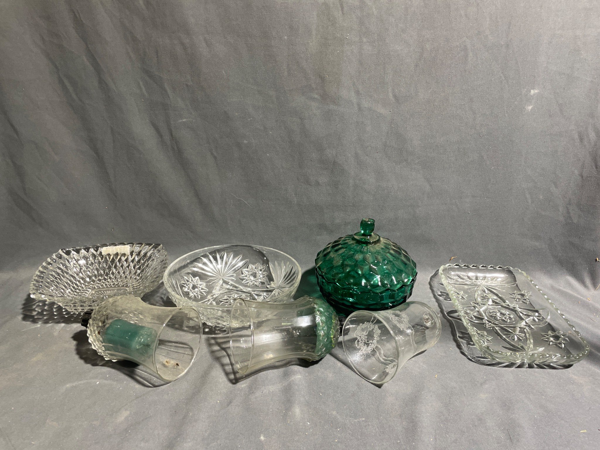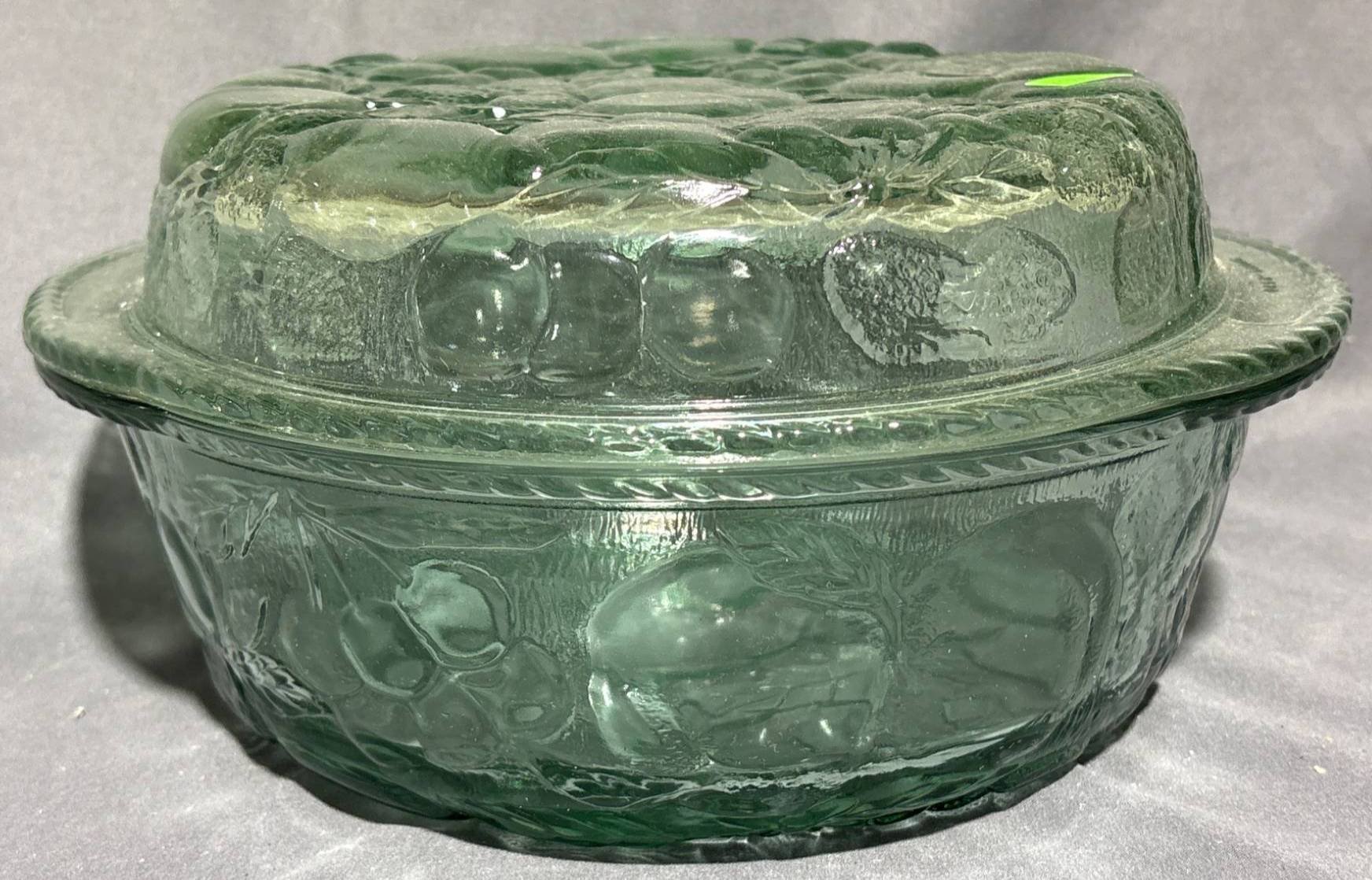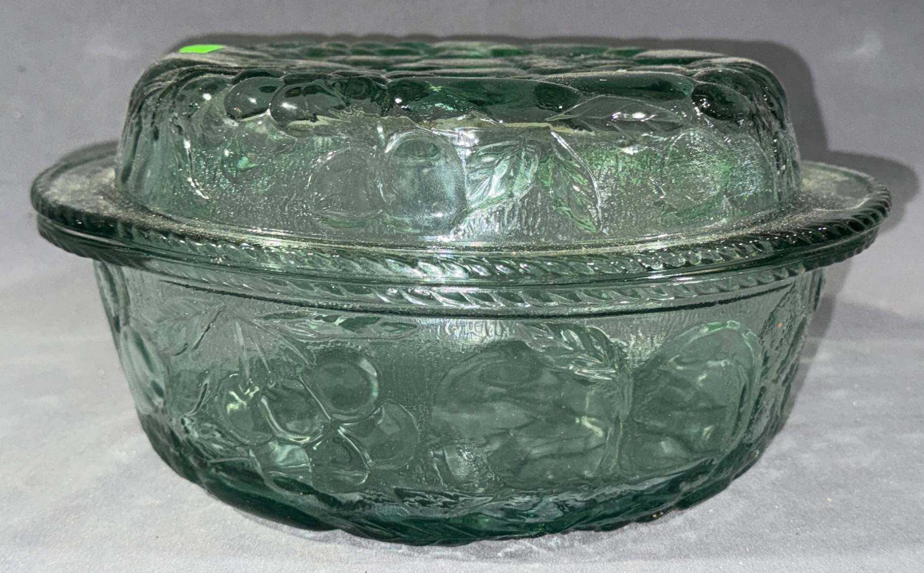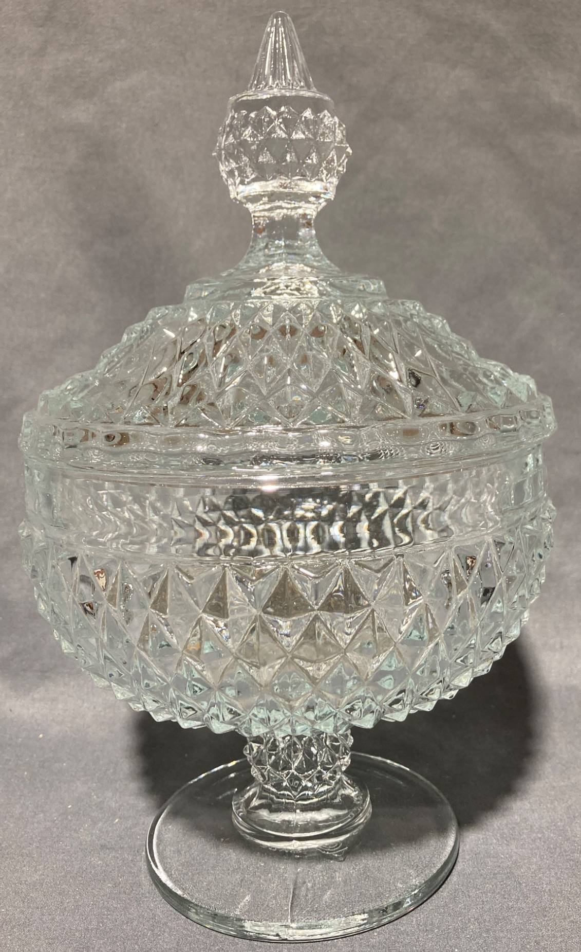 6057 Fostoria Clear Glass Lidded Jar with Green Swirl Handles 9?
