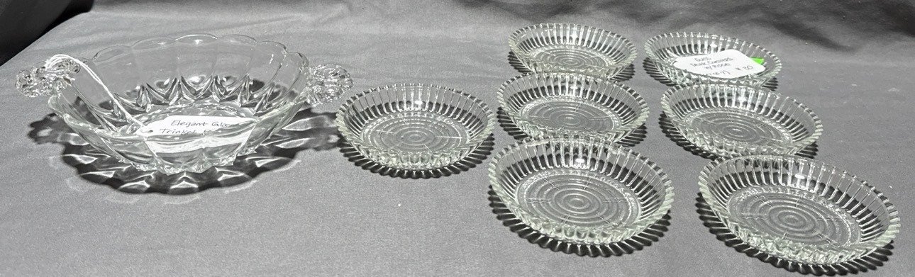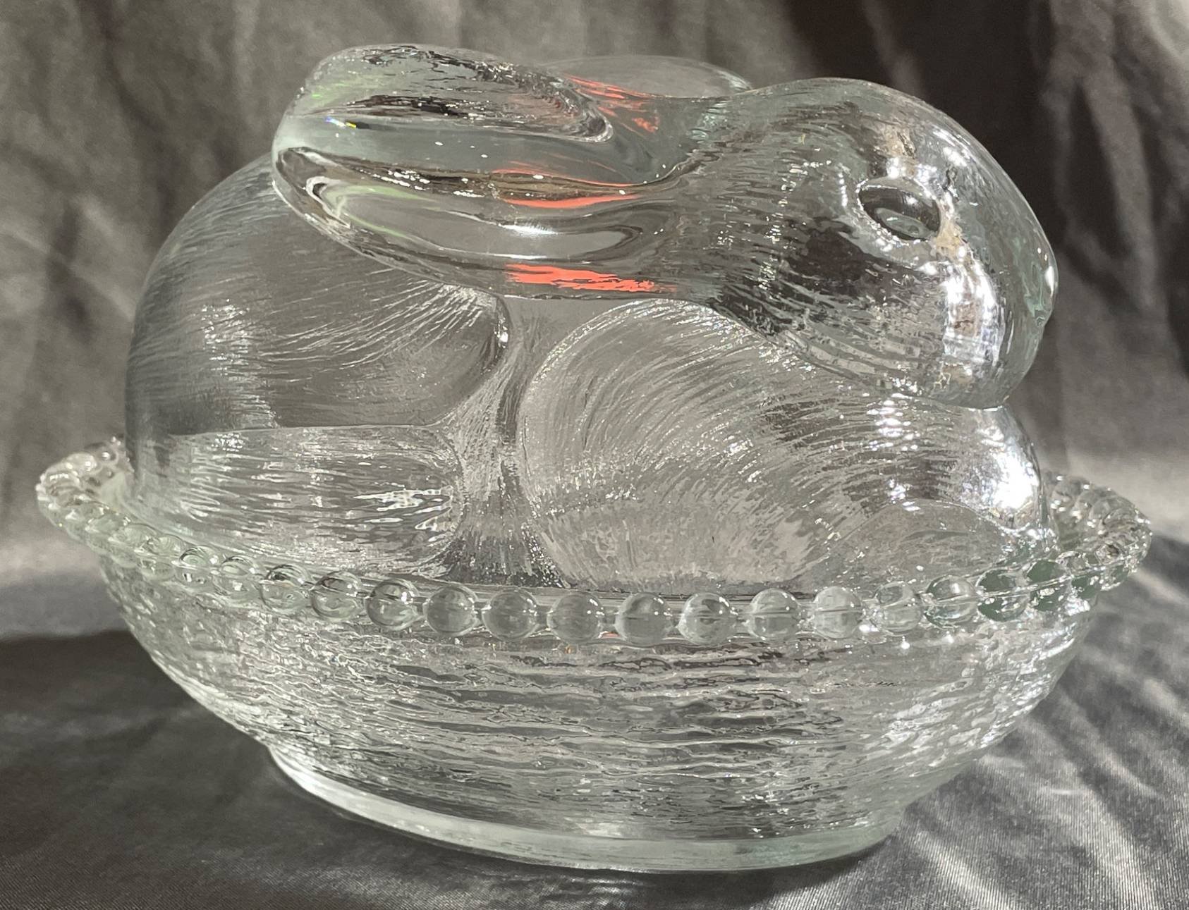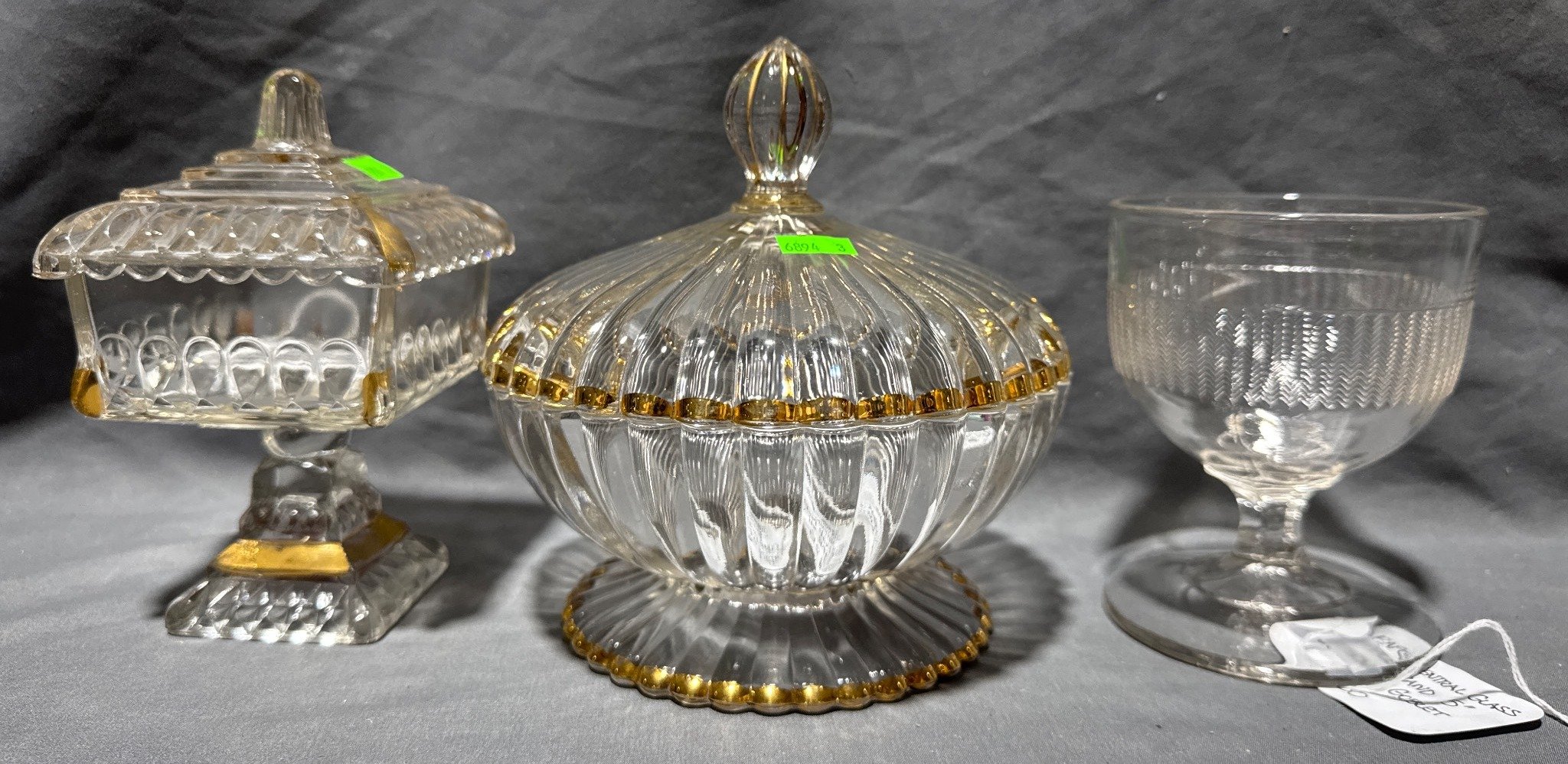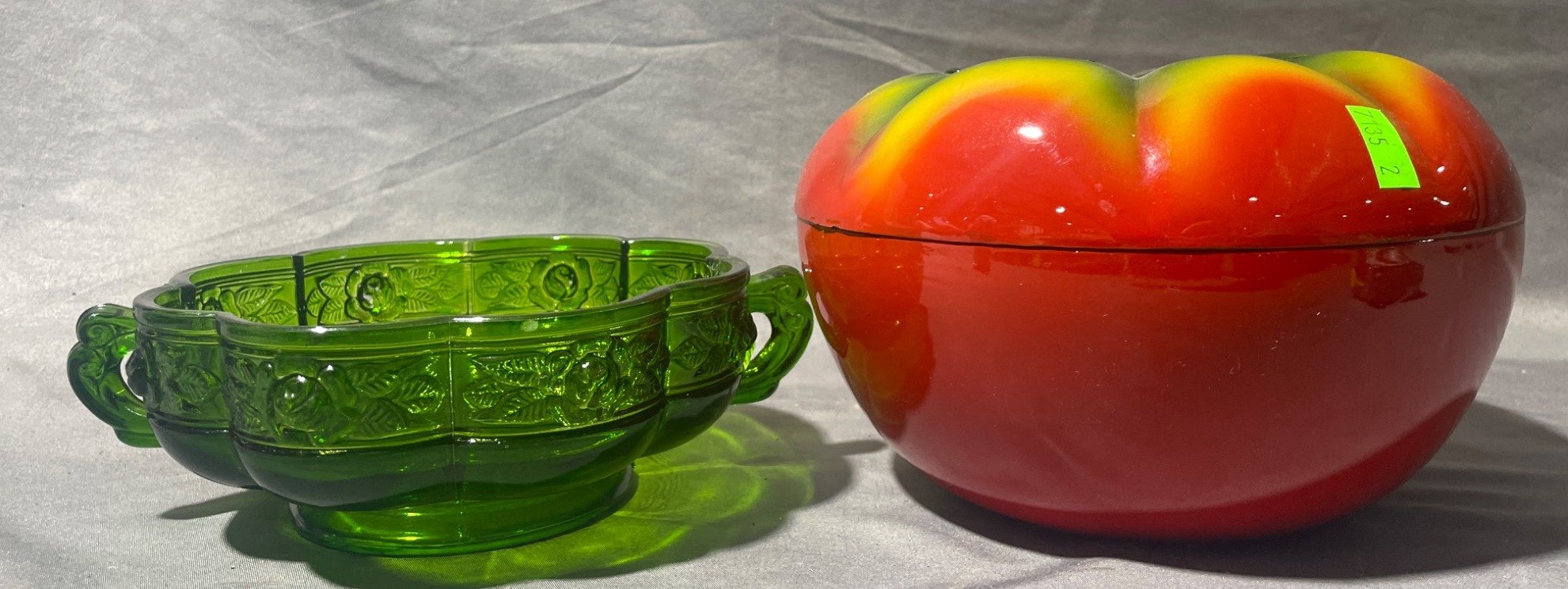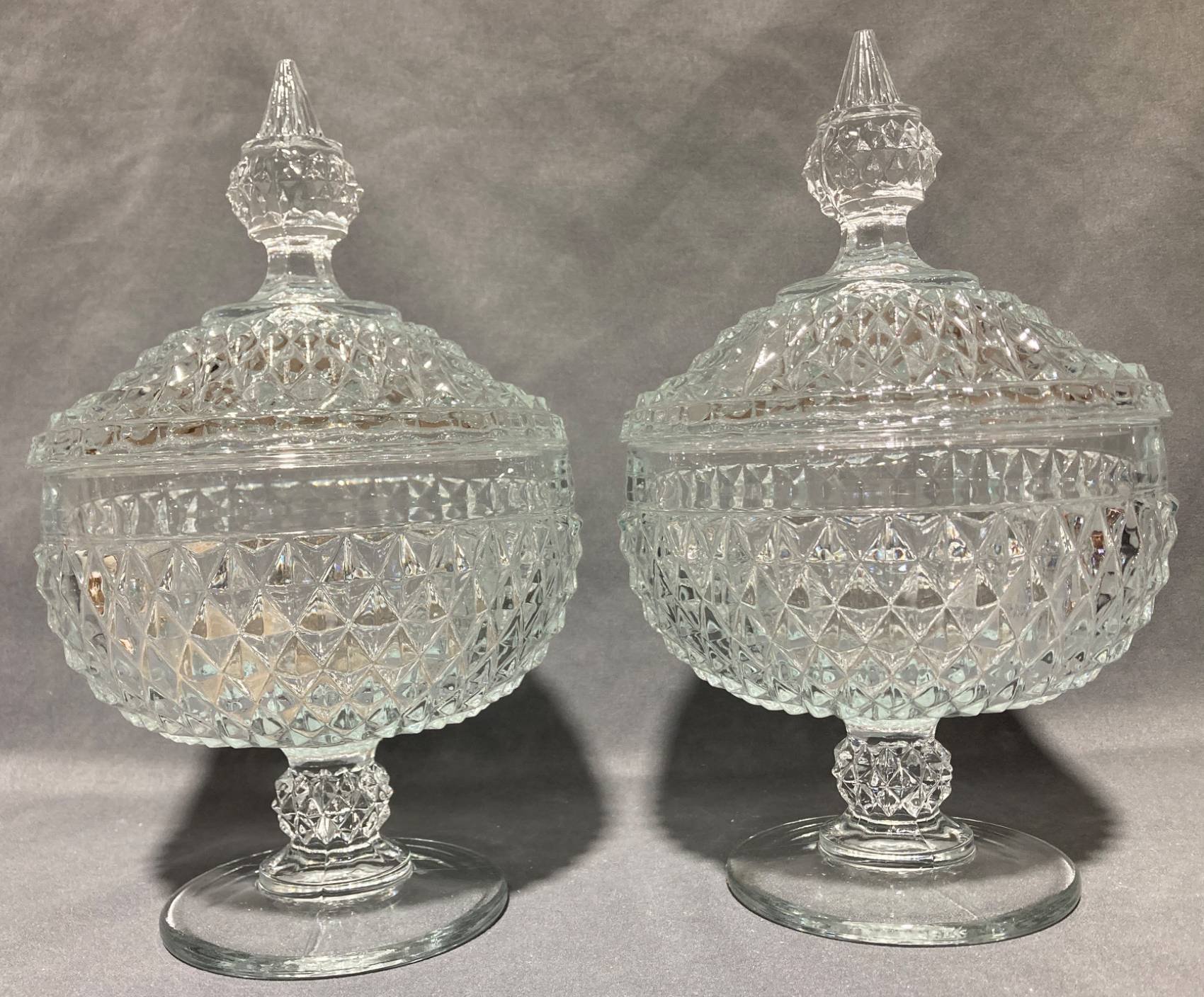 6057 Fostoria Clear Glass Lidded Jar with Green Swirl Handles 9?