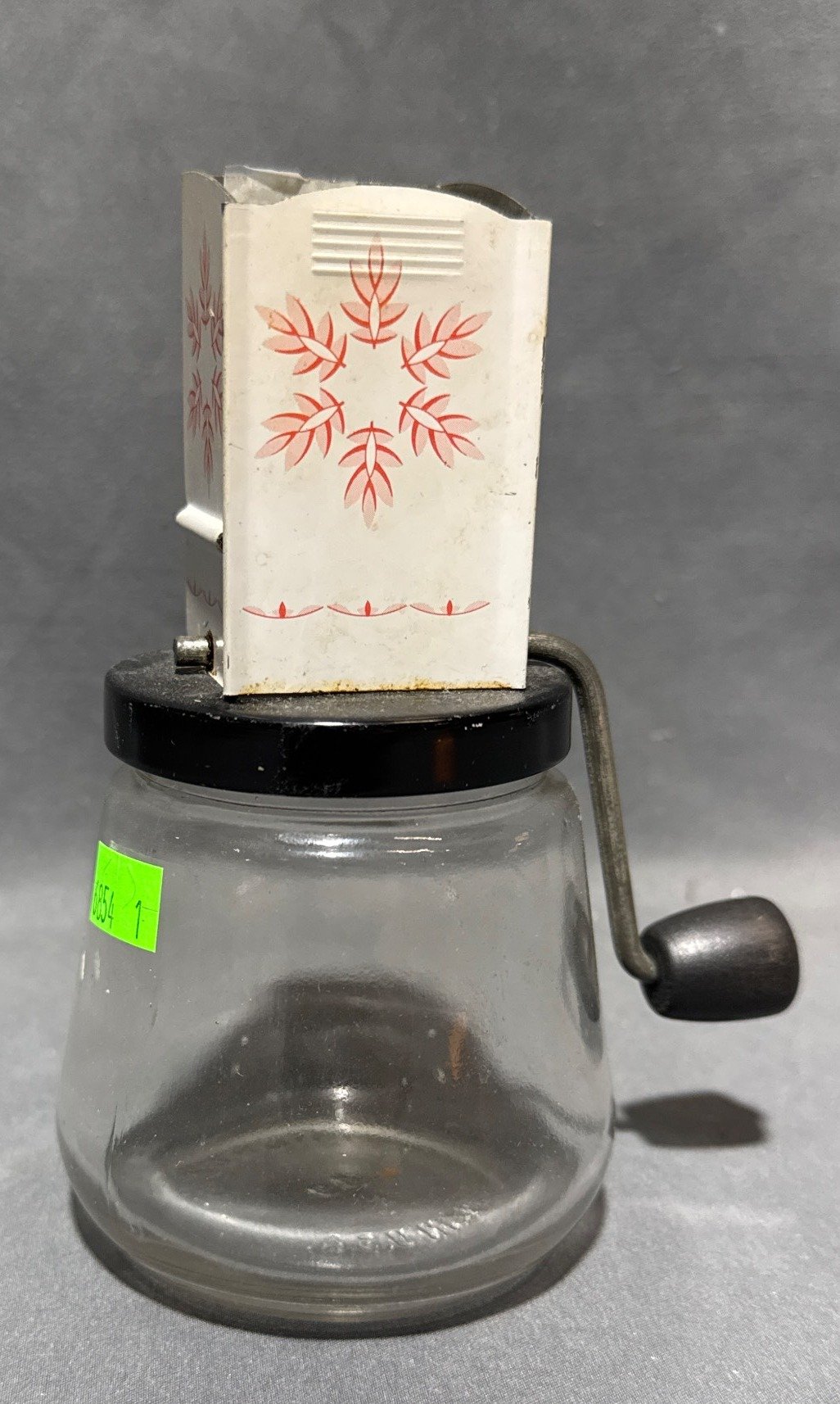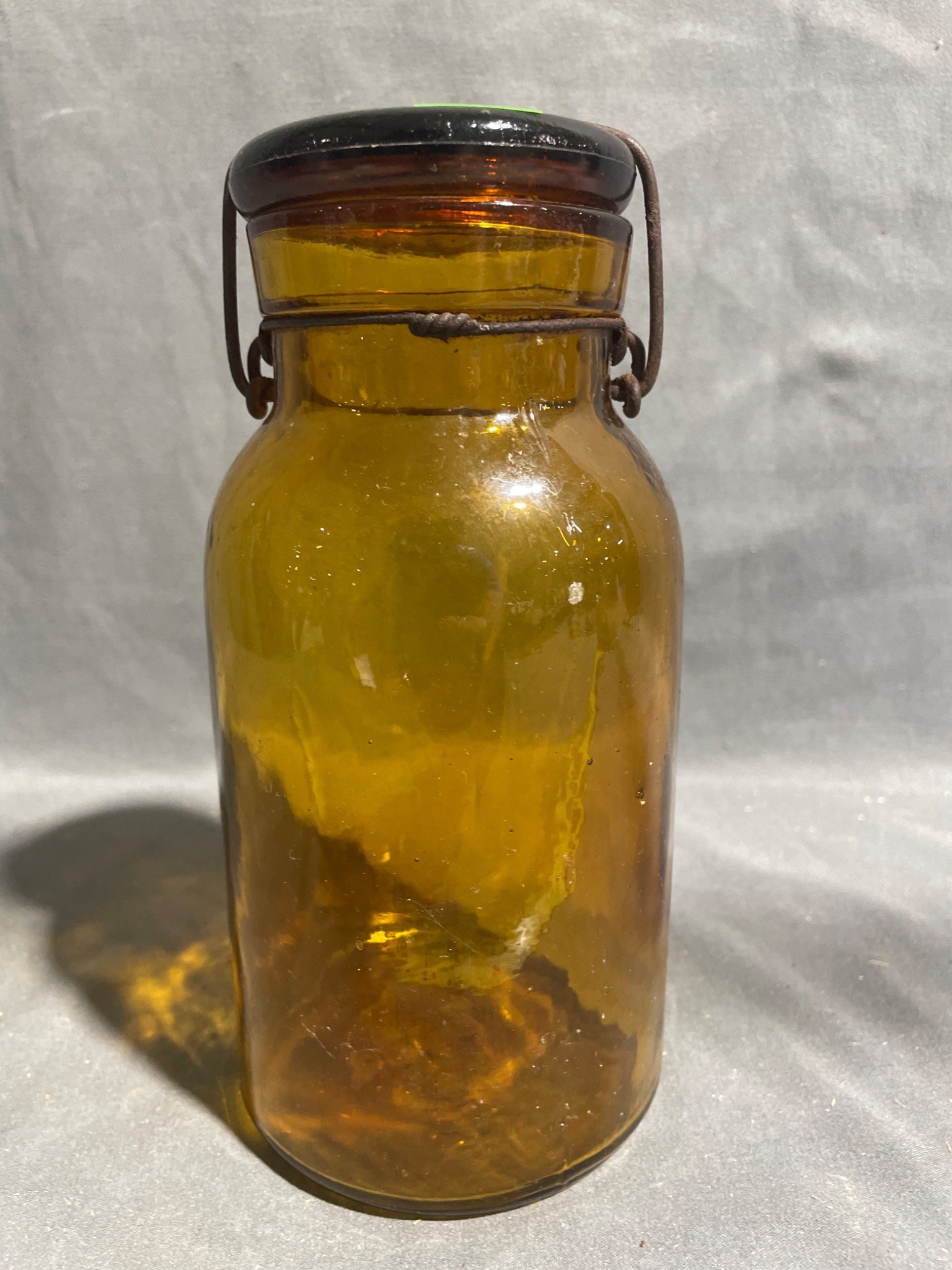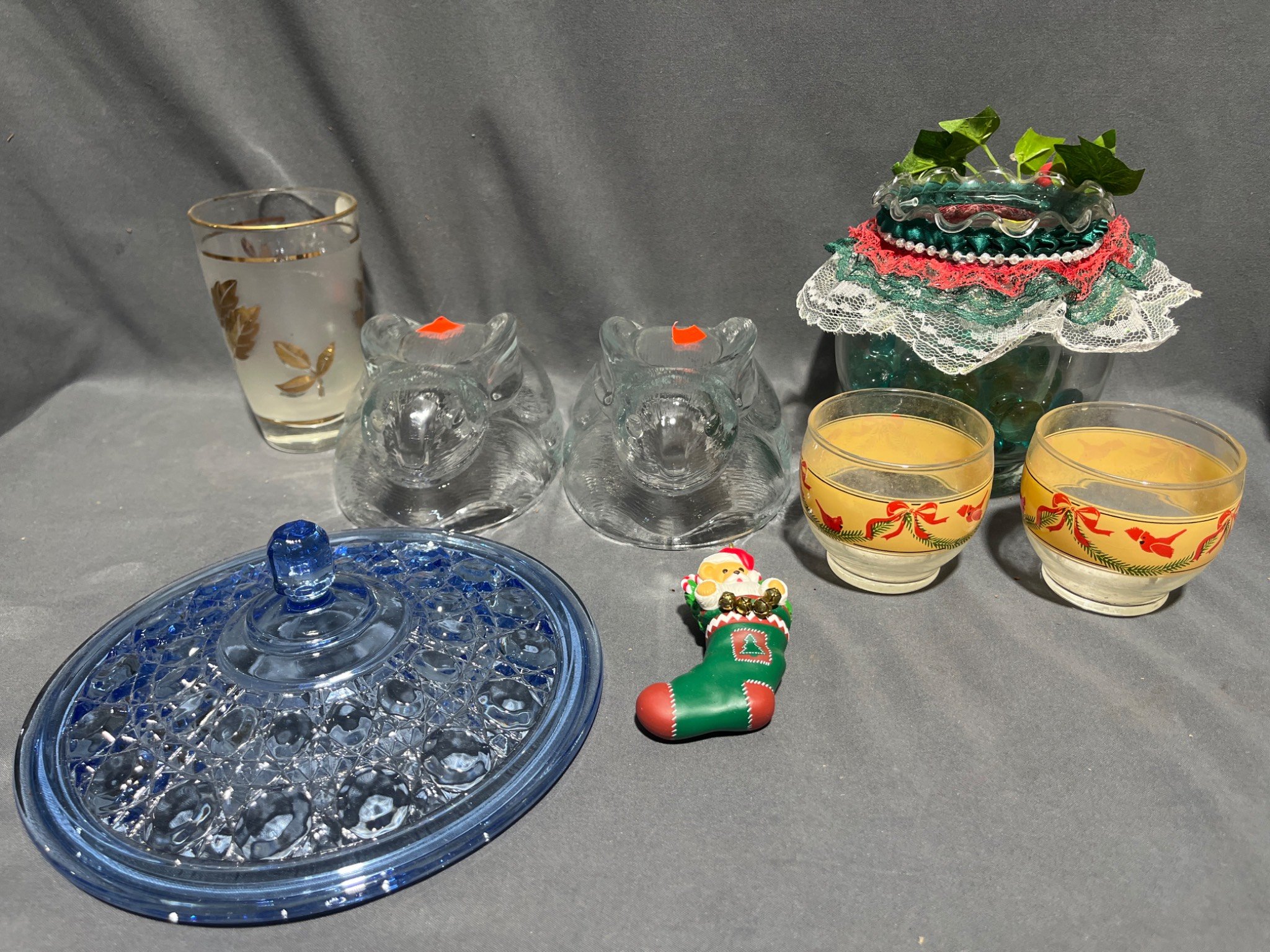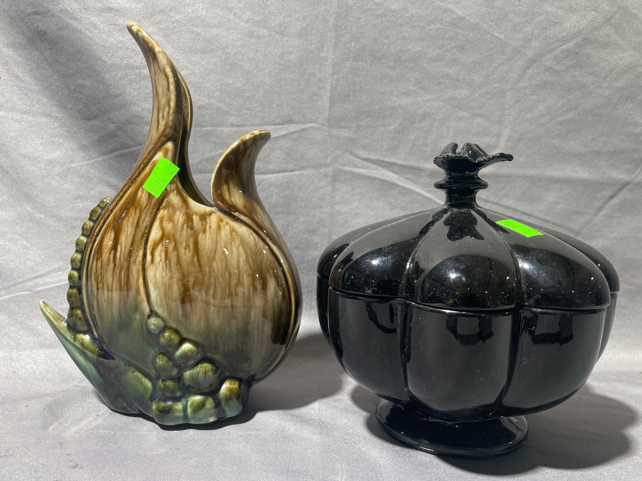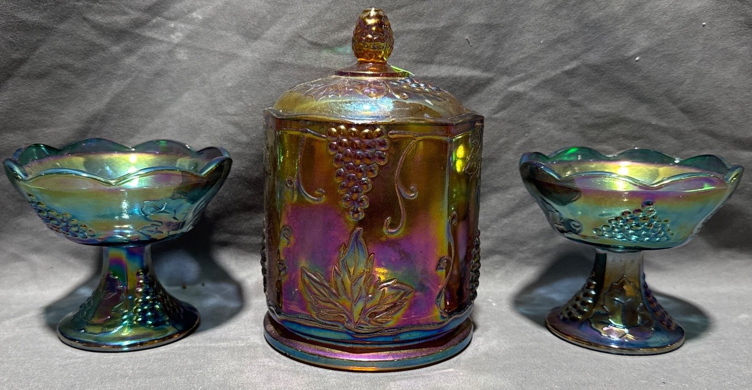 6057 Fostoria Clear Glass Lidded Jar with Green Swirl Handles 9?