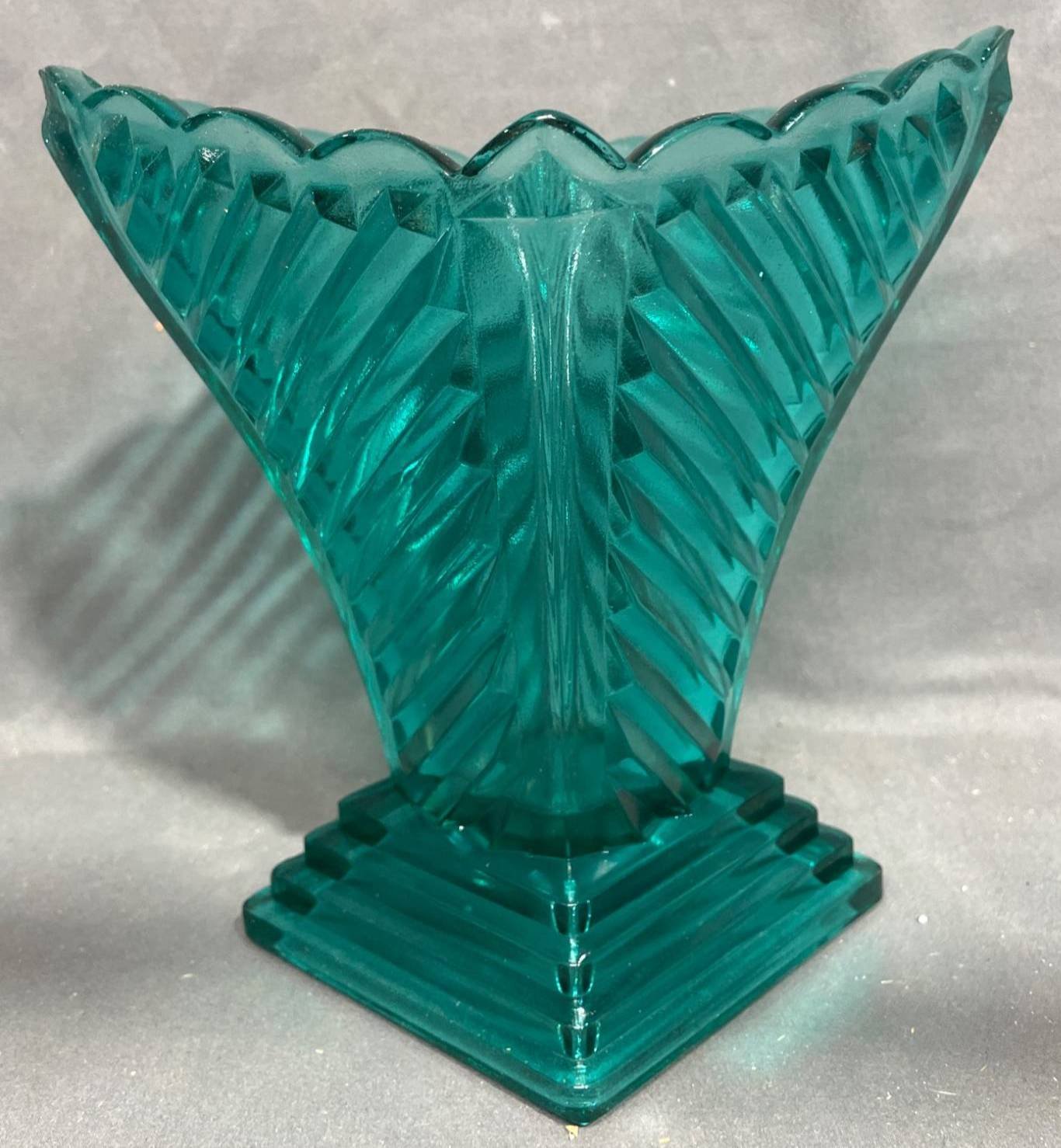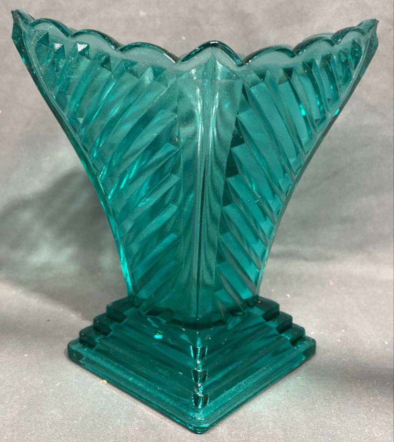 6061 Tiara Glass Marquis Aquamarine Art Deco Vase 6”x7”x7”