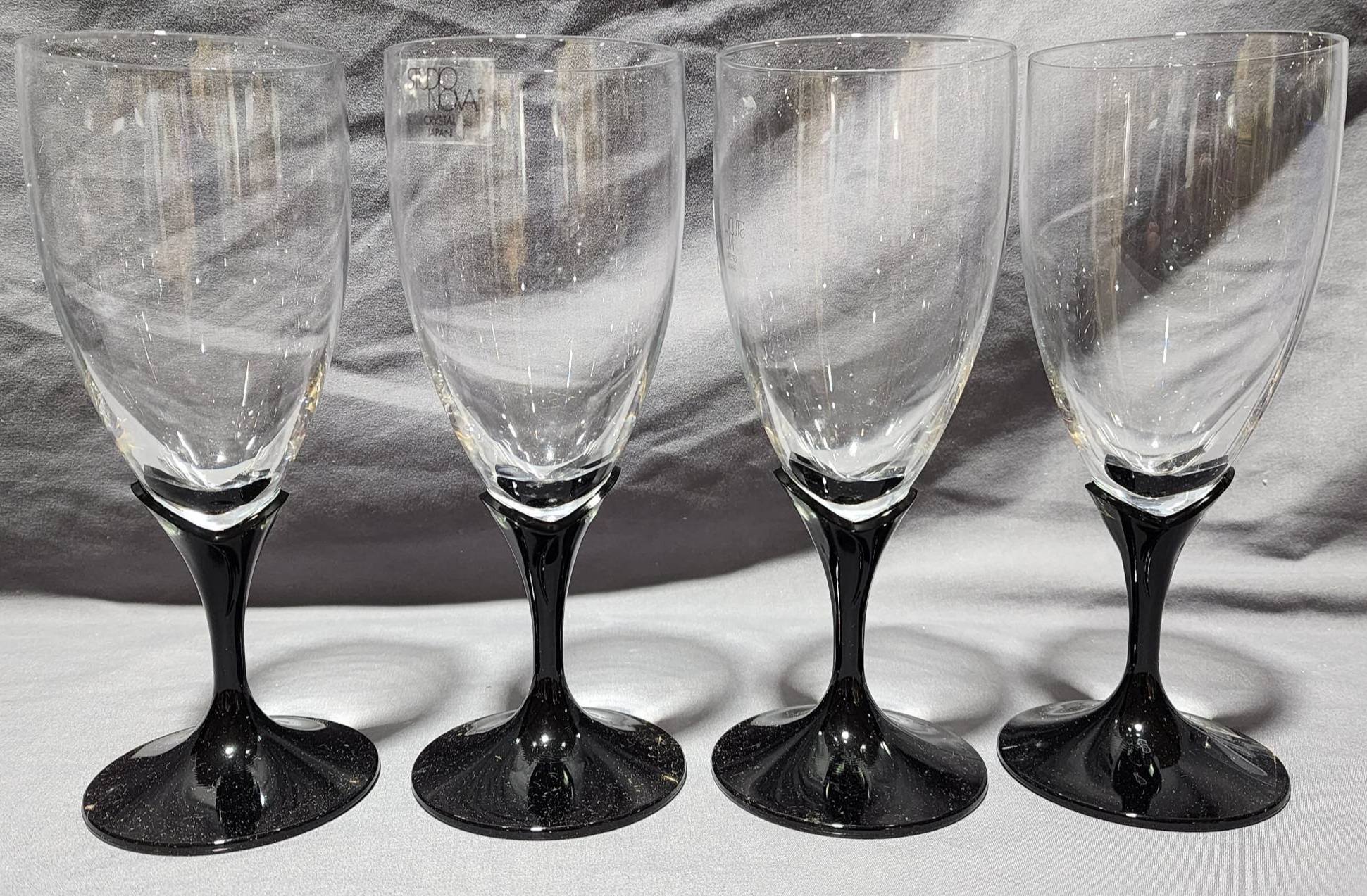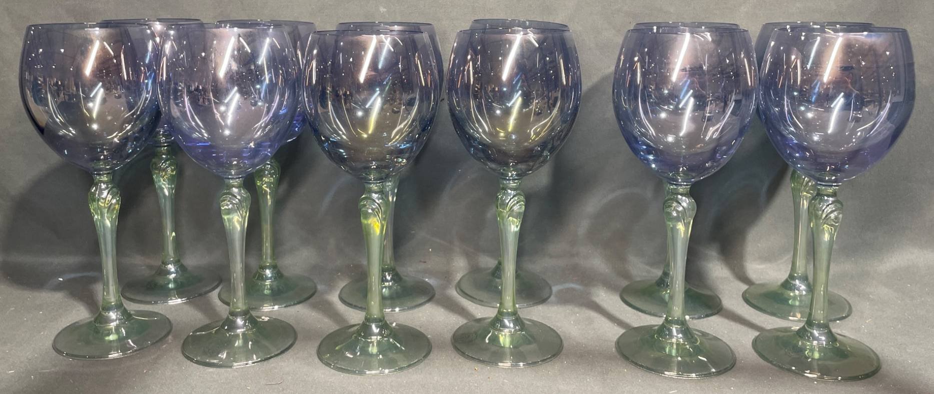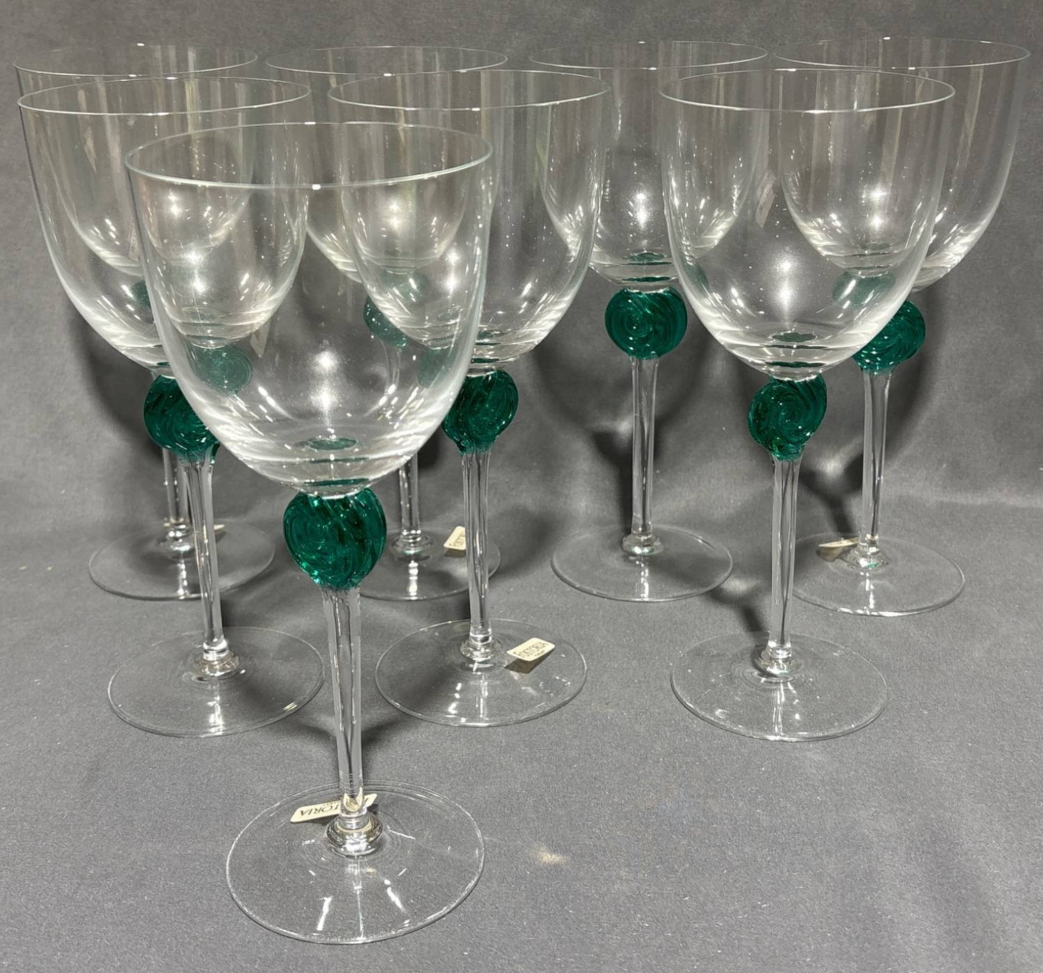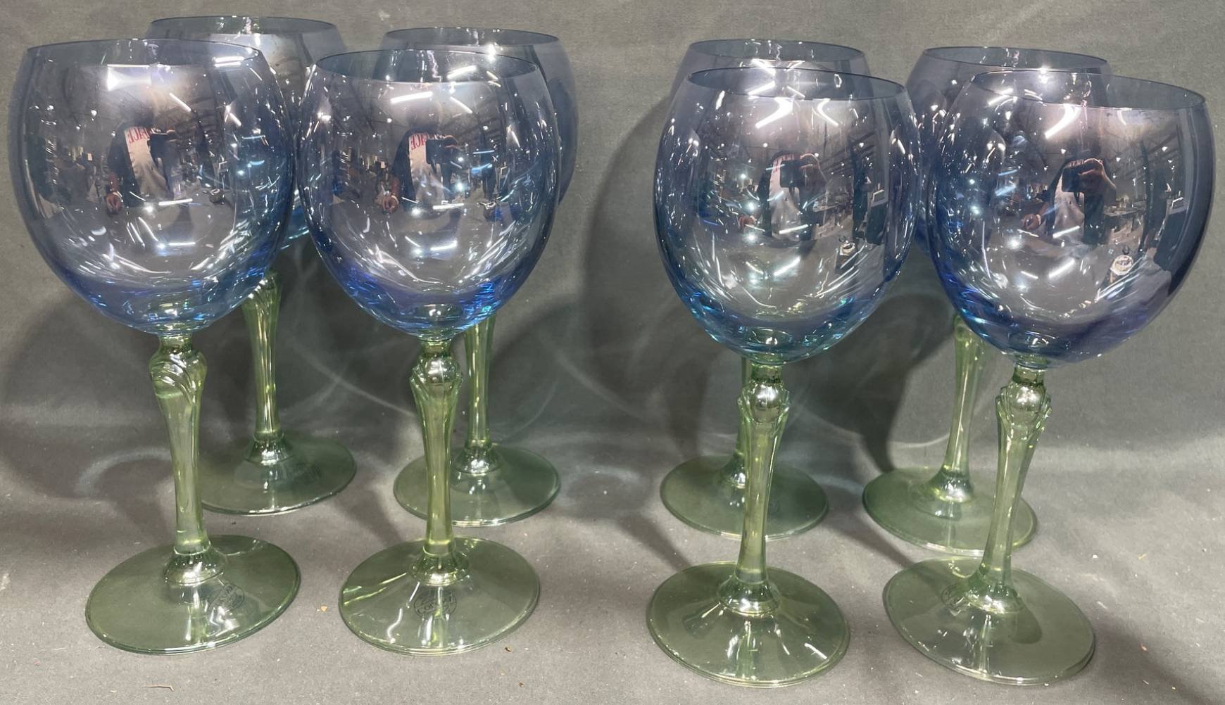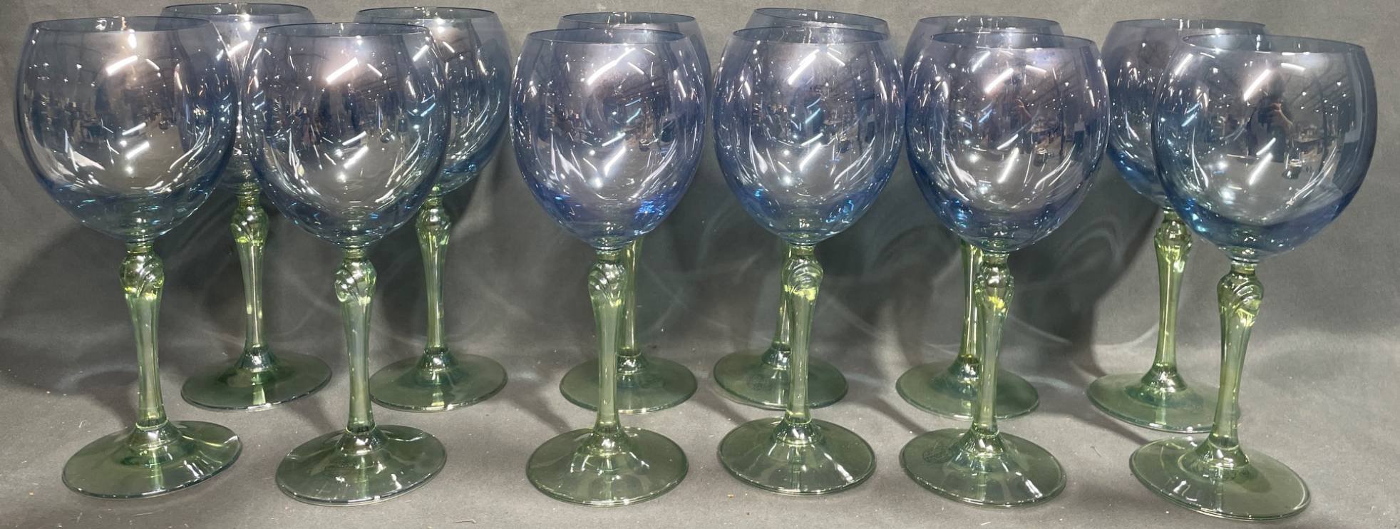 6064 12 Blue Stemmed Glasses with Green Bases by Colony, Made in Slovakia 2.5”x8”
