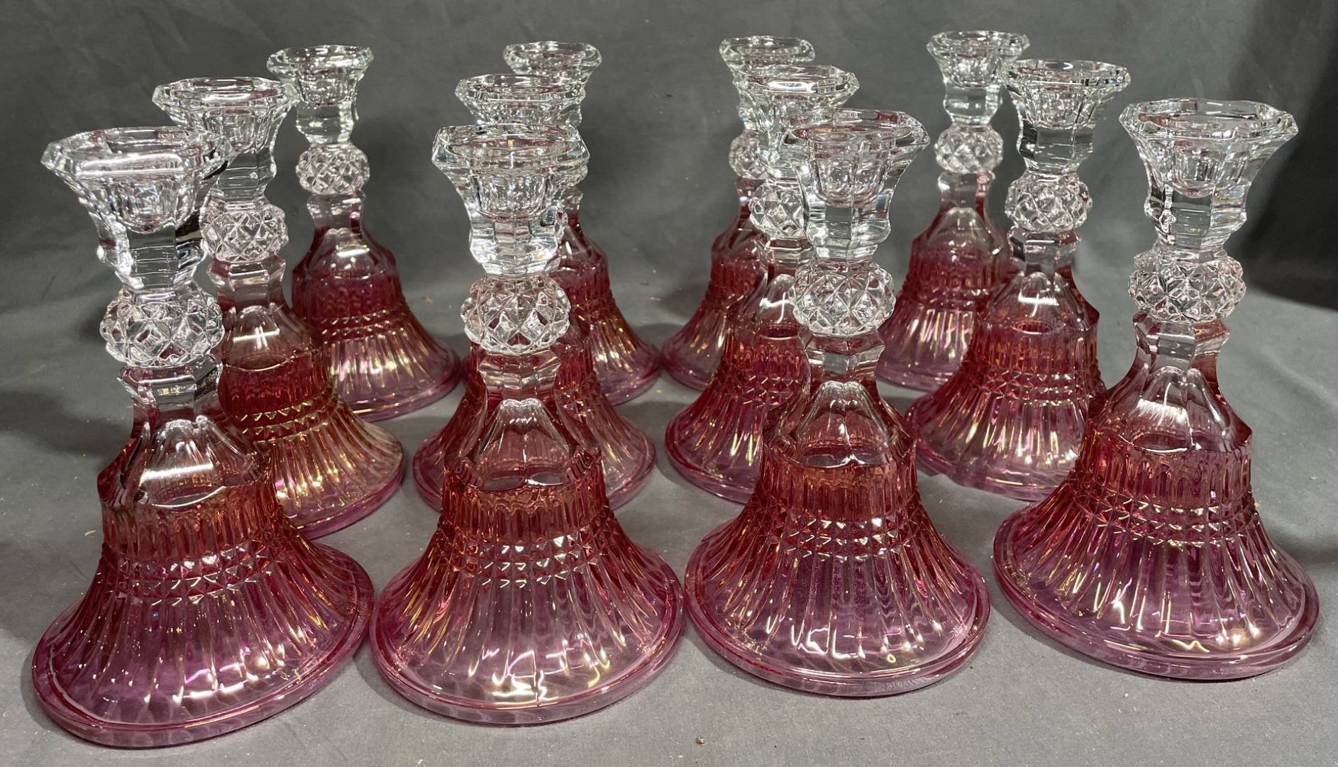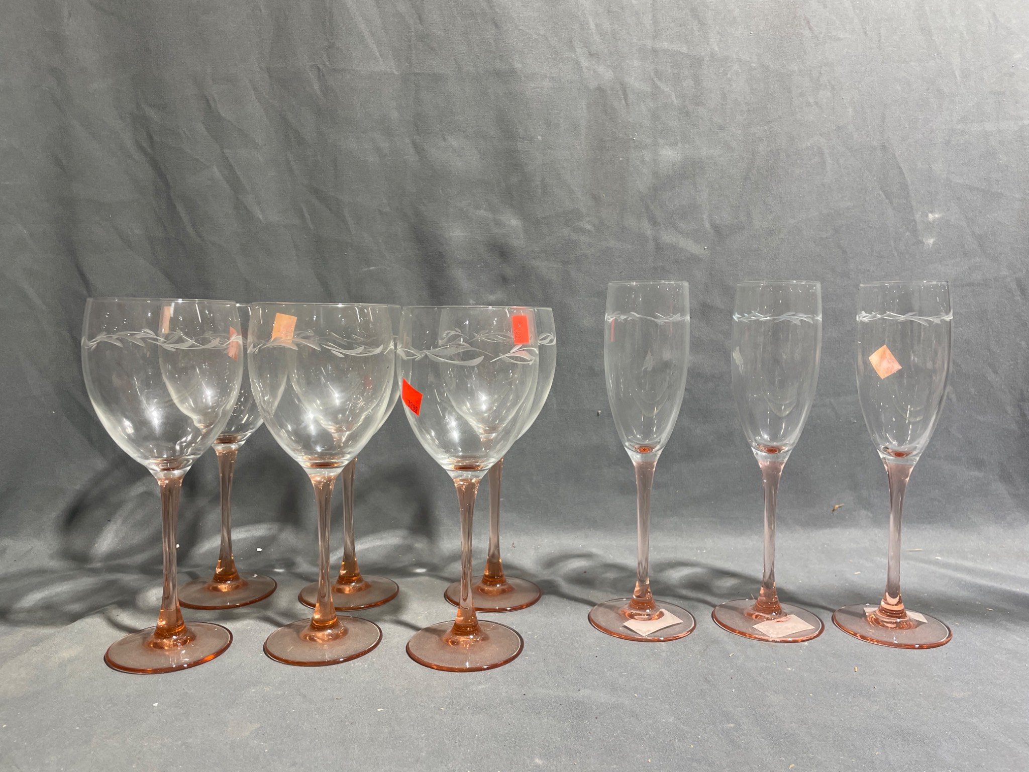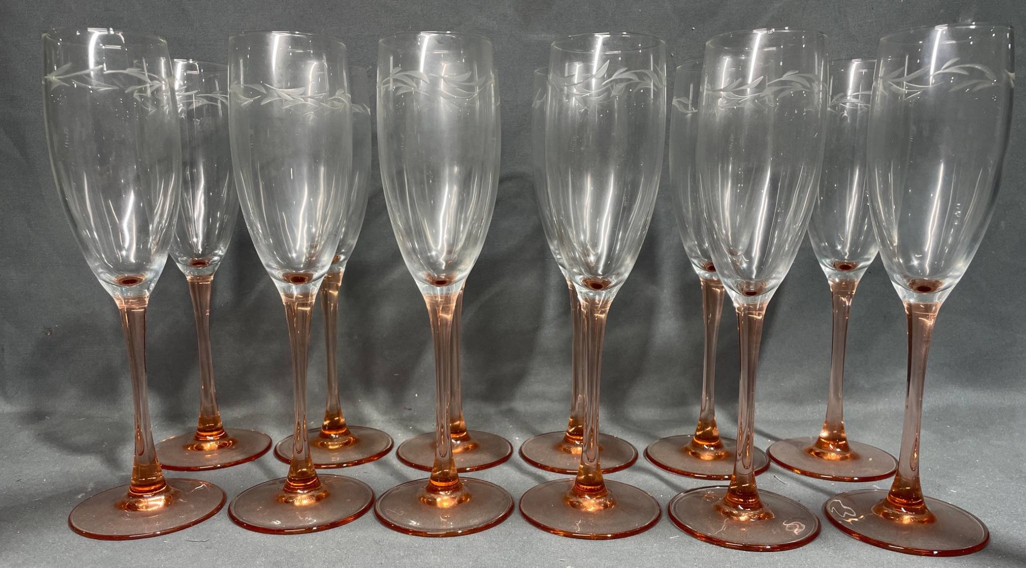 6067 12 Luminarc Cristal D’Arques Champagne Flutes with Etched Glass Pink Rose Stem 2”x9”