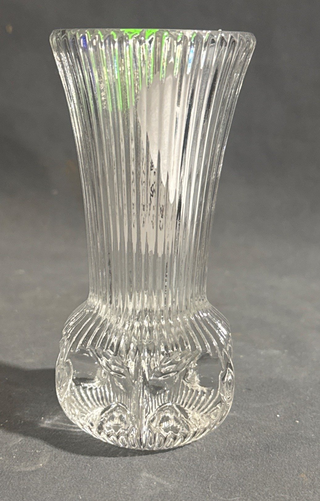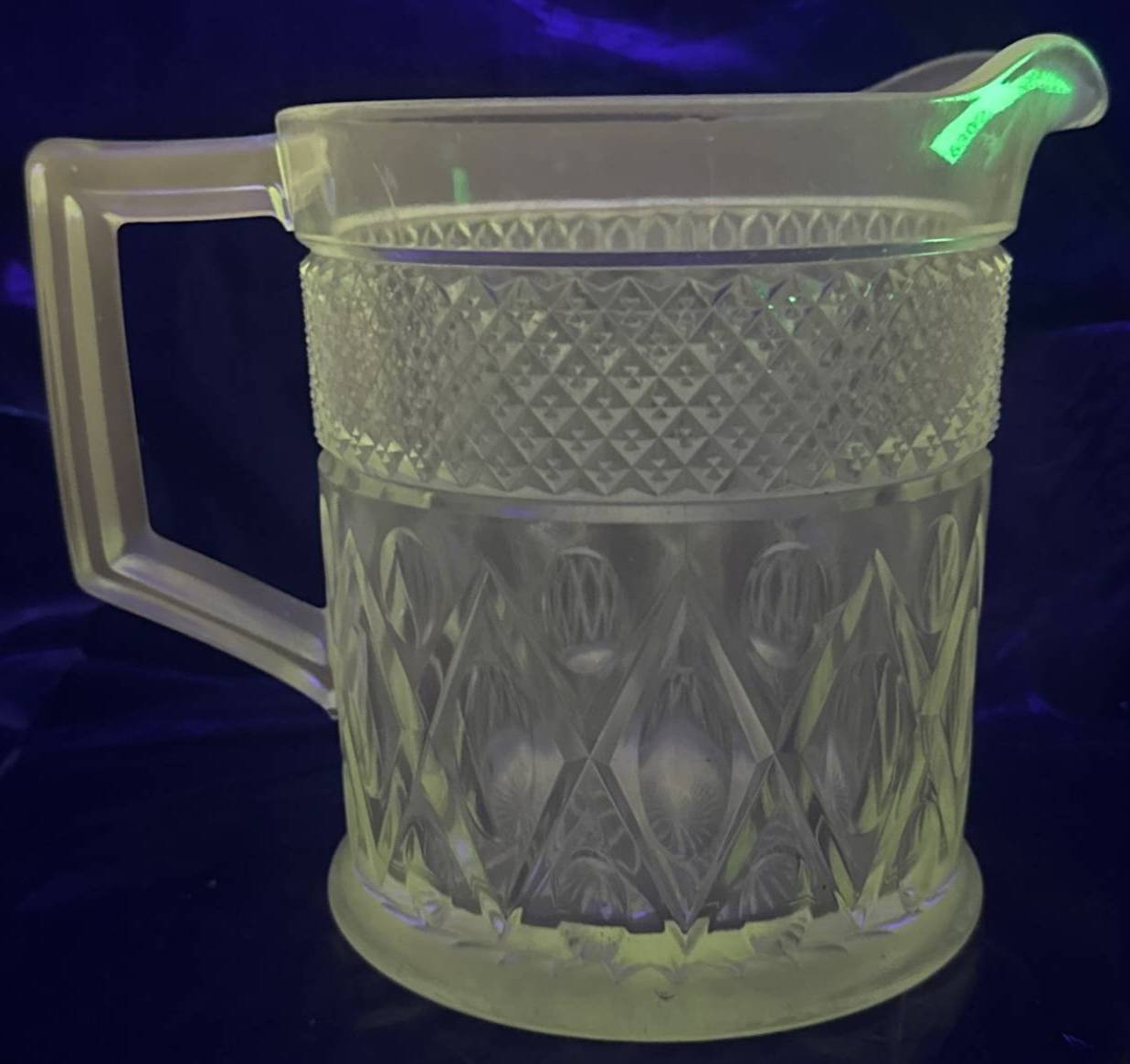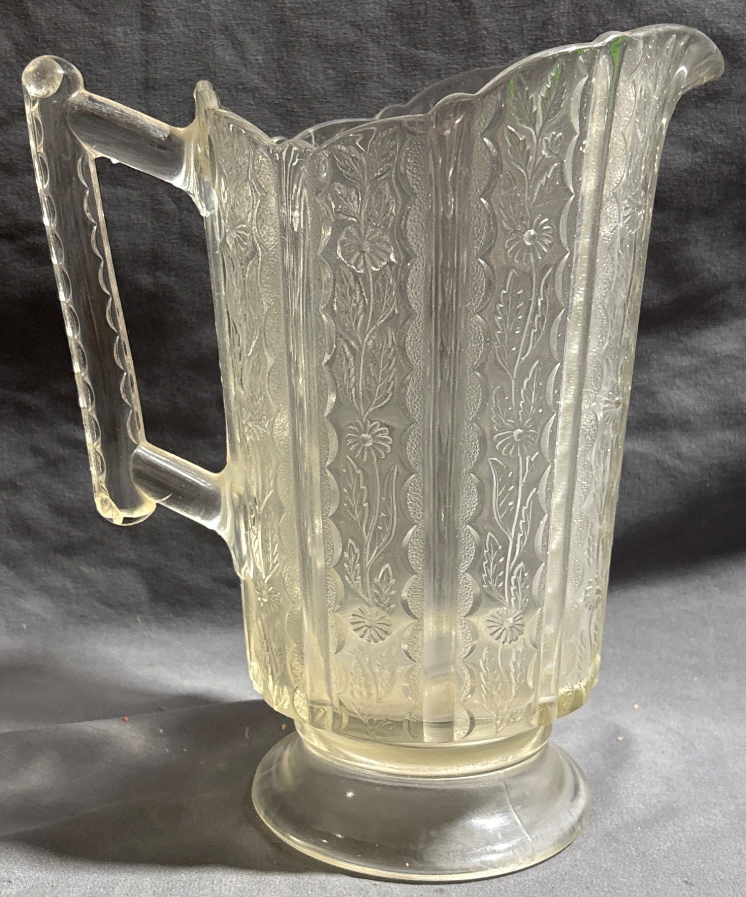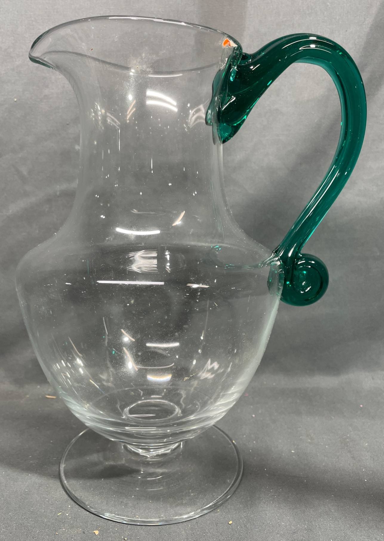 6078 Vintage Fostoria Hungary Clear Glass Pitcher with Green Handle 4”x10”.