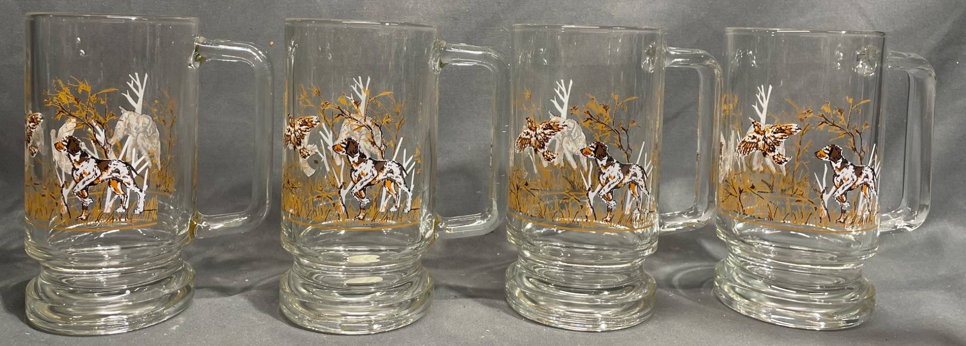 6082 4 Clear Glass Beer Mugs with Hunting Dog and Wildlife Scene Design 3”x5.5”