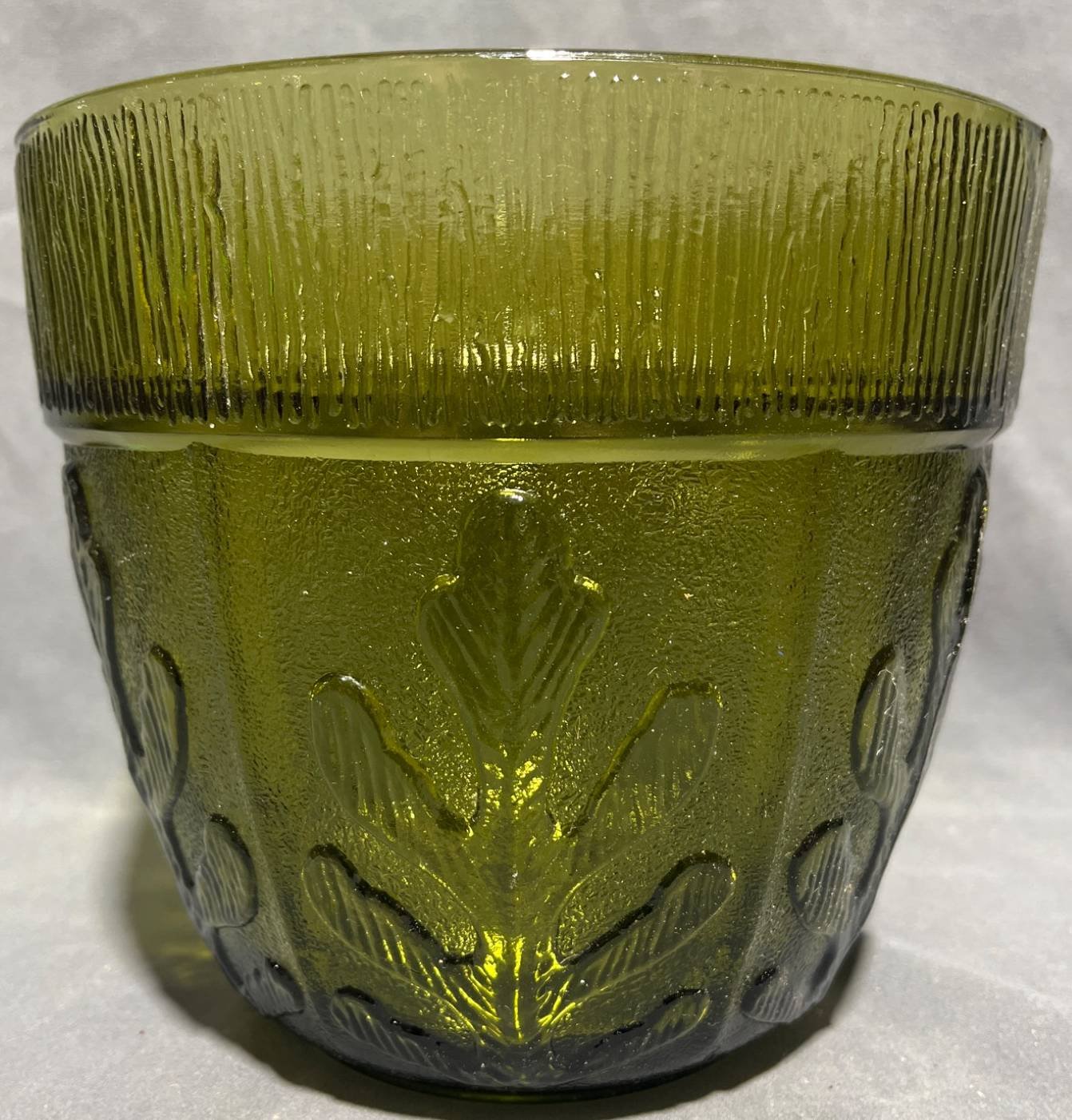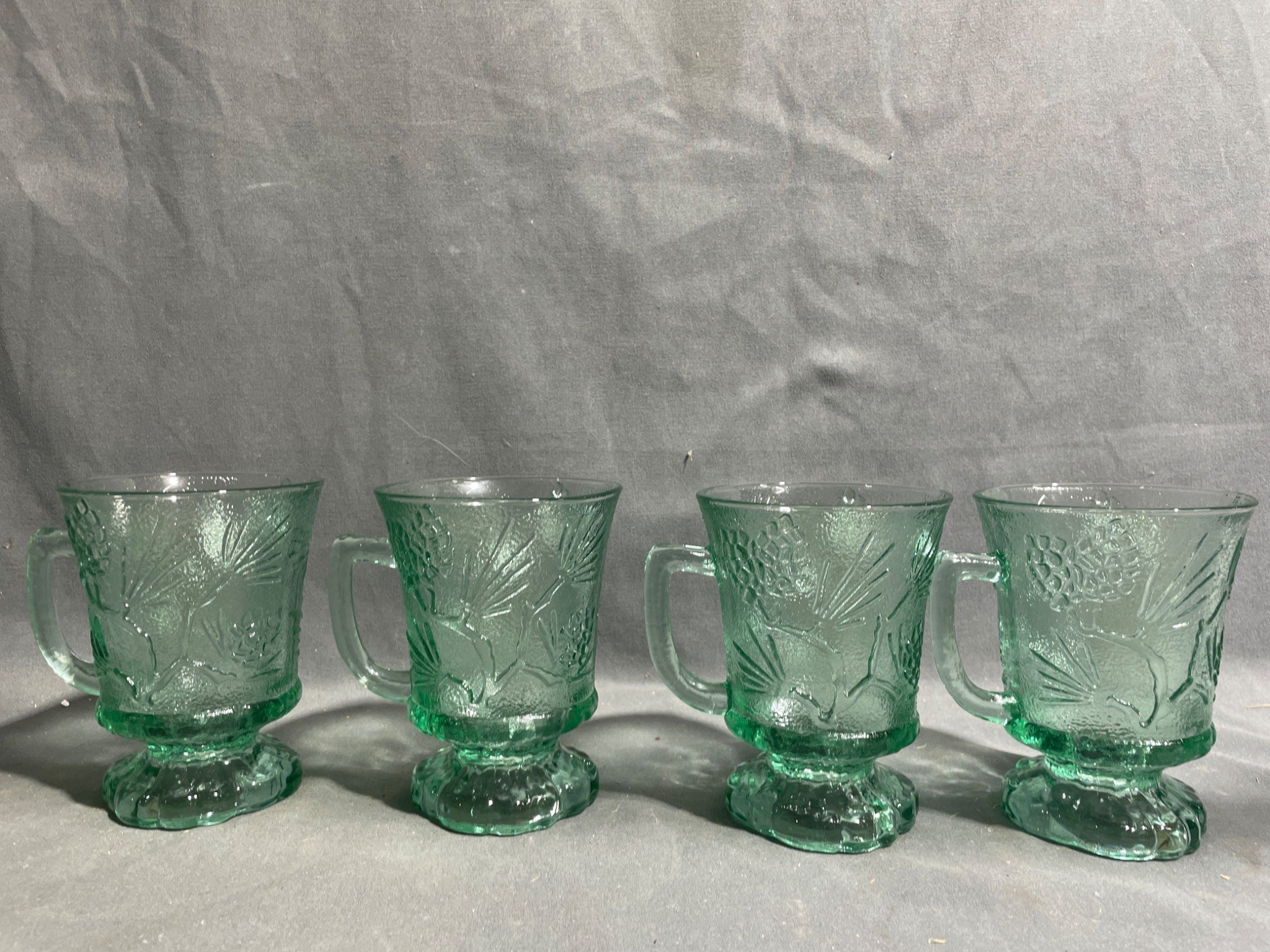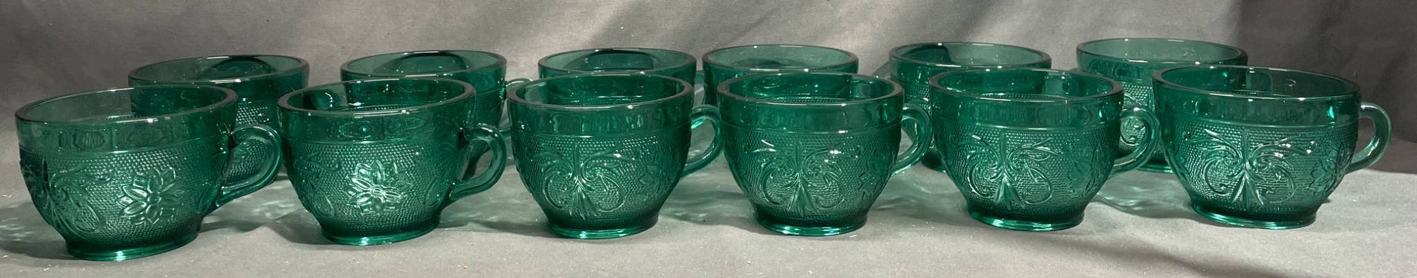 6085 12 Tiara Spruce Green Pressed Glass Teal Cups with Floral and Scrollwork Pattern, 4”x3”