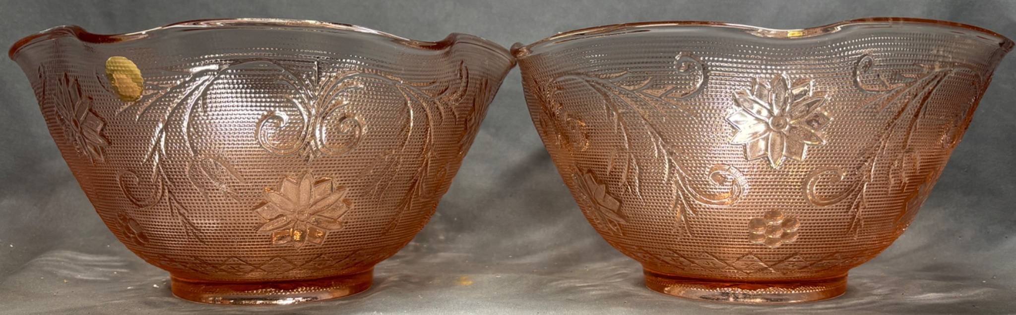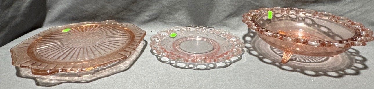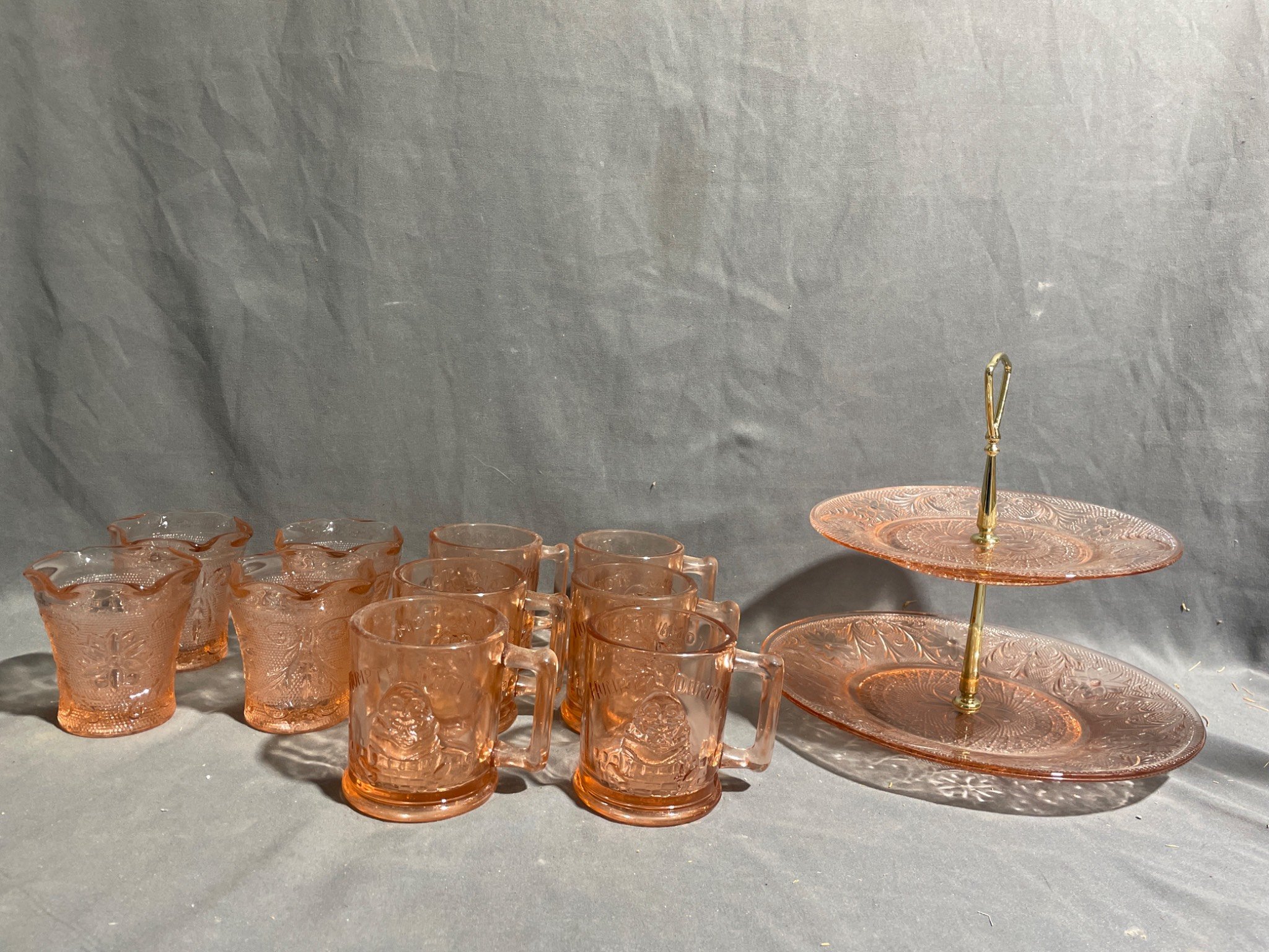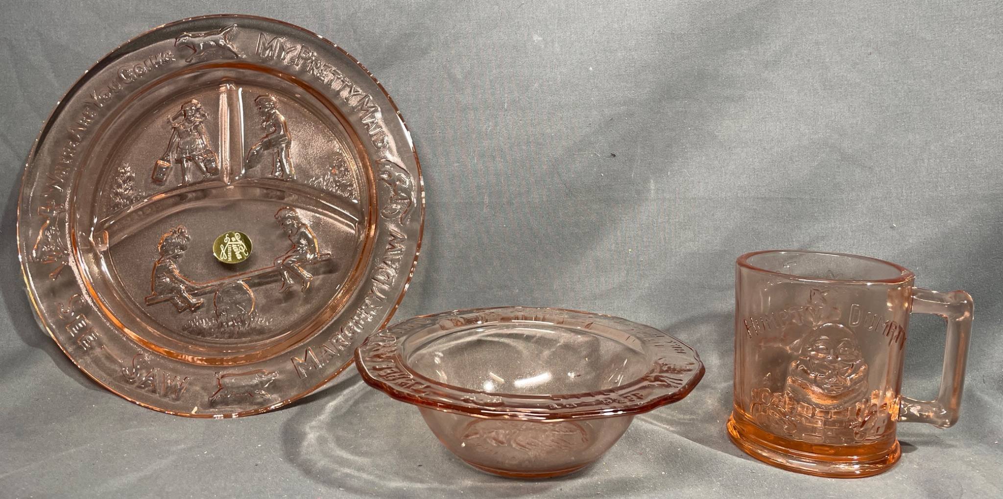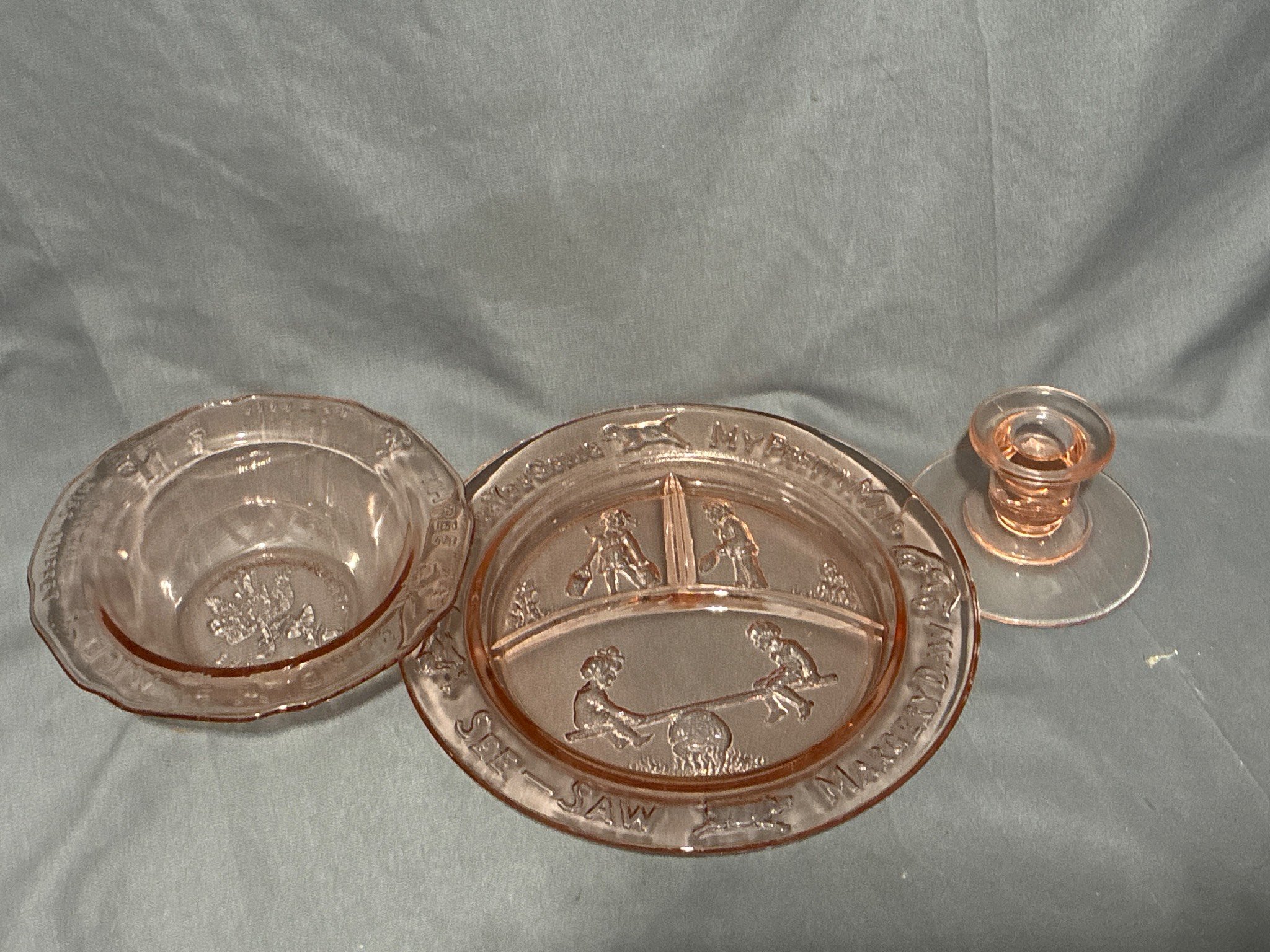 6088 Pink Depression Glass Dishware with Nursery Rhyme Motifs