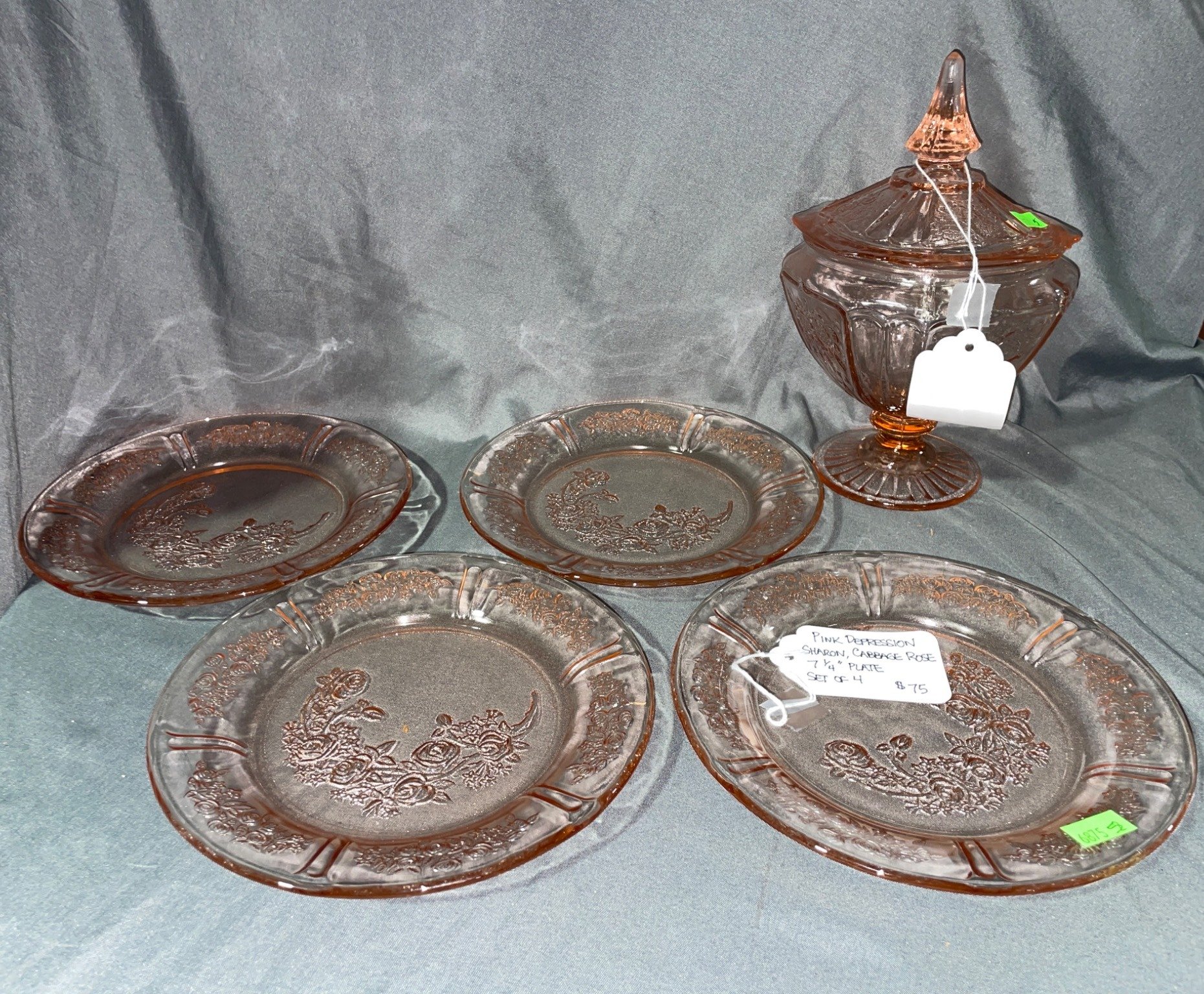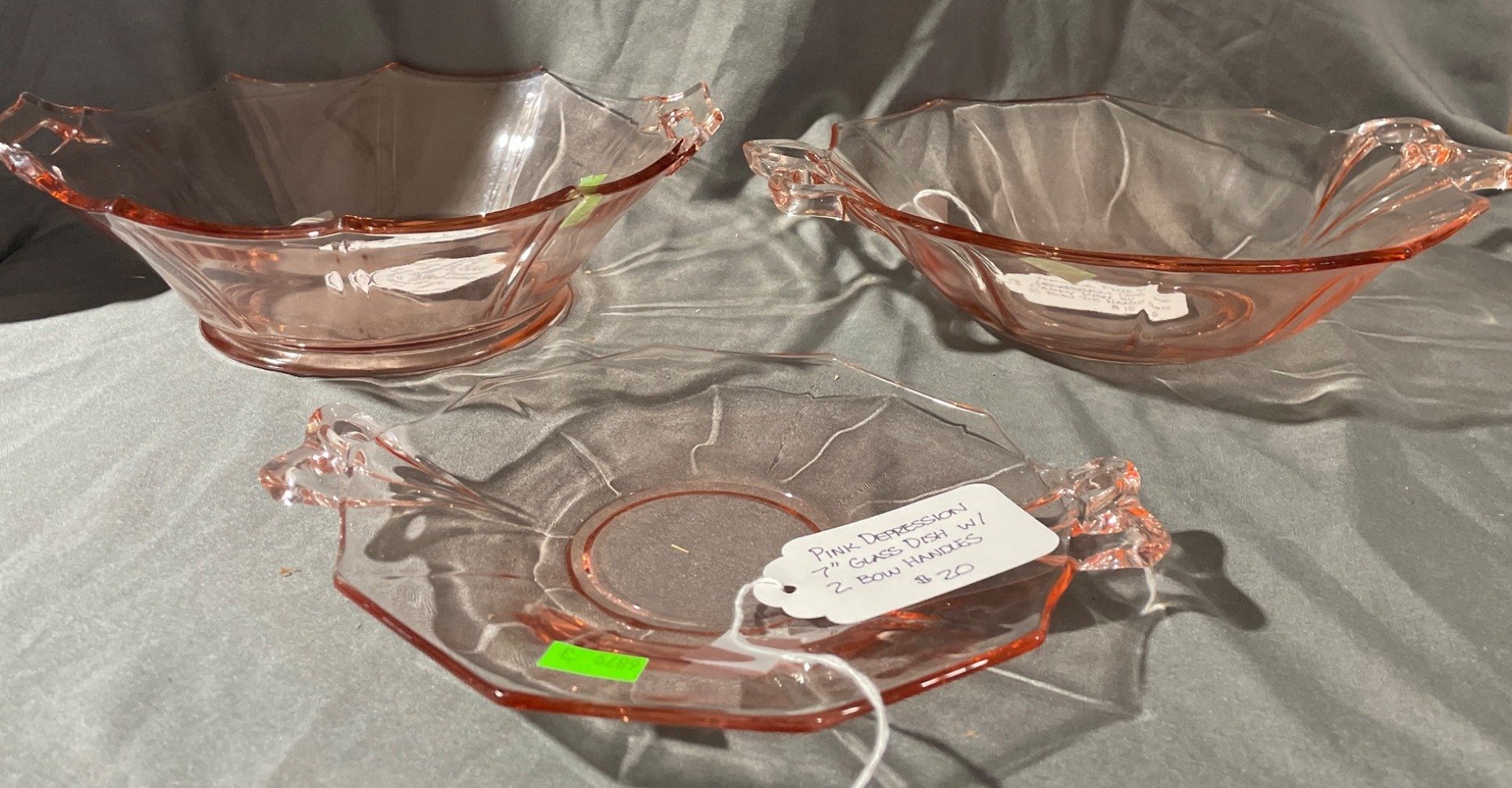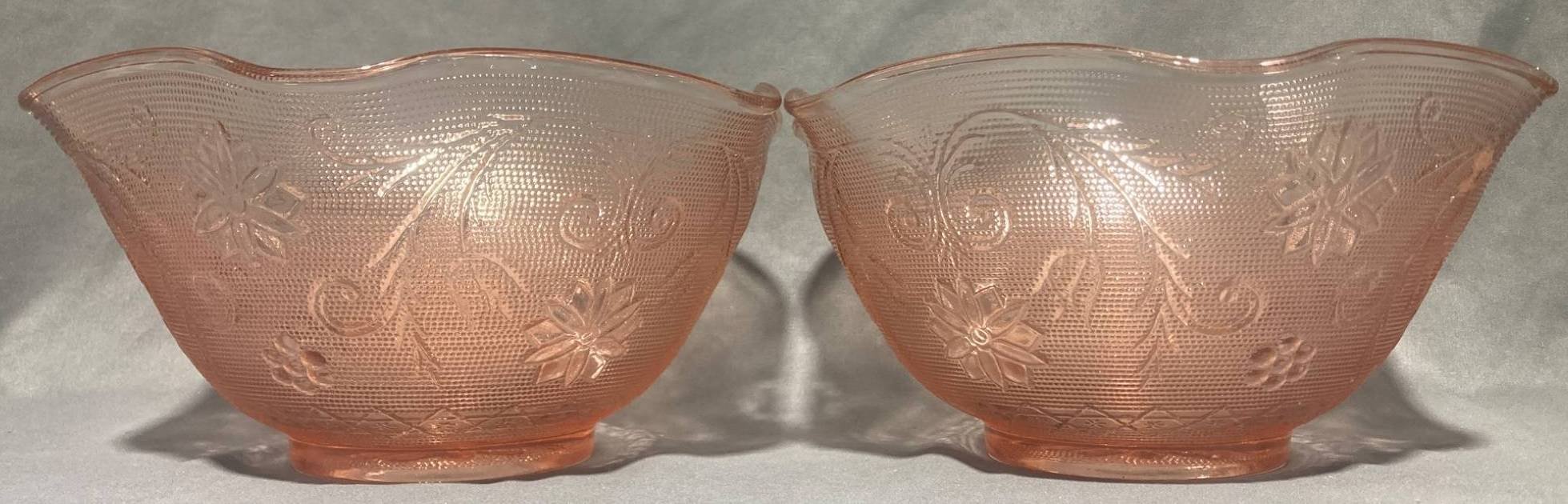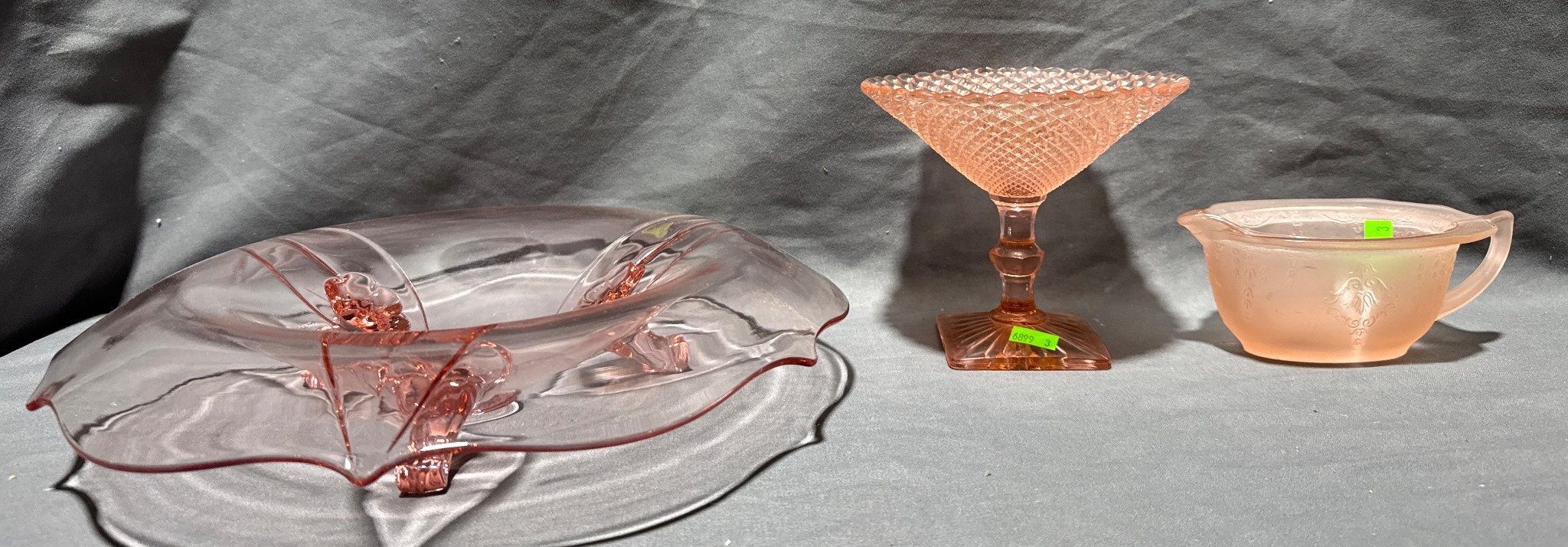 6088 Pink Depression Glass Dishware with Nursery Rhyme Motifs