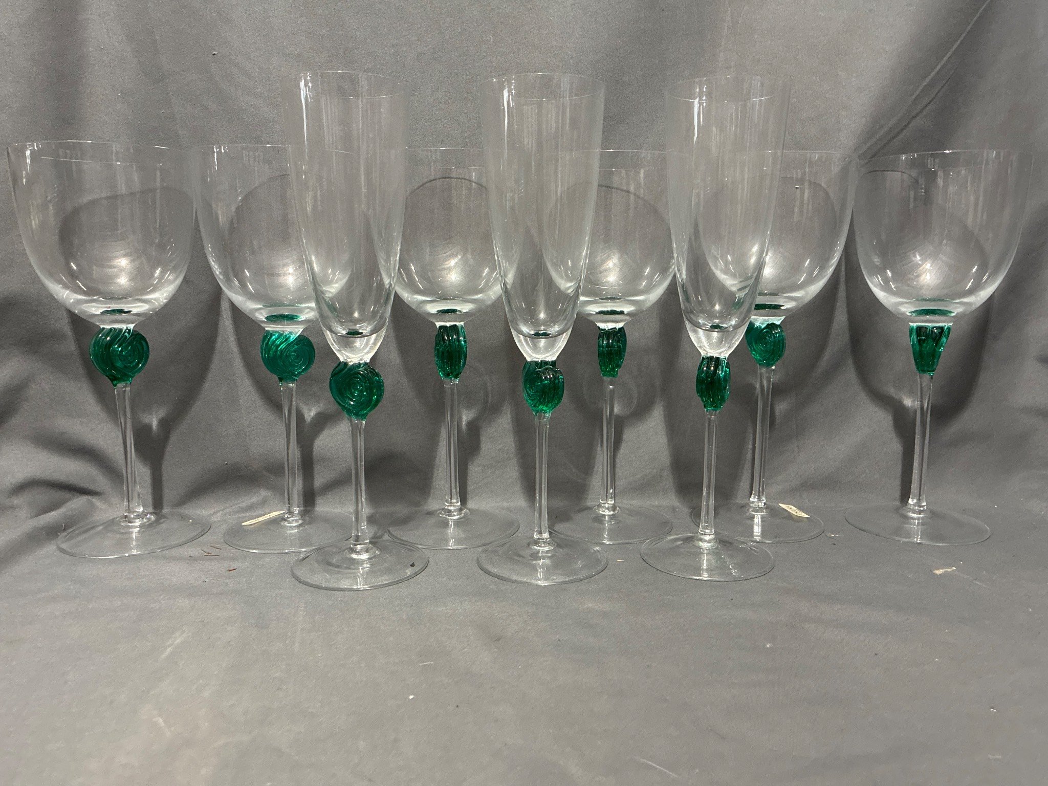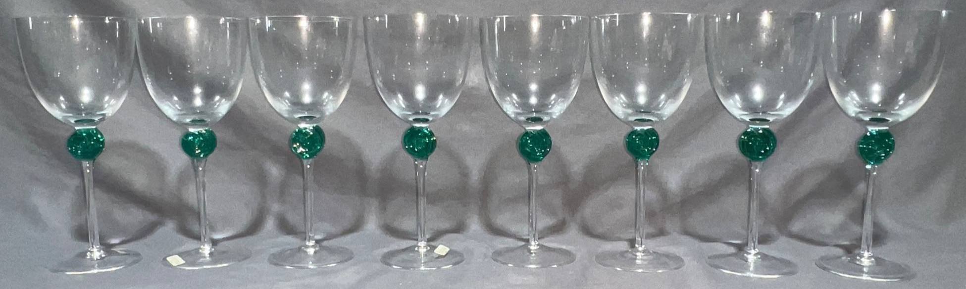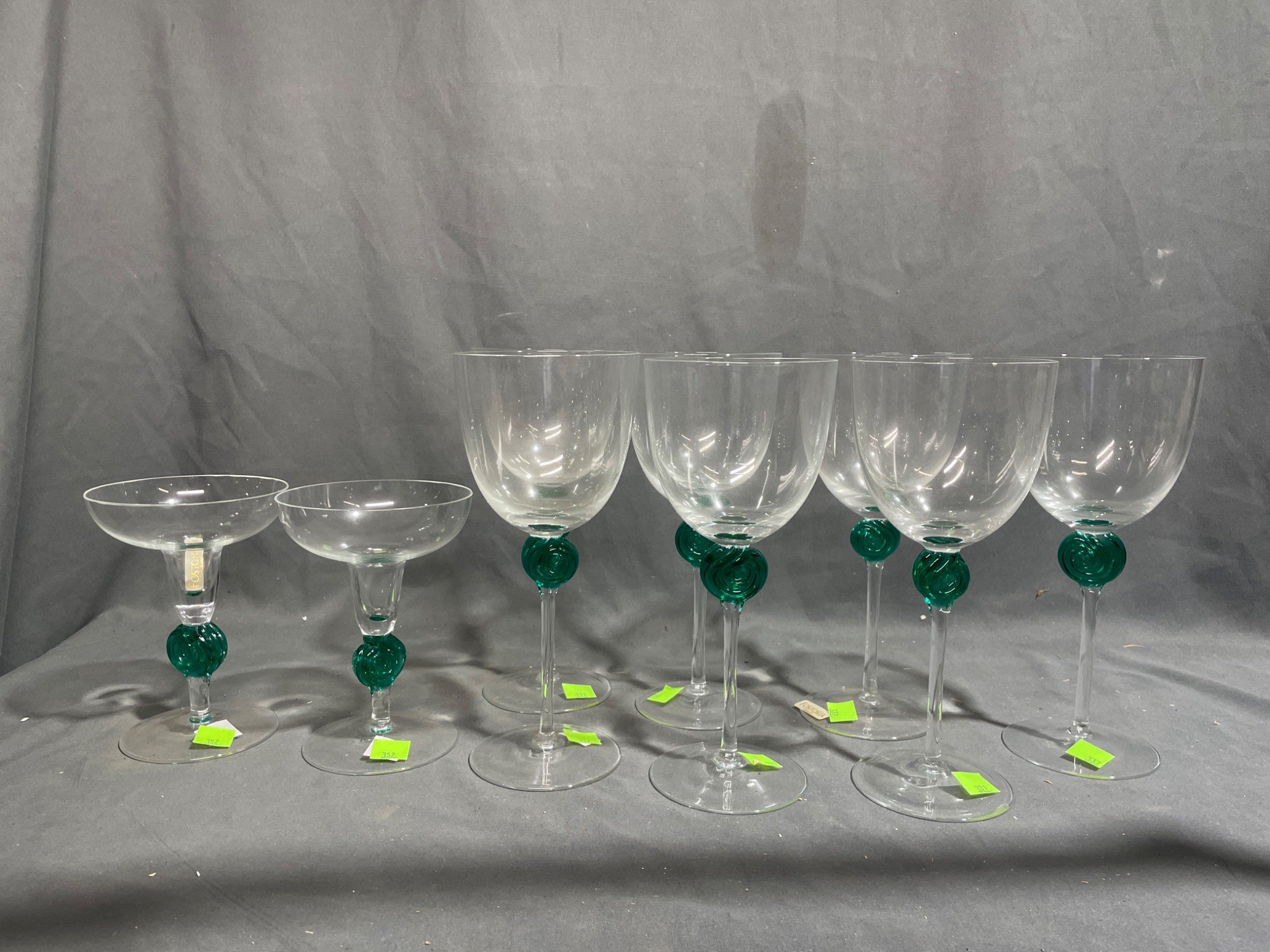 6063 8 Blue Stemmed Glasses with Green Bases by Colony, Made in Slovakia 3”x8”