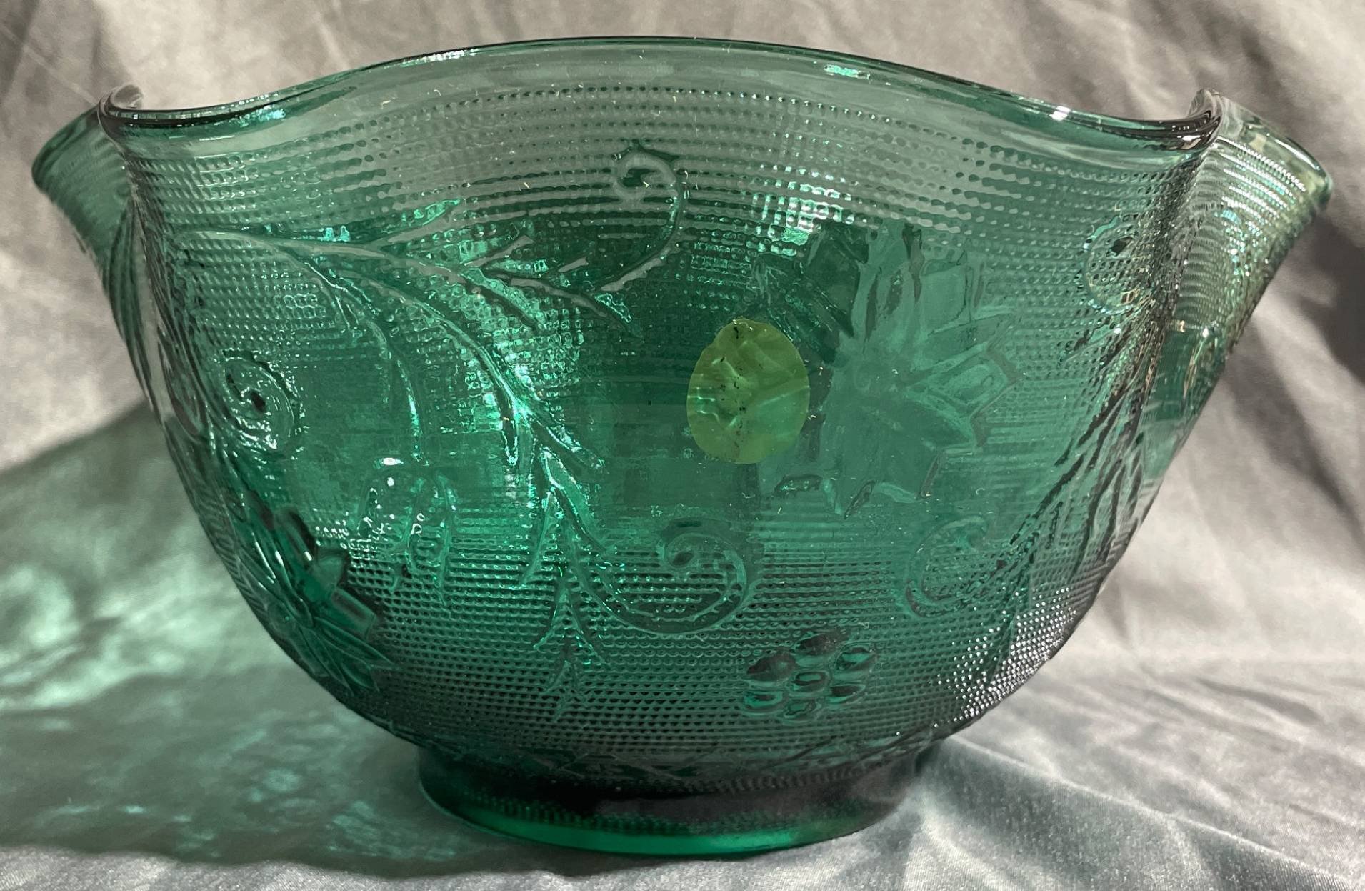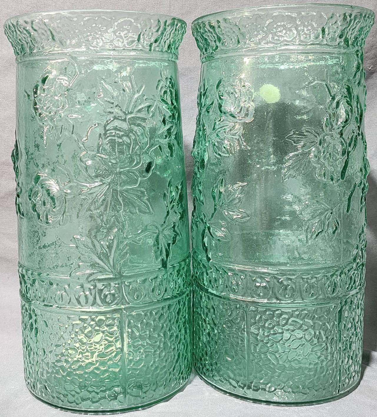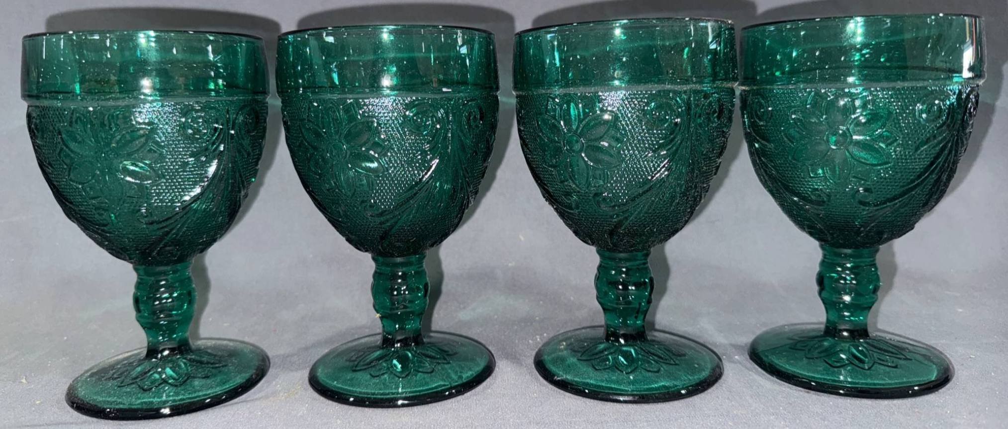 6086 12 Tiara Spruce Green Pressed Glass Teal Cups with Floral and Scrollwork Pattern, 4”x3”
