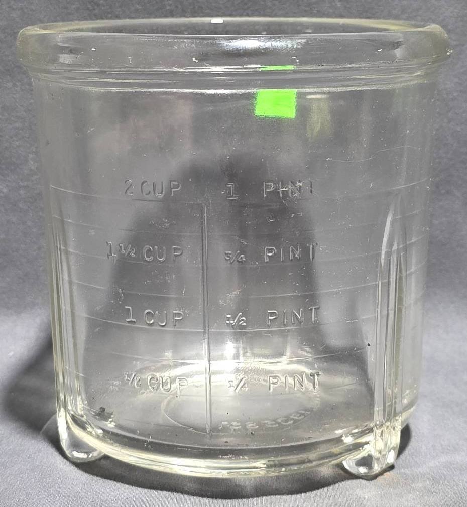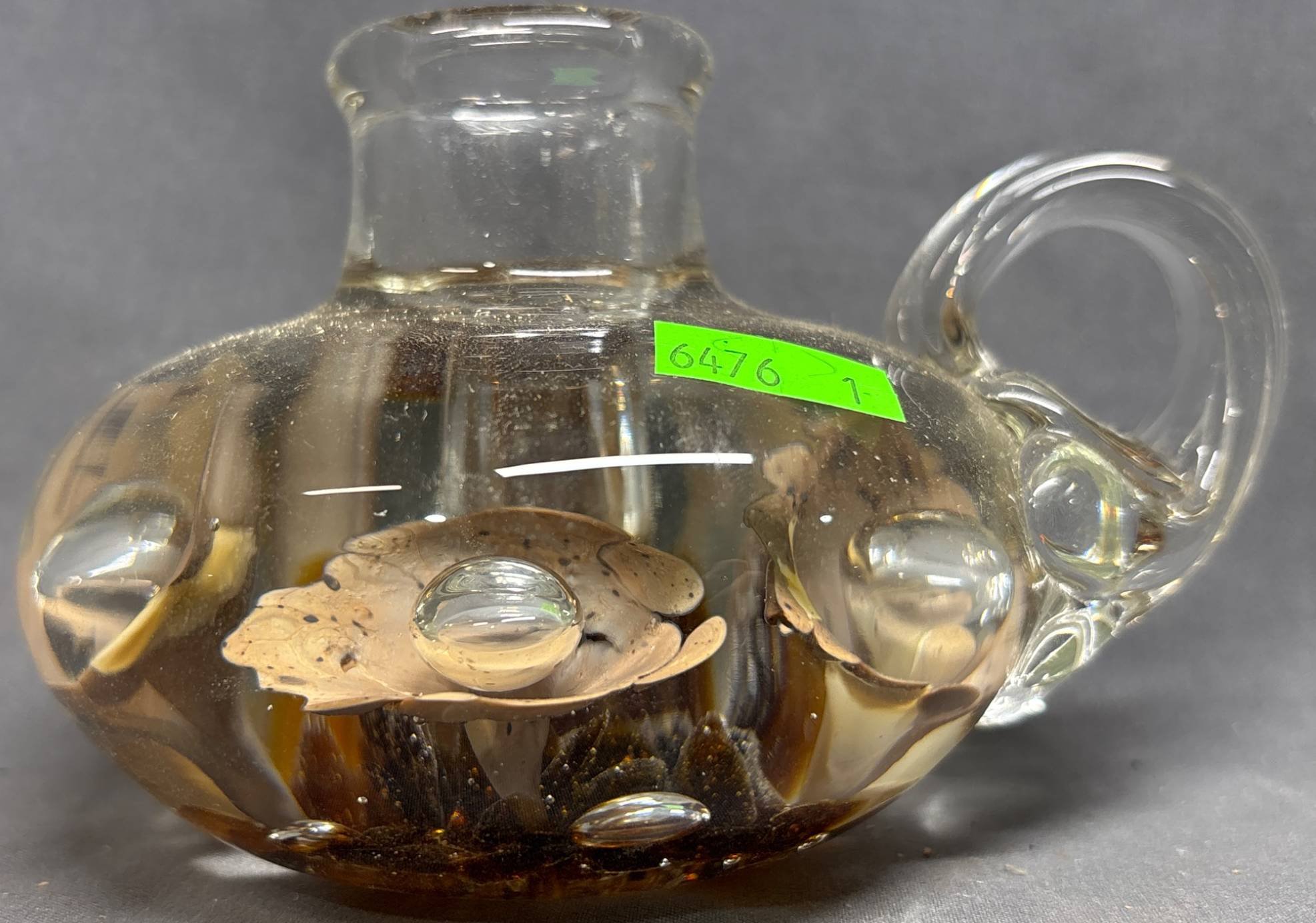 6079 Vintage Fostoria Hungary Clear Glass Pitcher with Green Handle 4”x10”.