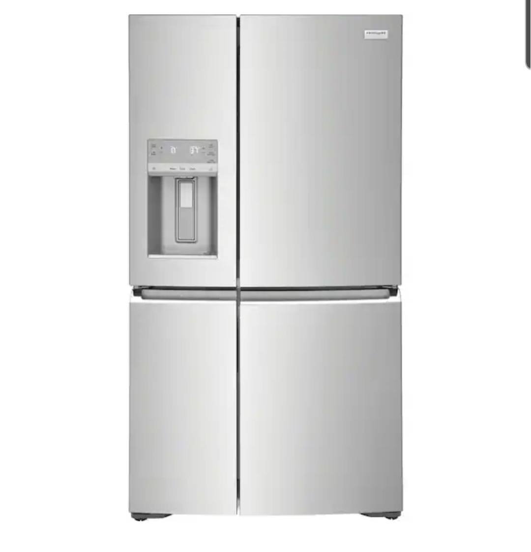10 New Frigidaire Gallery 36 in. 22 cu. ft. Counter-Depth 4-Door Refrigerator in Smudge-Proof Stainless Steel Model # GRQC2255BF03 has a small ding on front