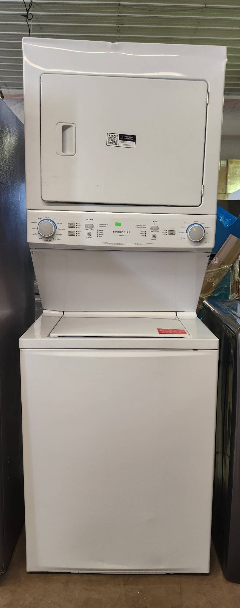 11 New Frigidaire 3.9 cu. ft. Washer and 5.5 cu. ft. Electric Dryer Combo in White with Quick Wash & Dry Cycle and MaxFill Wash Cycle FLCE752AW4 has small dent on top and scuffing