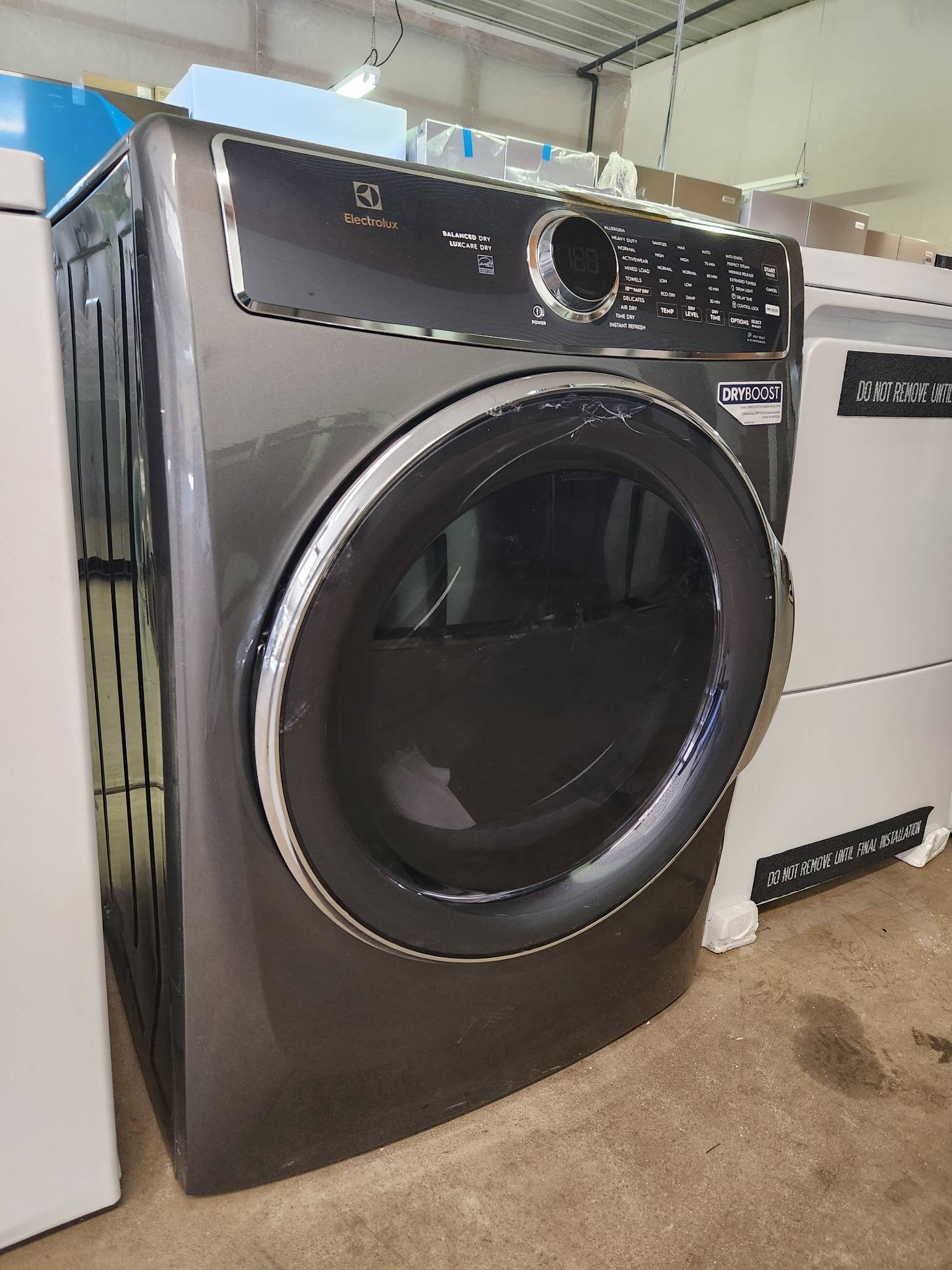 12 New Electrolux Extra Large Stackable Steam Cycle gas Dryer model # ELFE7637AT1 is dented on the side panel