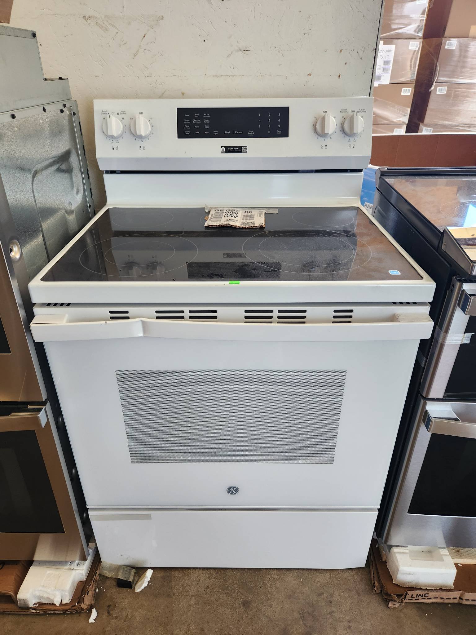 19 New GE 30in. 5Burner Element Smart Free-Standing Electric Convection Range in White w/ EasyWash Oven Tray, No-Preheat Air Fry model # GEGRF600AVWW handle is bent