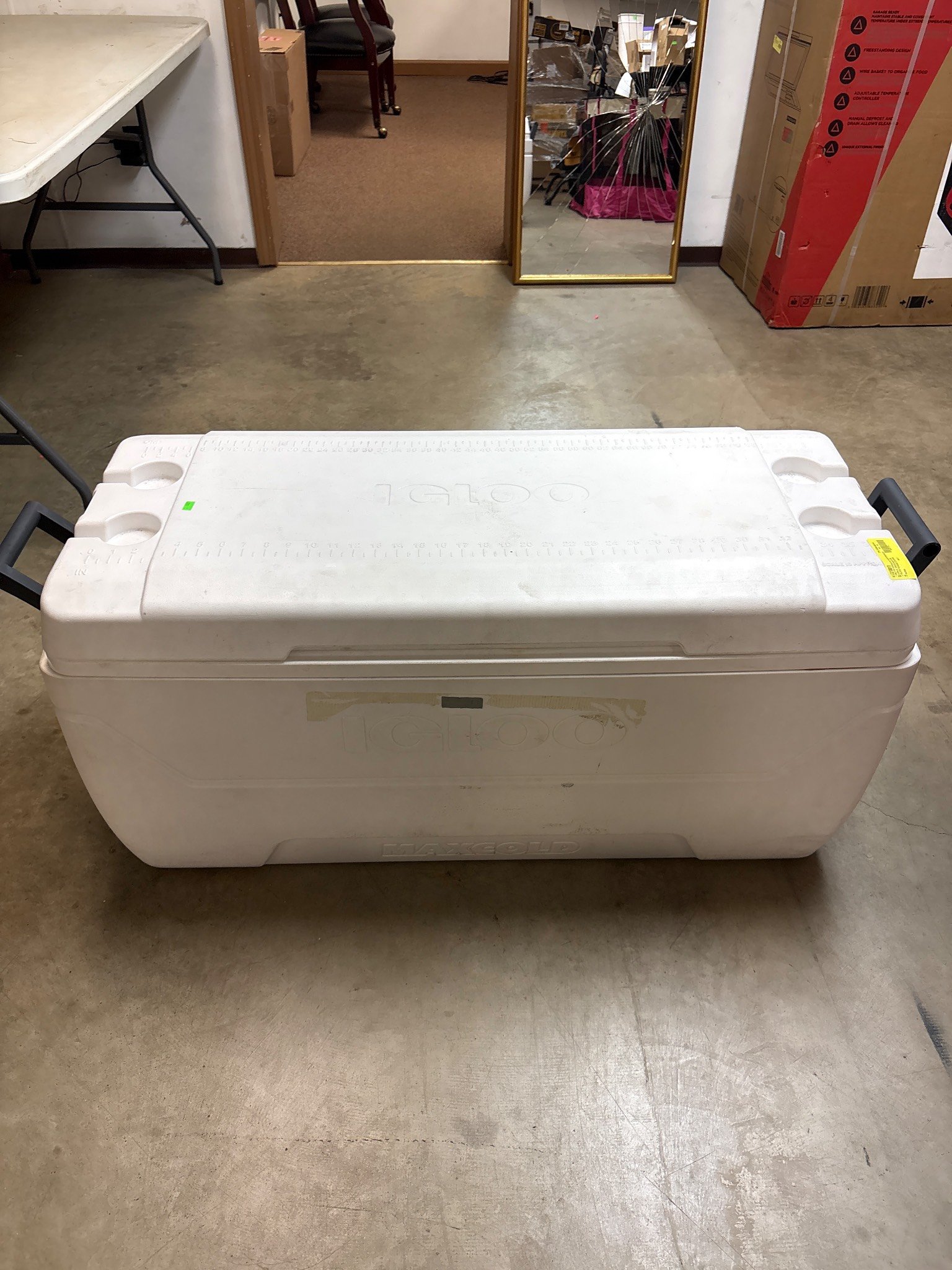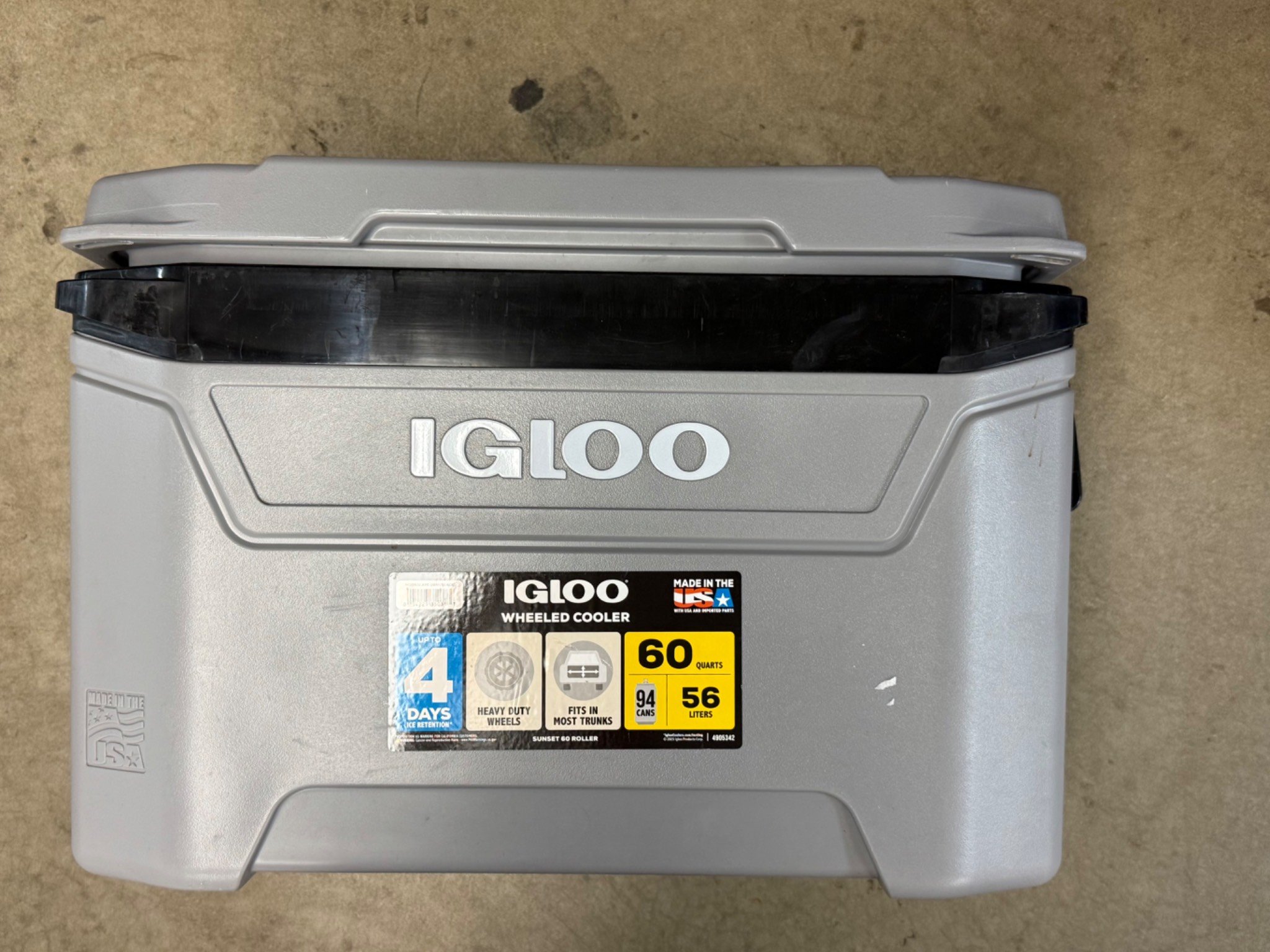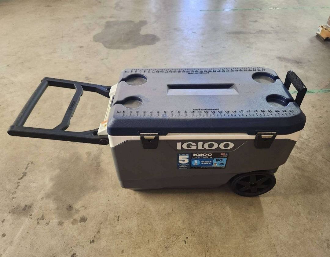 80 Igloo 90 Quart Hard Insulated Wheeled Cooler with Retractable Handle one wheel is cracked