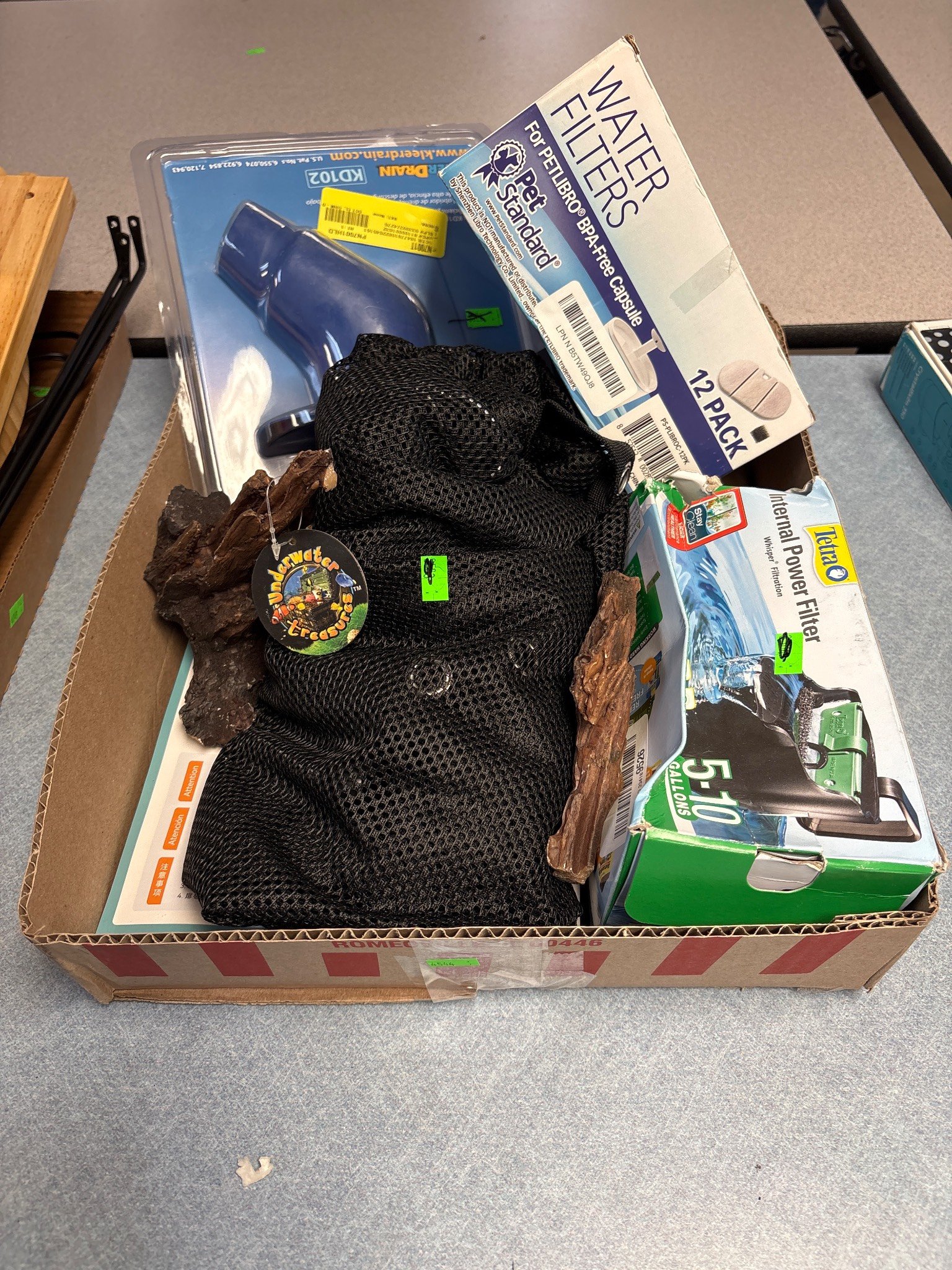 4544 Aquarium Supplies Lot with Filters, Kleer Drain Tool, and Rocks