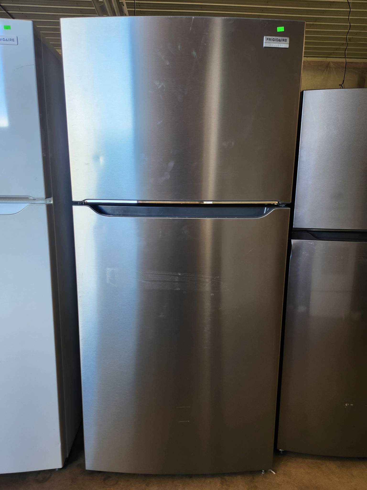 9 New Frigidaire 27.6 in. 14 cu. ft. Top Freezer Refrigerator in Fingerprint-Resistant Stainless Look model # FFHT1425VV05 has minor dings and scuffing