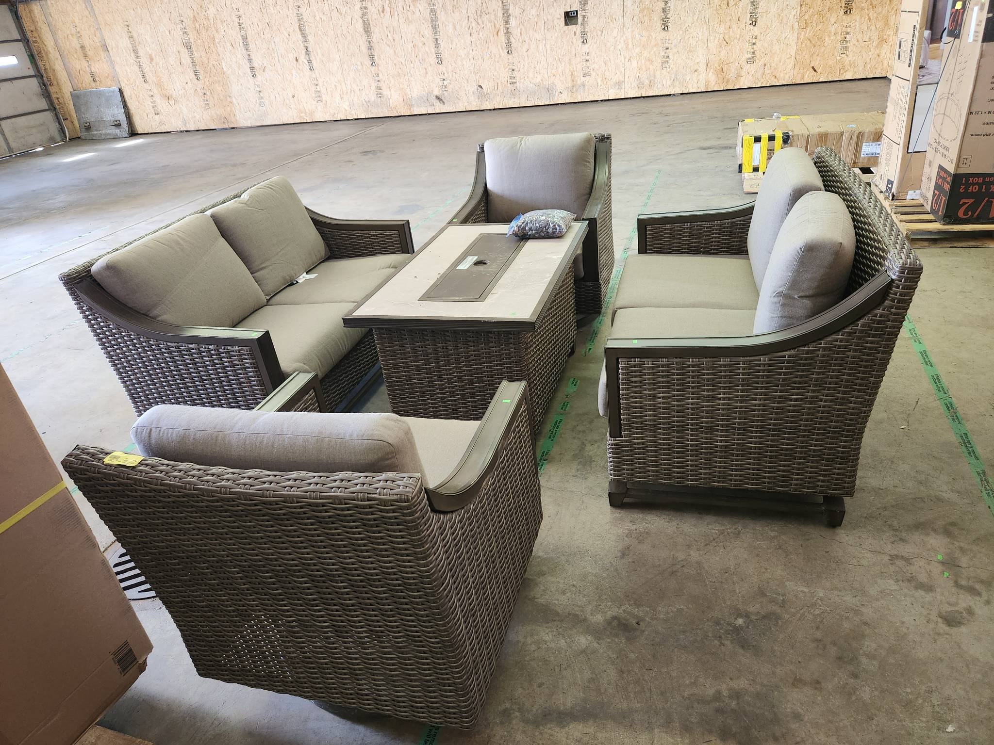94 5 pc outdoor furniture set includes 2 loveseats one has bent leg 2 swivel chairs and fire table