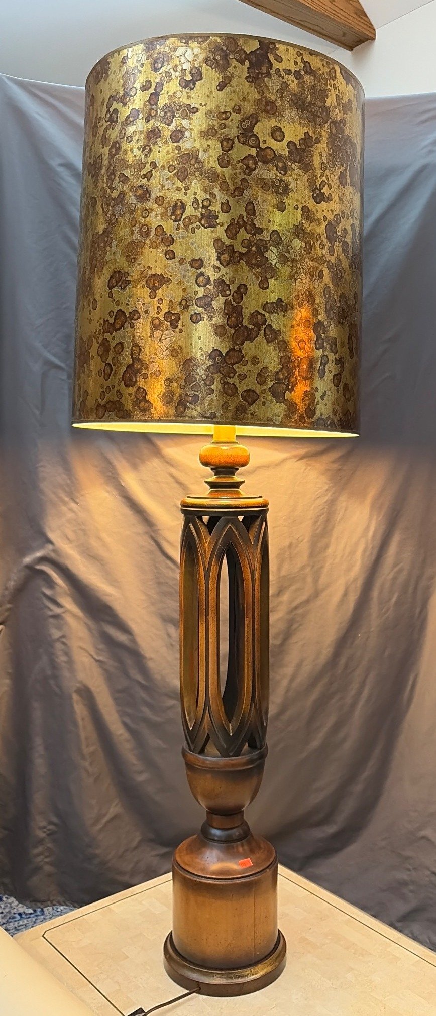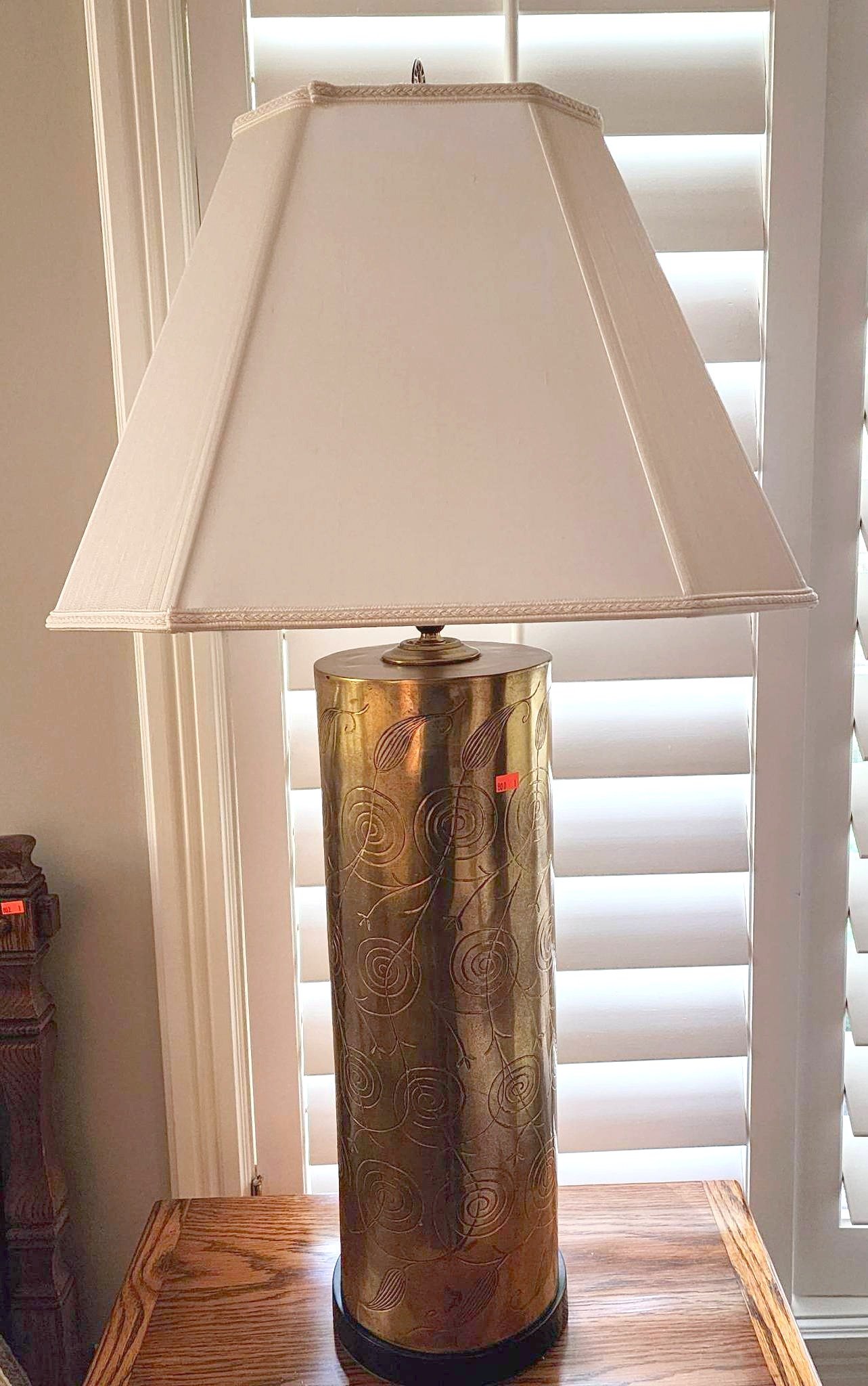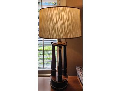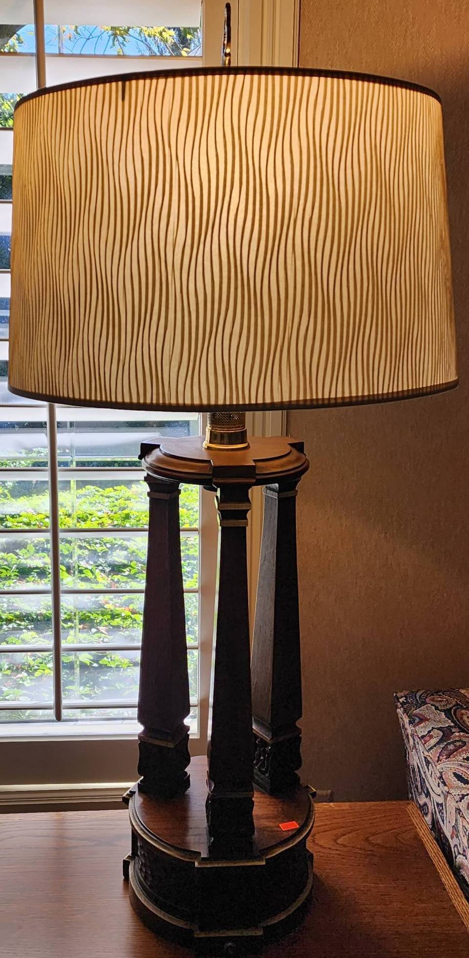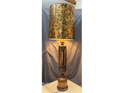 110 Tall Table Lamp with Cylindrical Shade and Wood Carved Base, 54”H