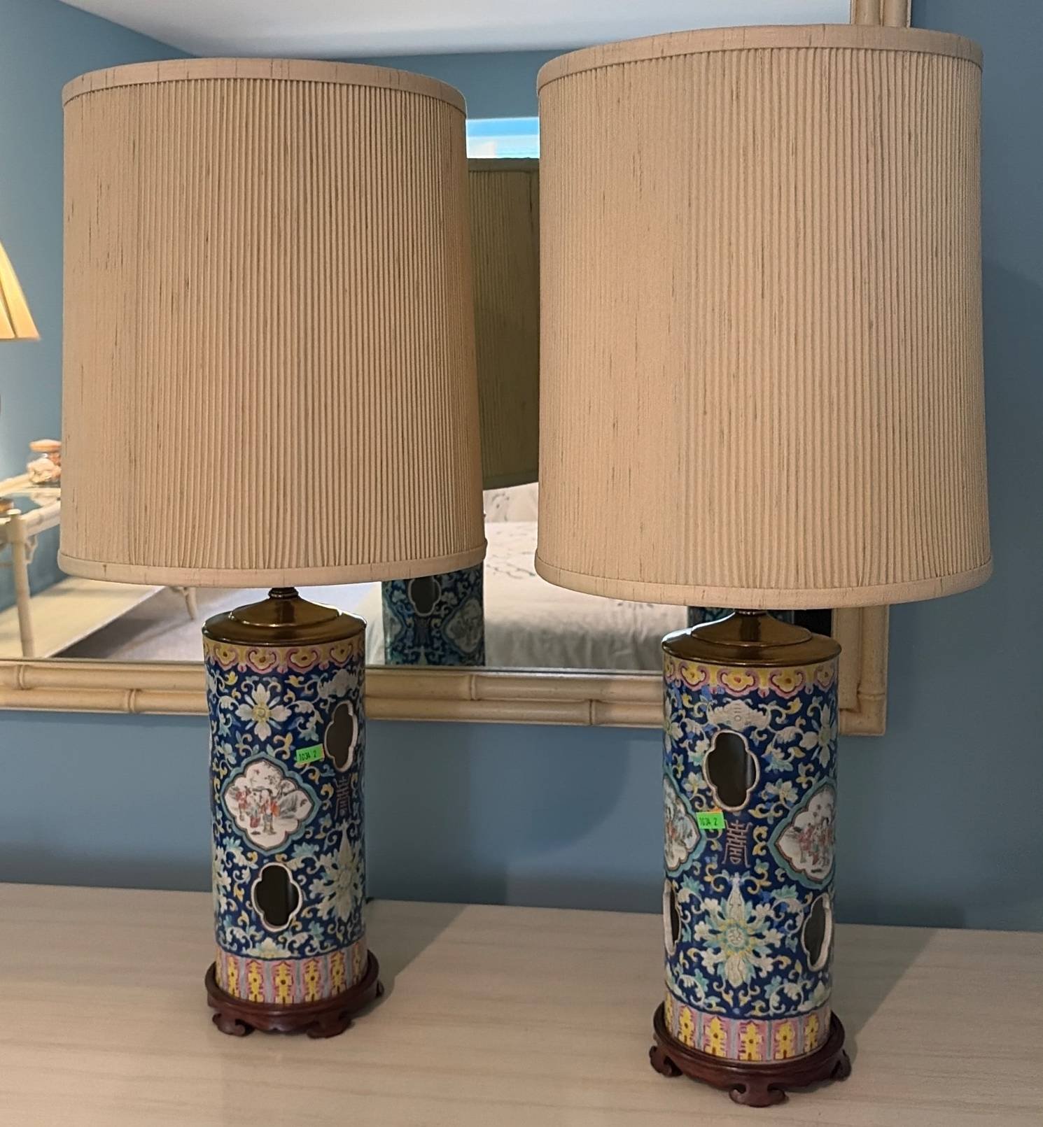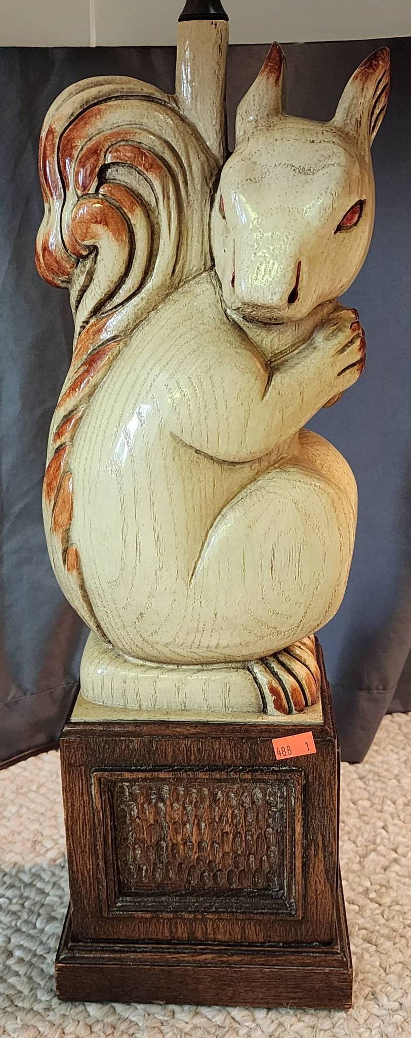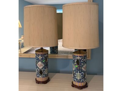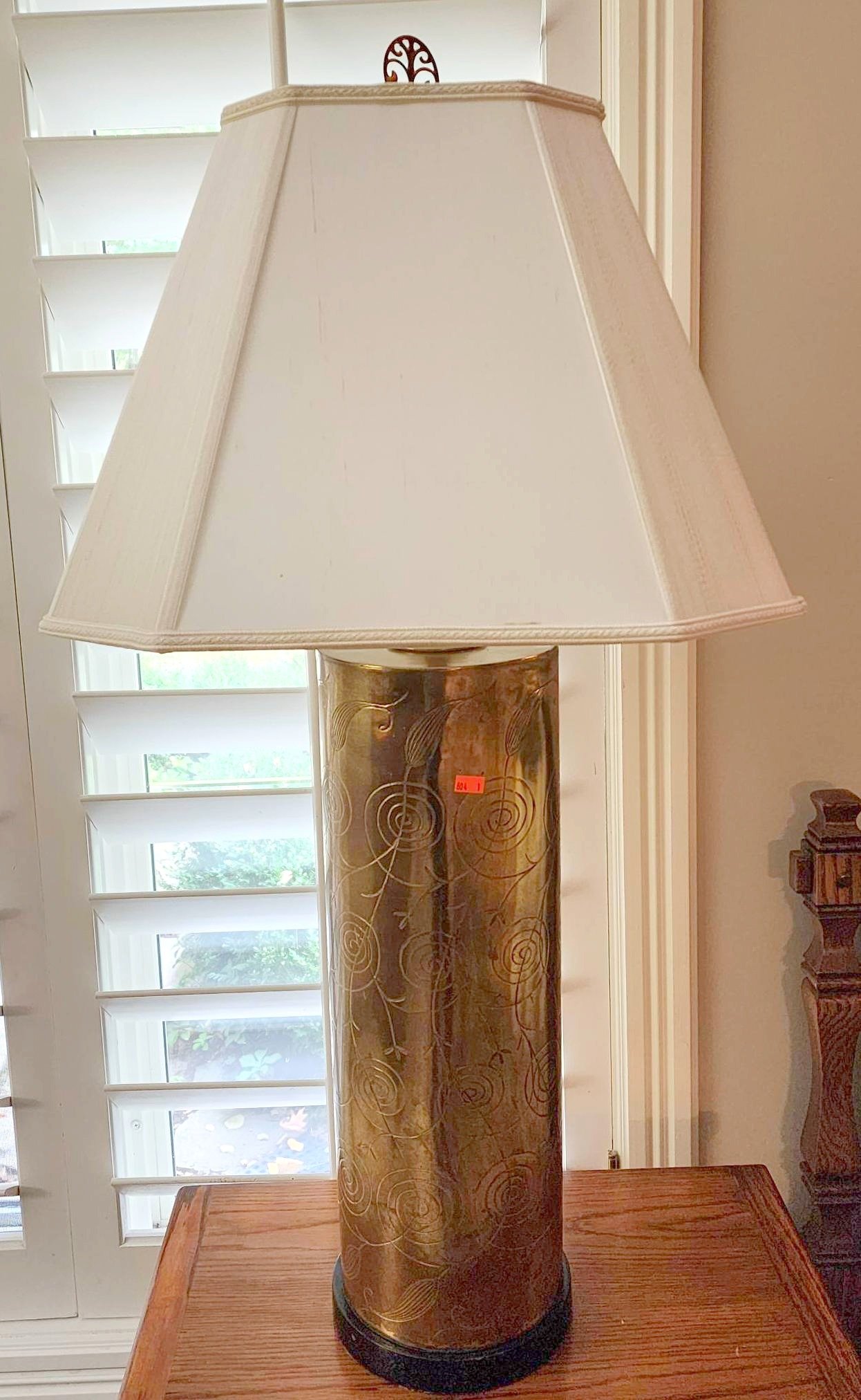 110 Tall Table Lamp with Cylindrical Shade and Wood Carved Base, 54”H
