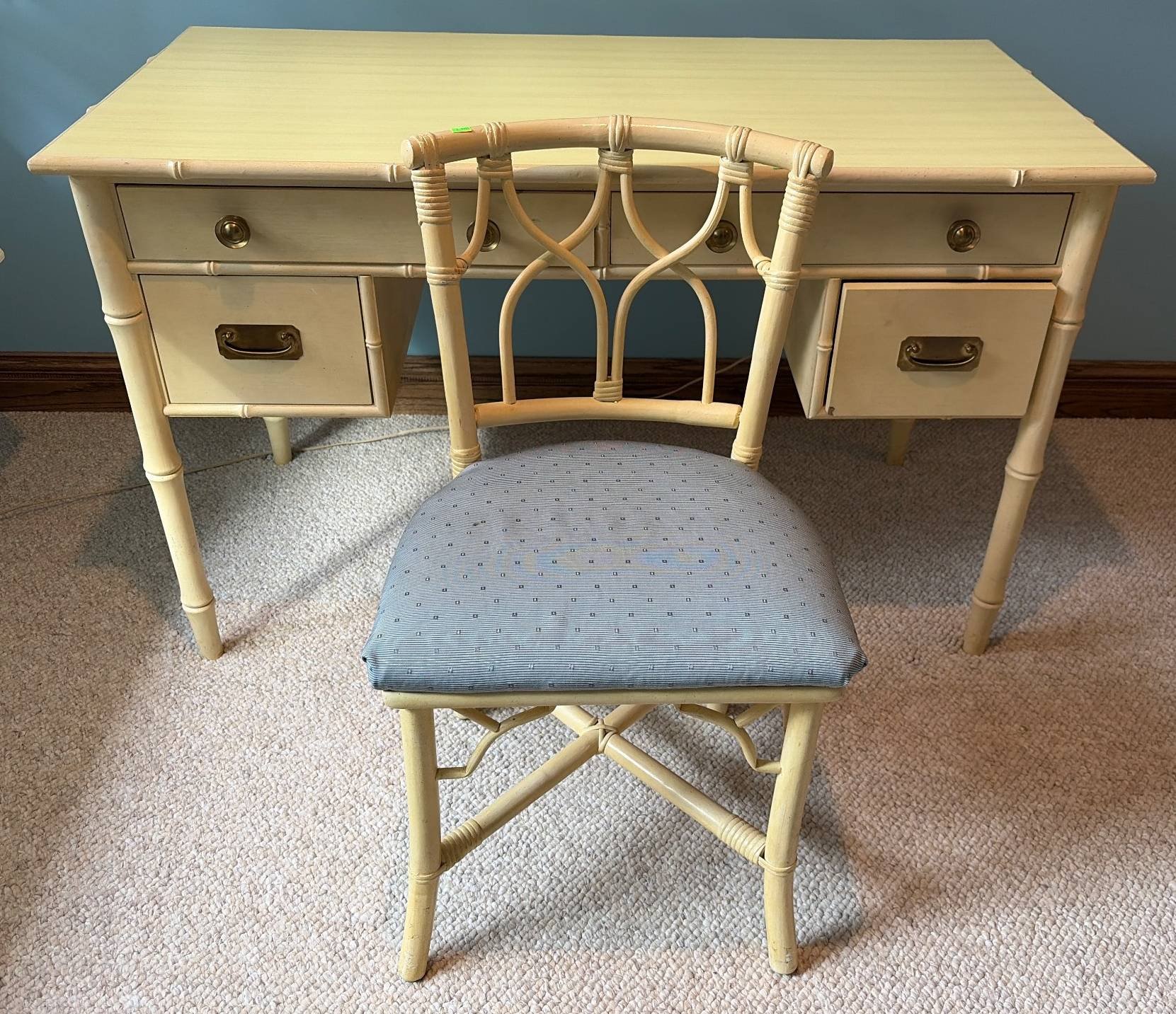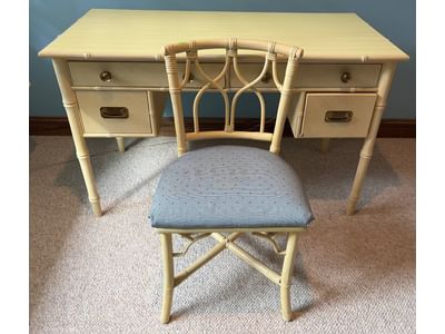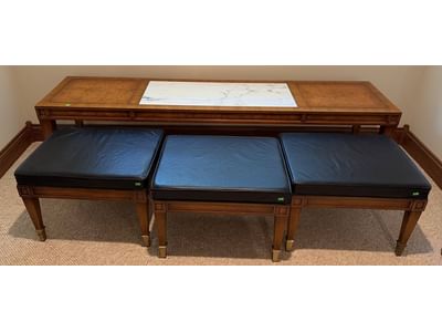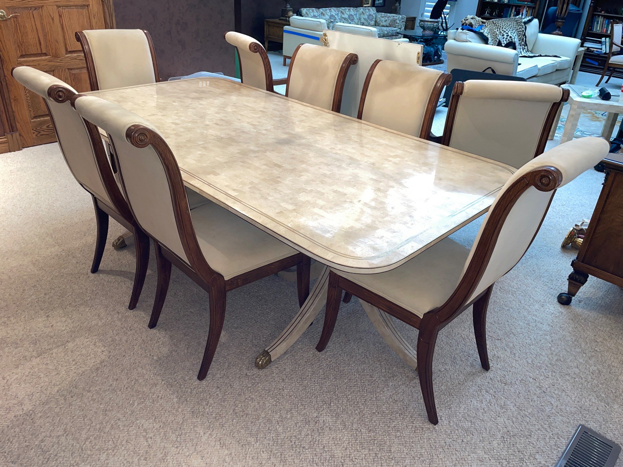 185 Henredon Dining Table with Extensions and 8 Upholstered Chairs, Table-84.5”Lx42.5”Wx28.5”H and Chairs-19”H(chip on table base)