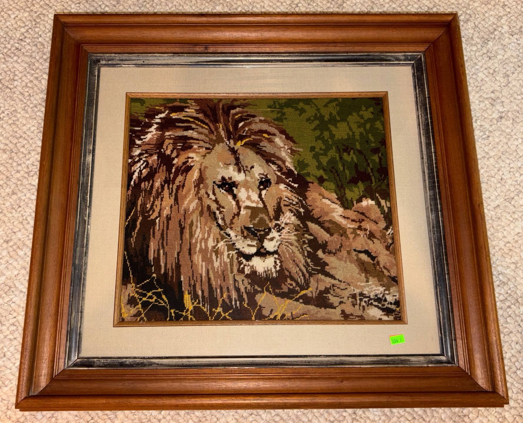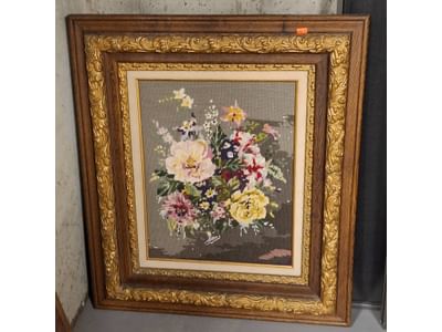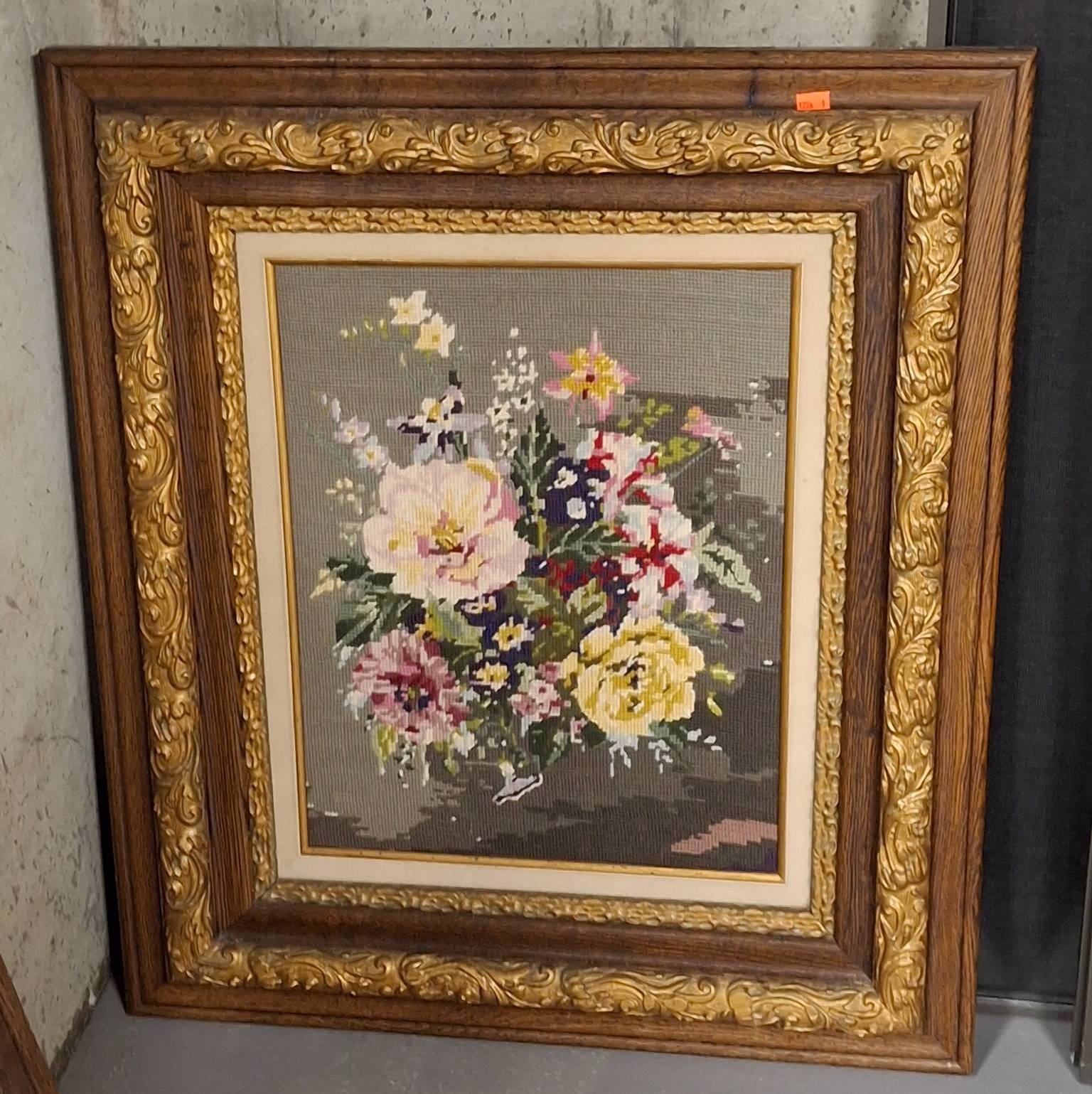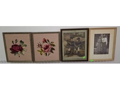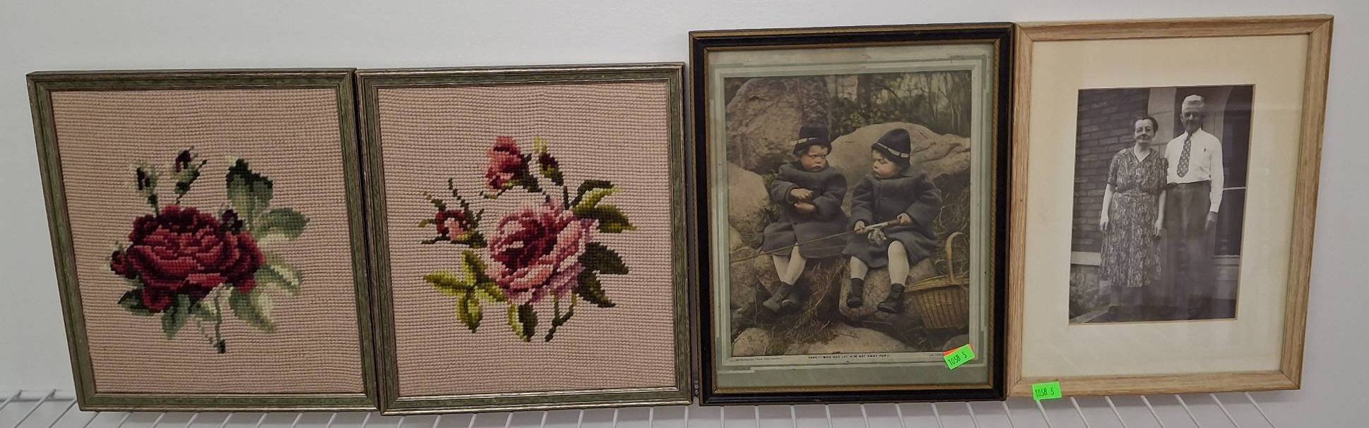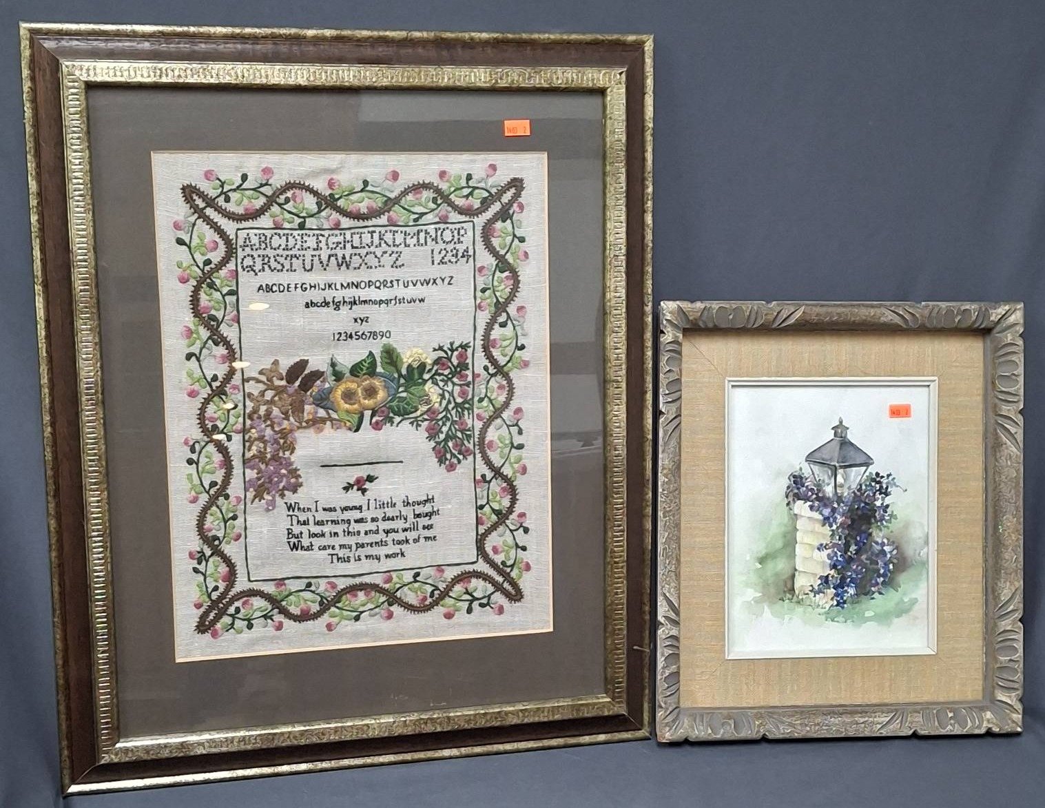 1403 Framed Needlepoint Sampler and Watercolor of Lamp Post with Floral Motif 13?x15? & 19?x23?