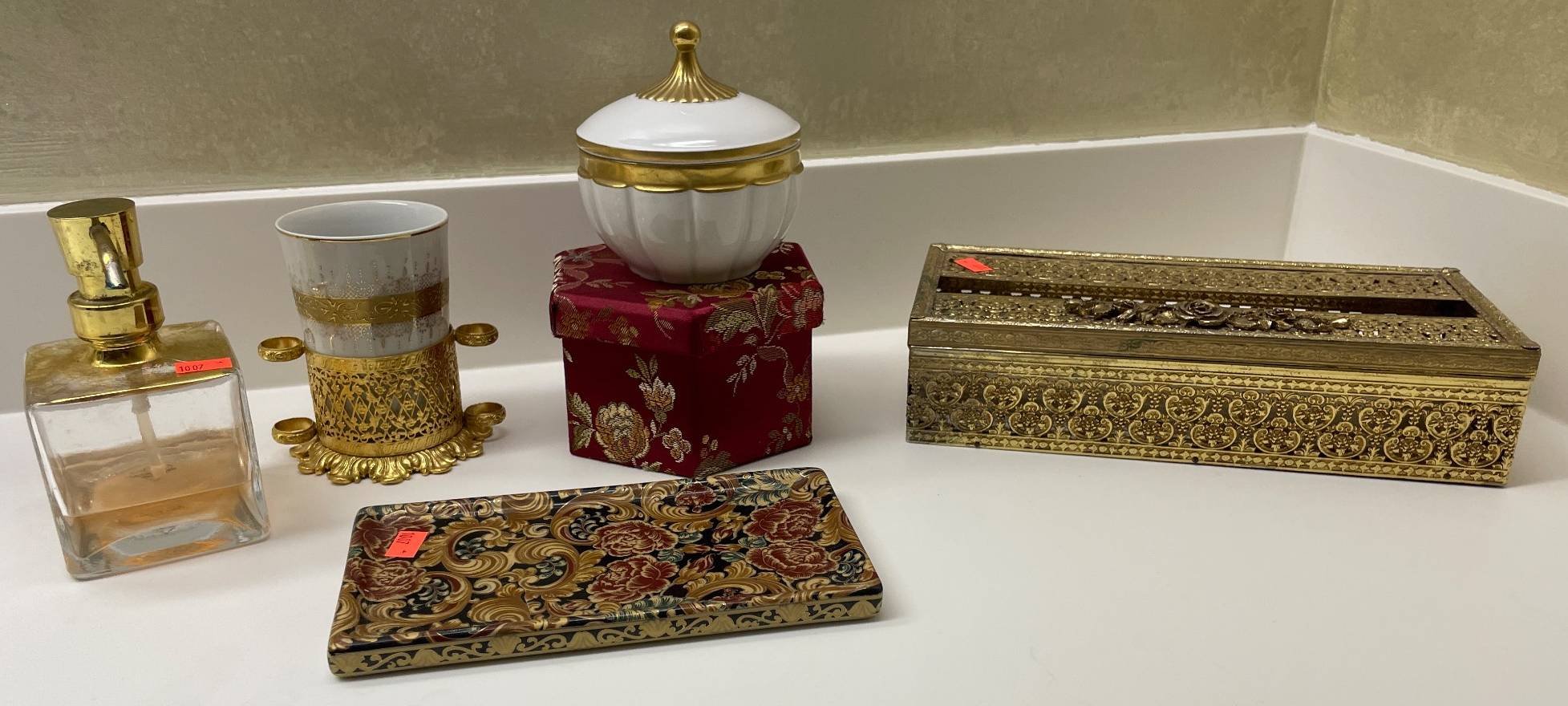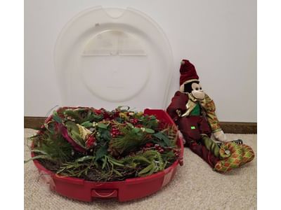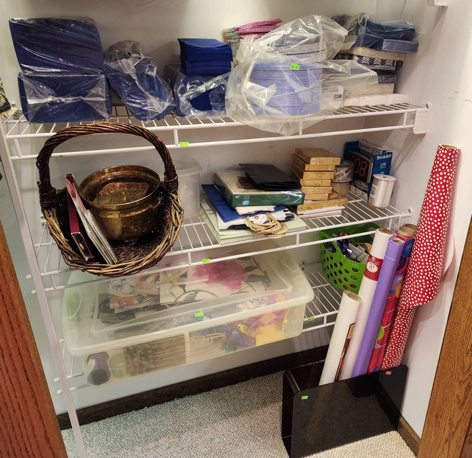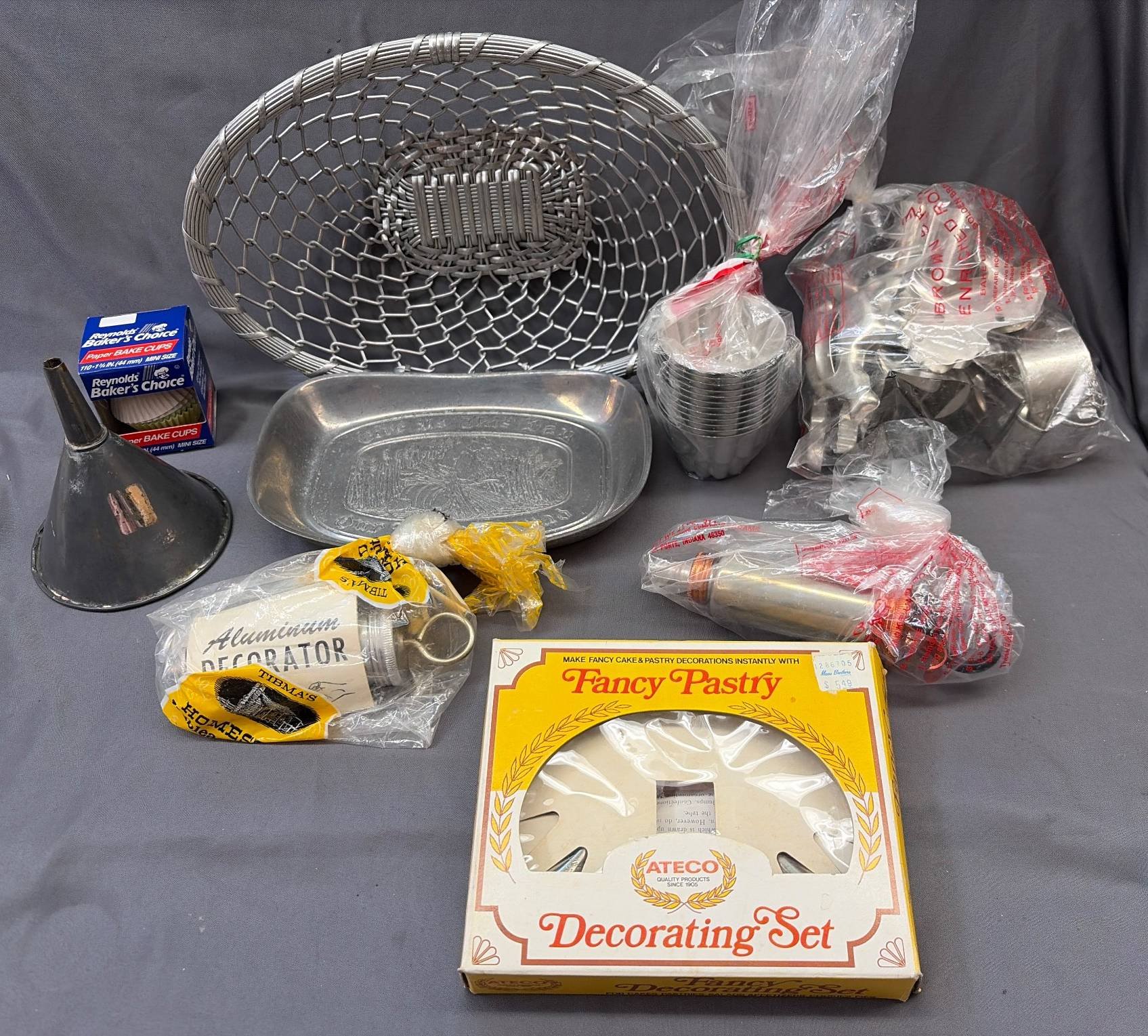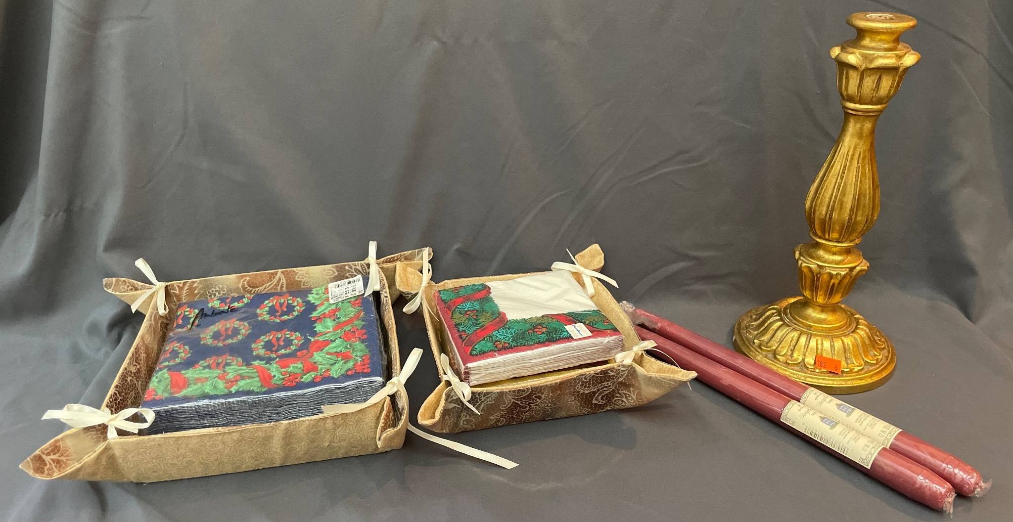 182 Gold-Toned Candlestick, Fabric Baskets, Holiday Napkins, and Hallmark Taper Candles 12?T