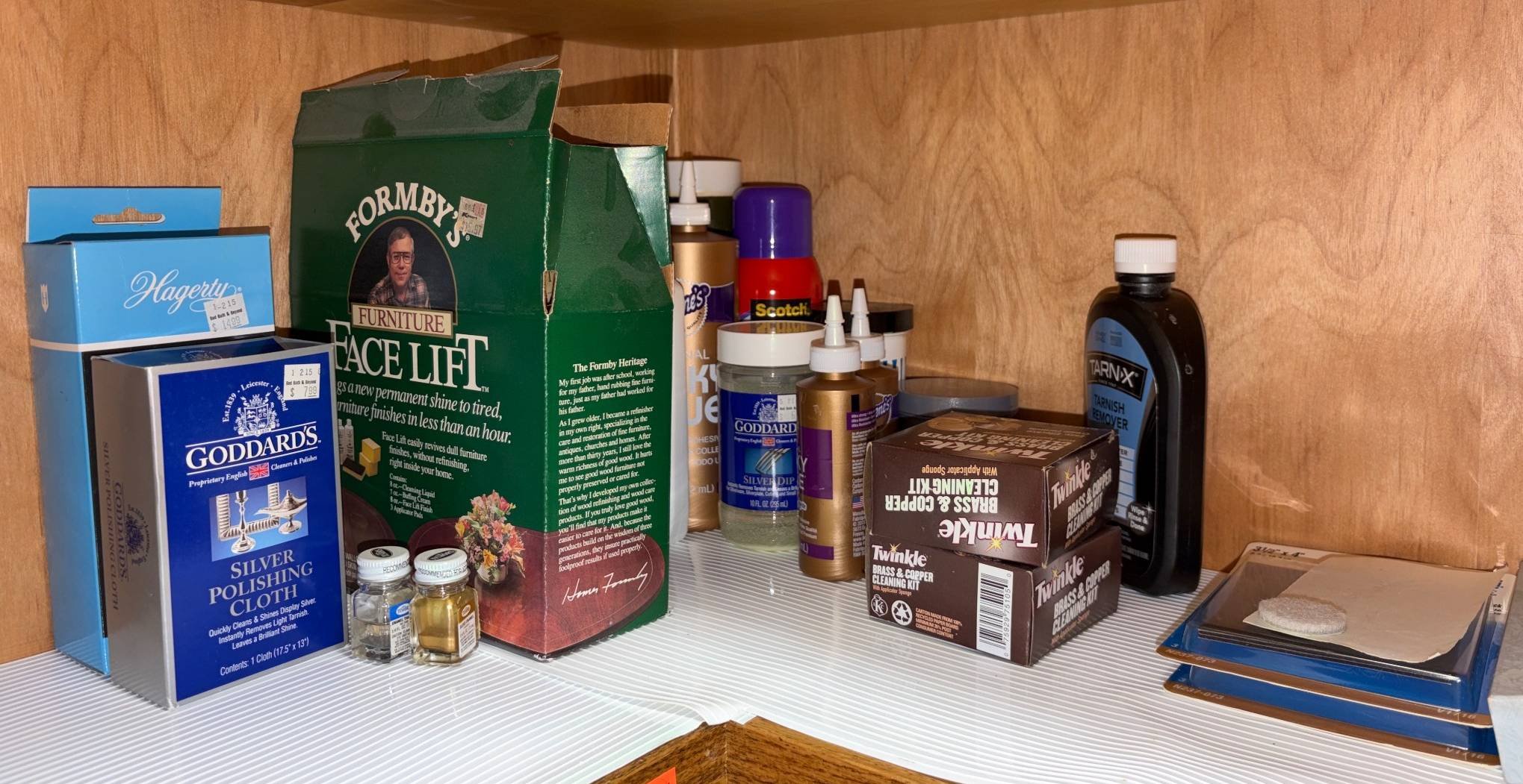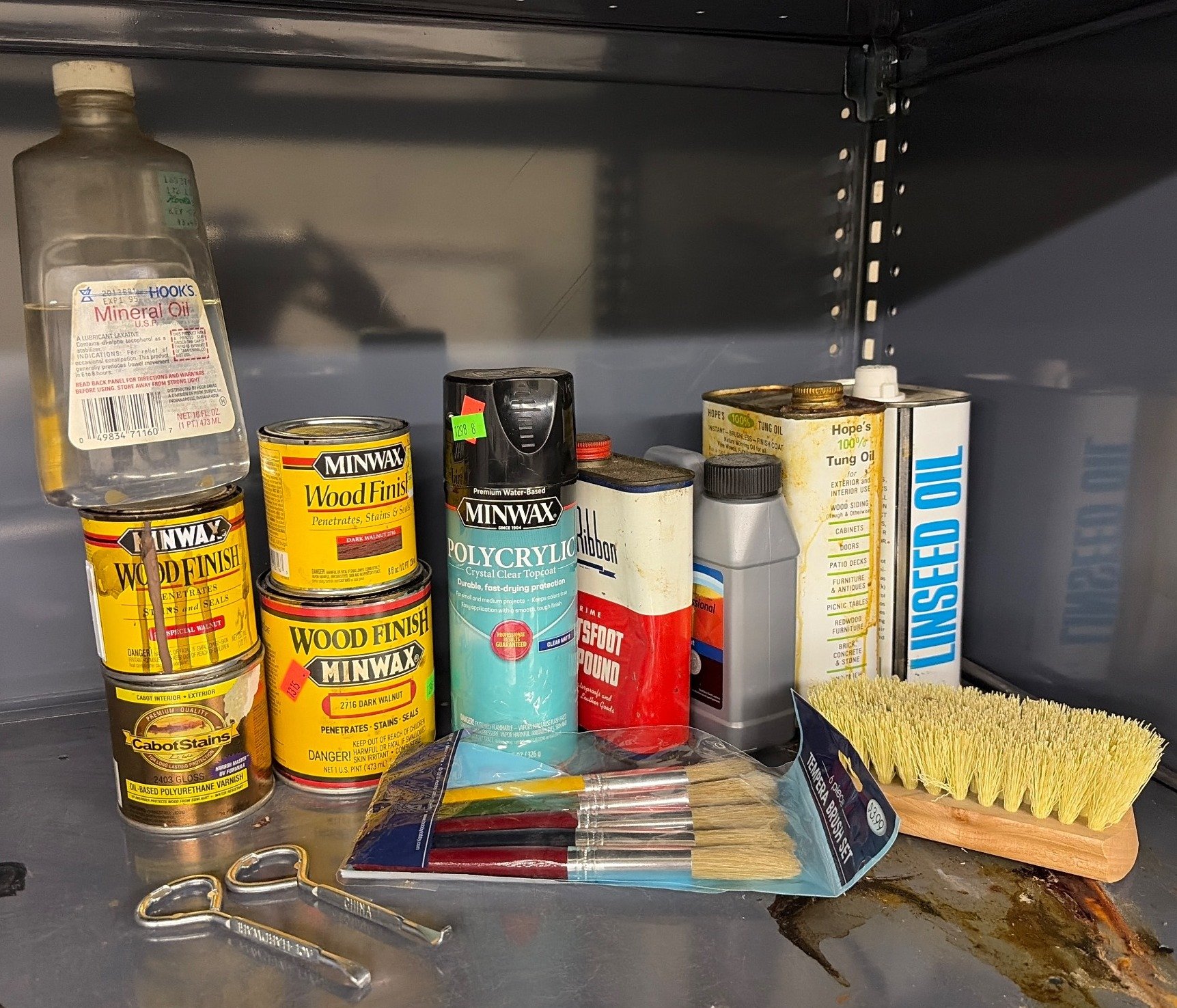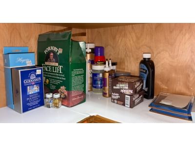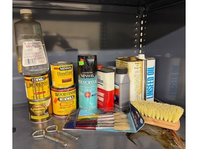 1298 Partially Full Containers of Wood Finishes, Oils, and Maintenance Supplies