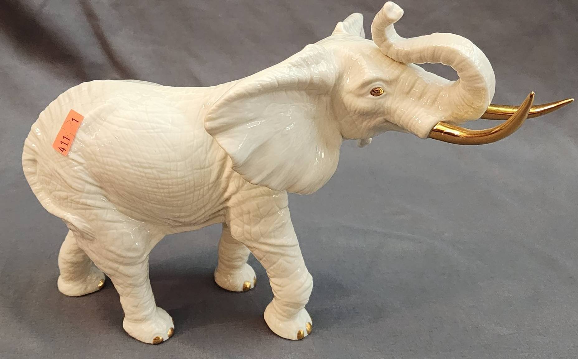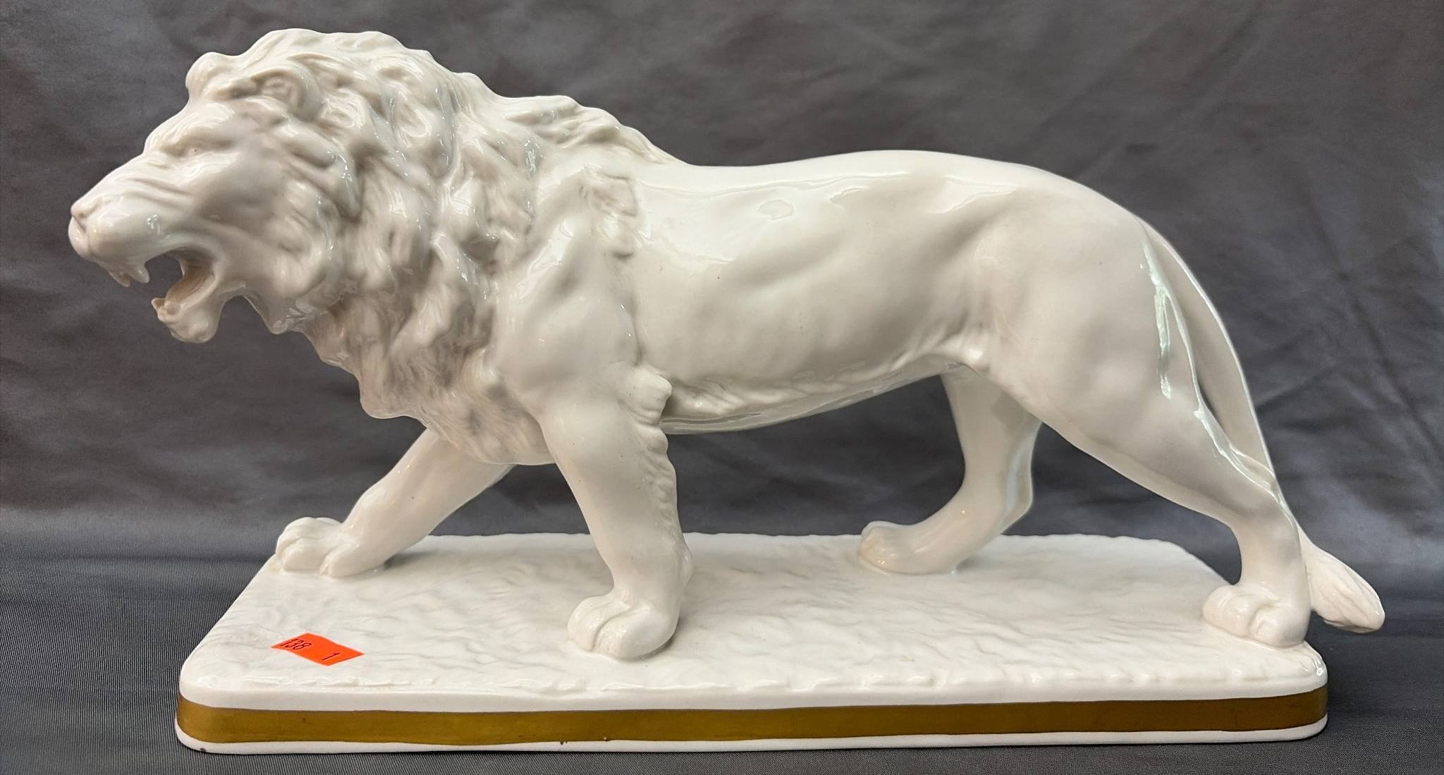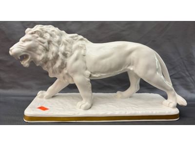 138 German-Made Porcelain Lion Figurine on Rectangular Base, Marked ‘173’ (12”x4”x7”)