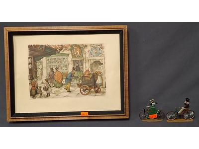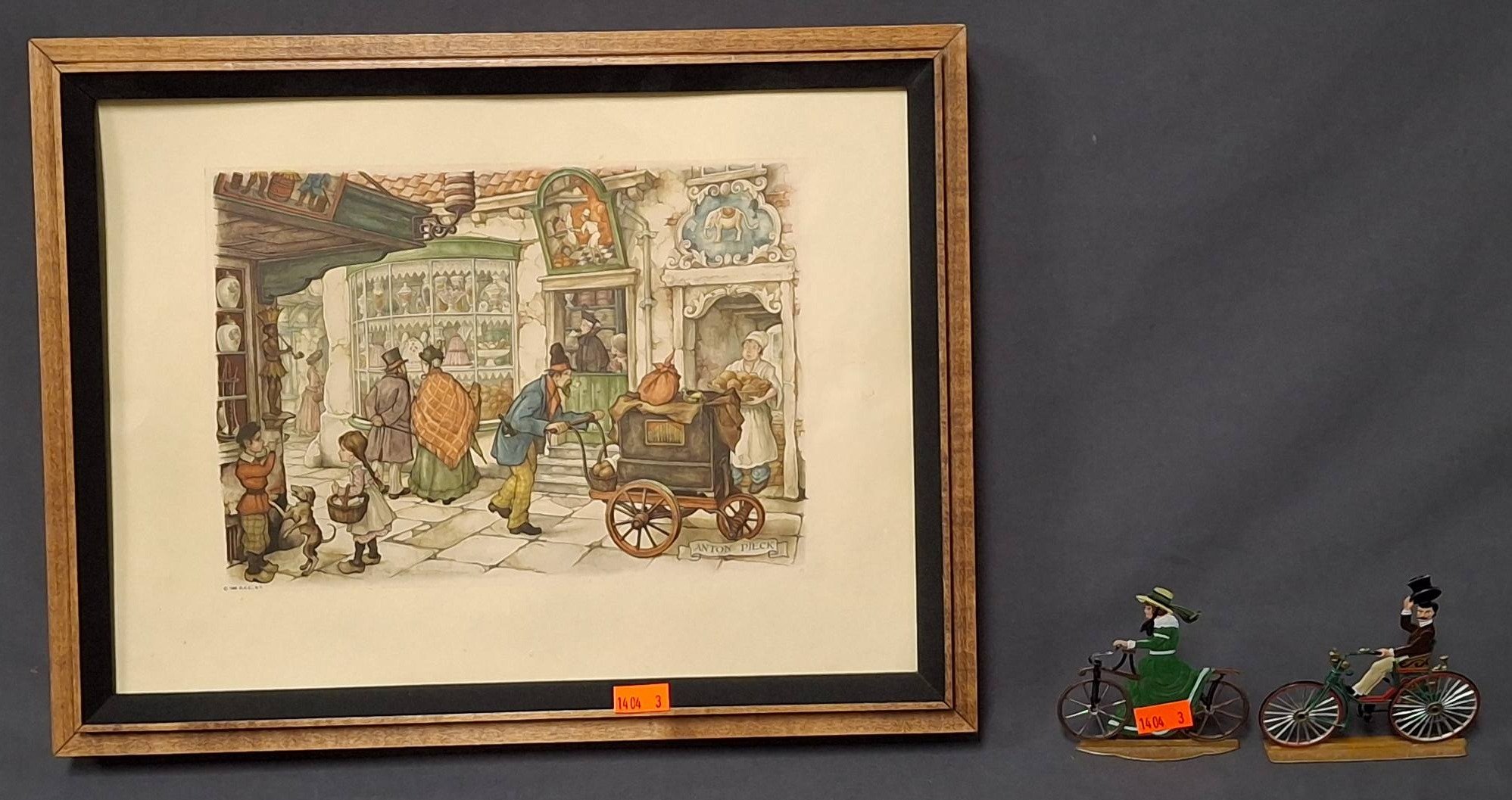 1404 Framed Anton Pieck Print and 2 – Die-Cast Bicycle Figures 3?-13?