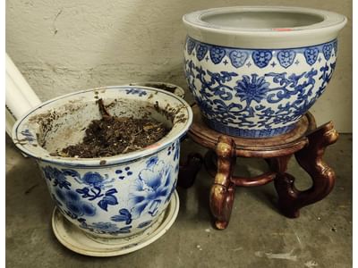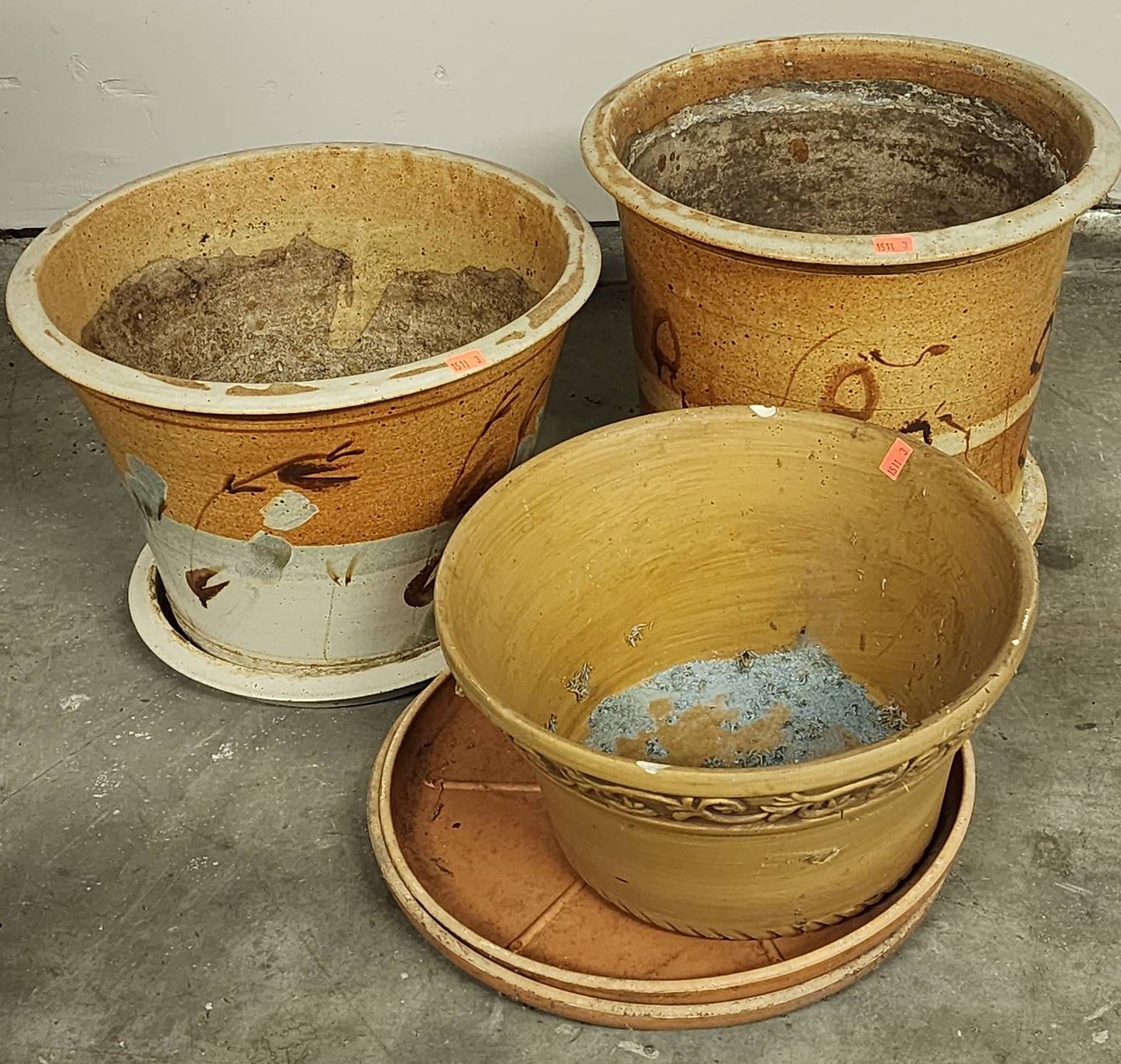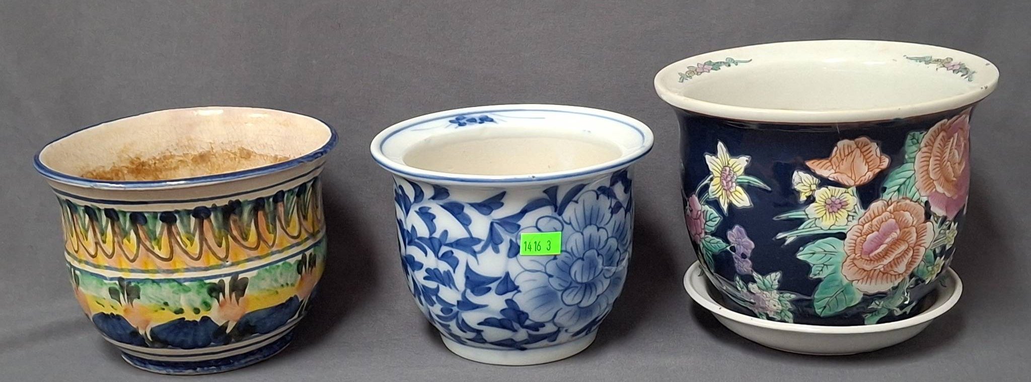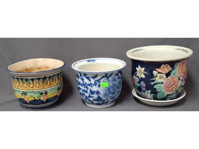 1416 3 – Planters with Floral and Geometric Designs 5?x6.5?-6.5?x5.5? (one has chip)