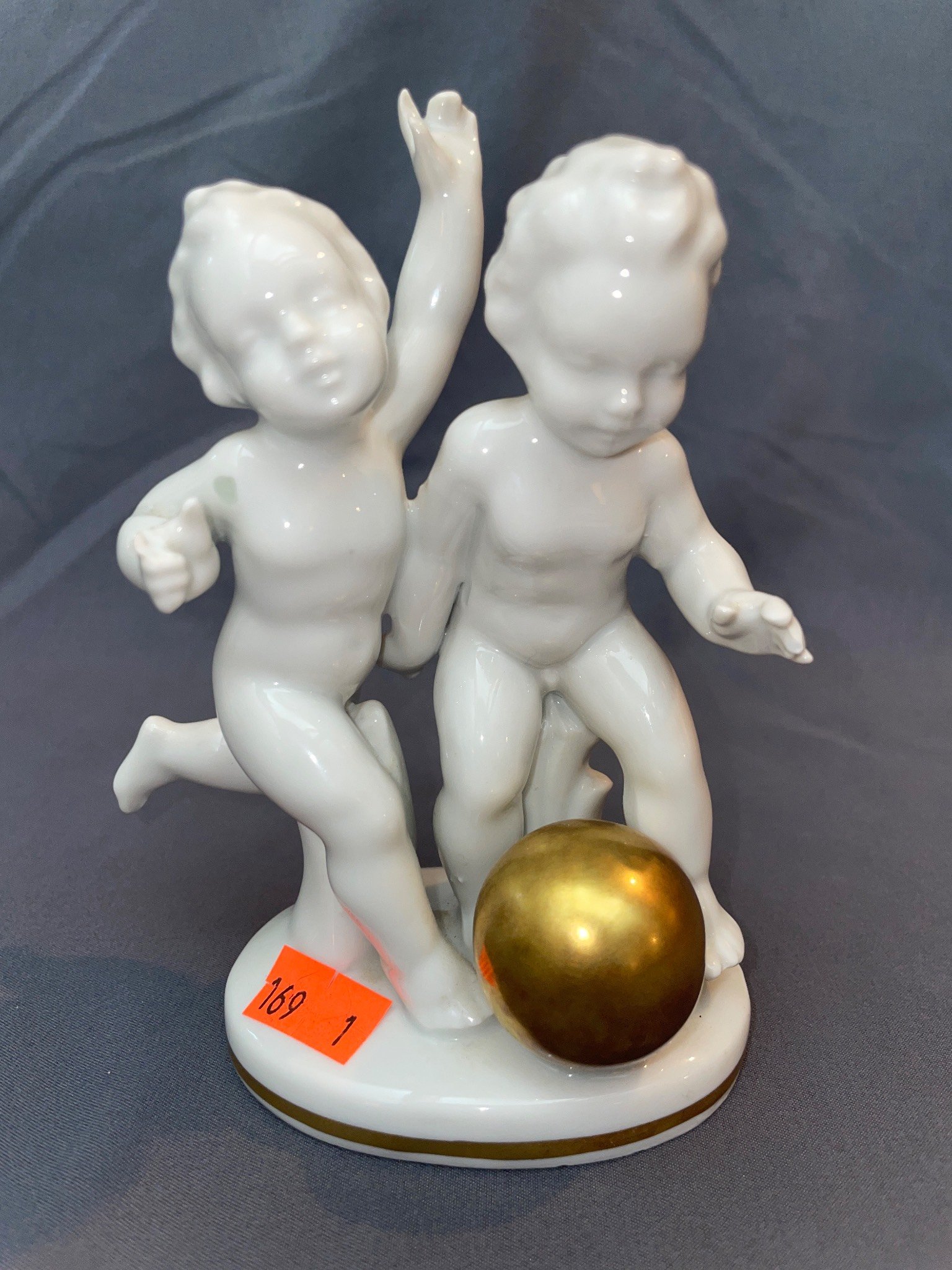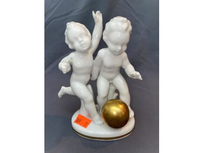 169 Gerold Porzellan Bavaria White Porcelain Figurine of Two Children with Gold Ball, 5”H