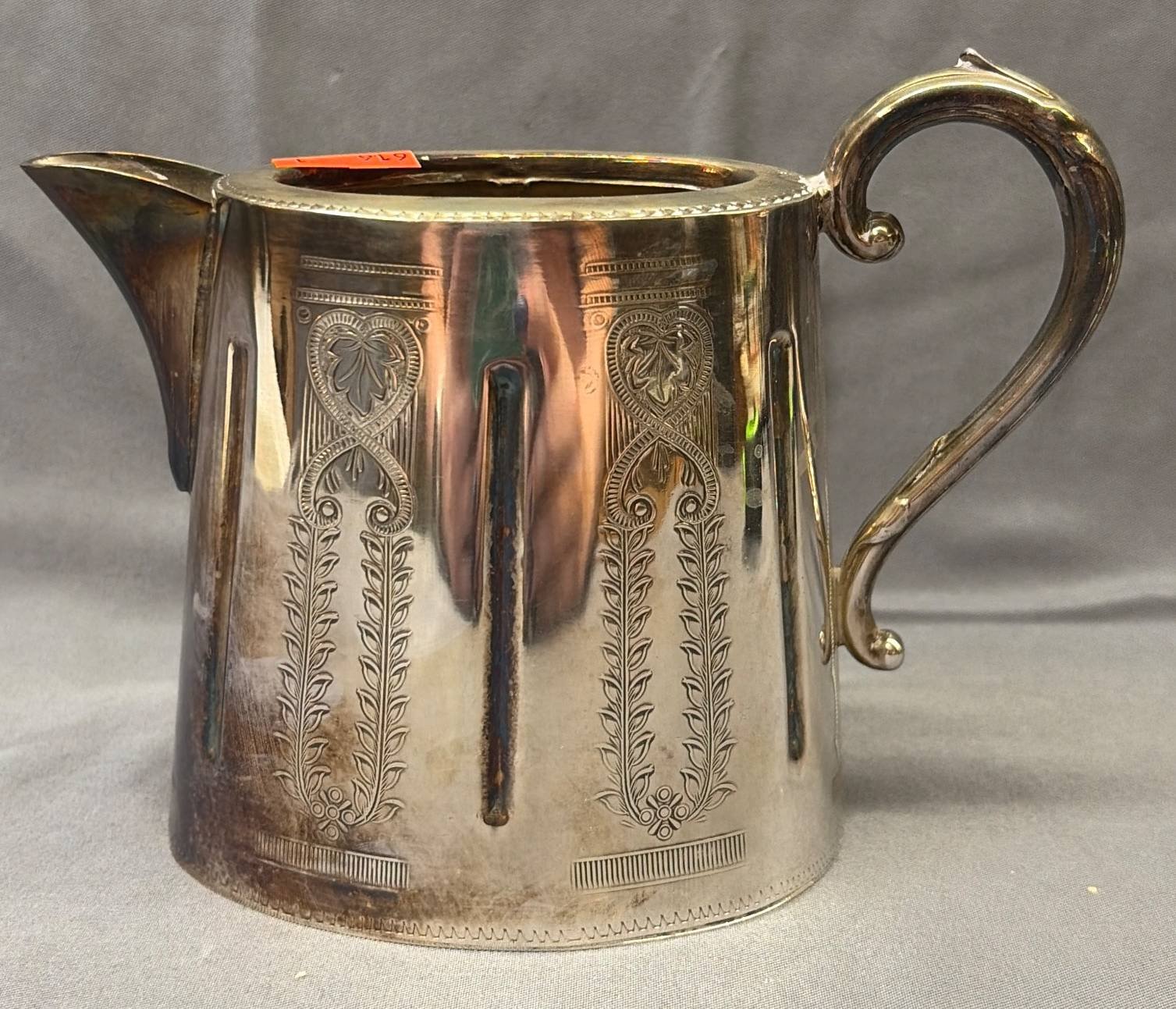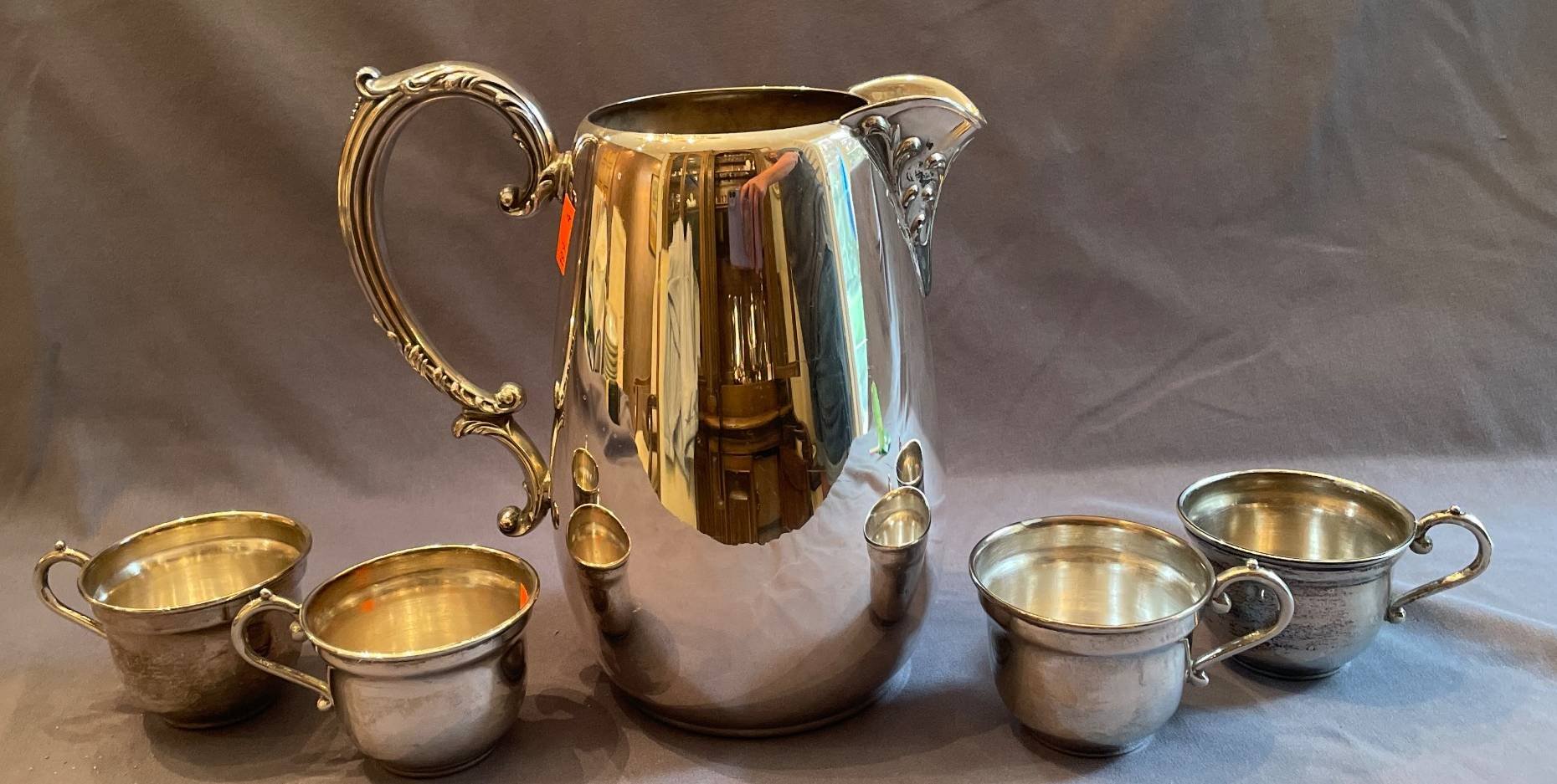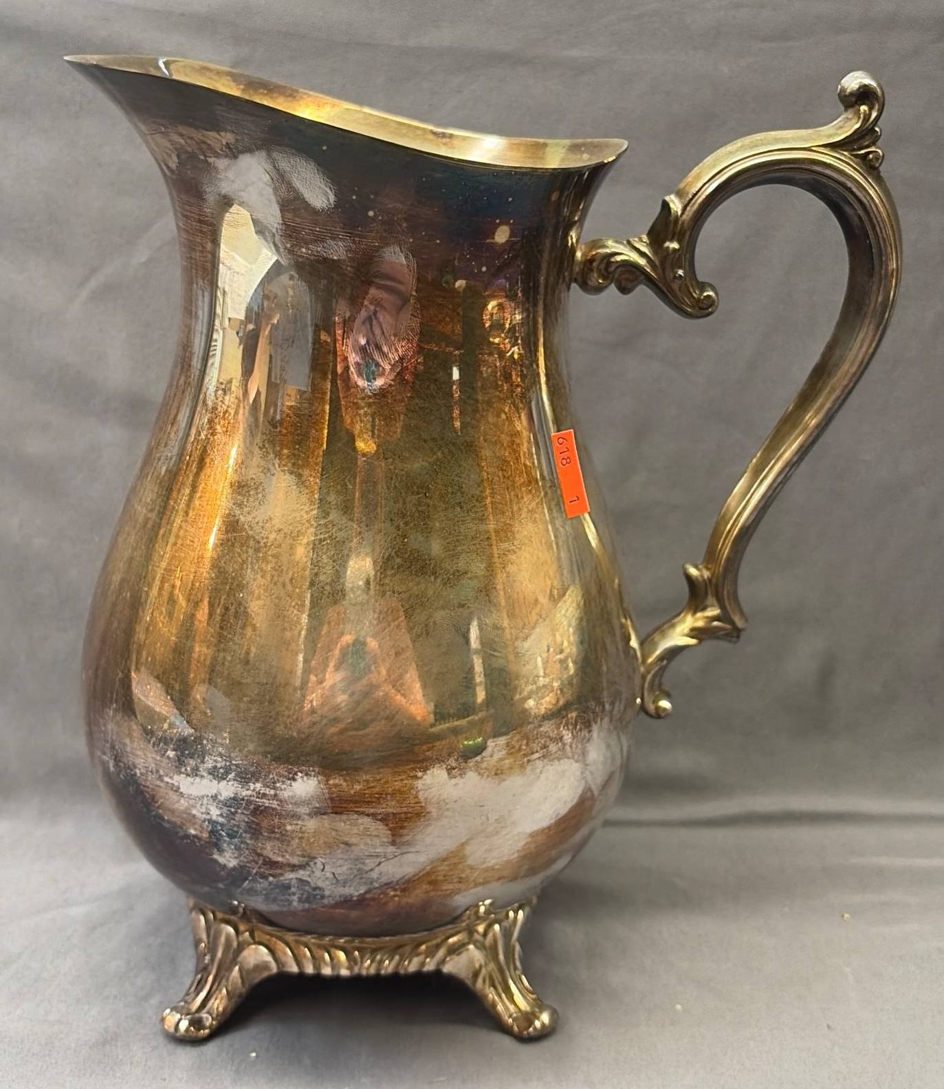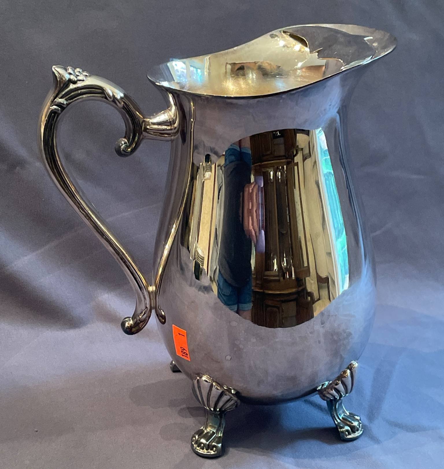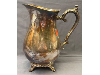 189 Silver-Plated Pitcher with Scrolled Handle and Ornate Feet, 9”H