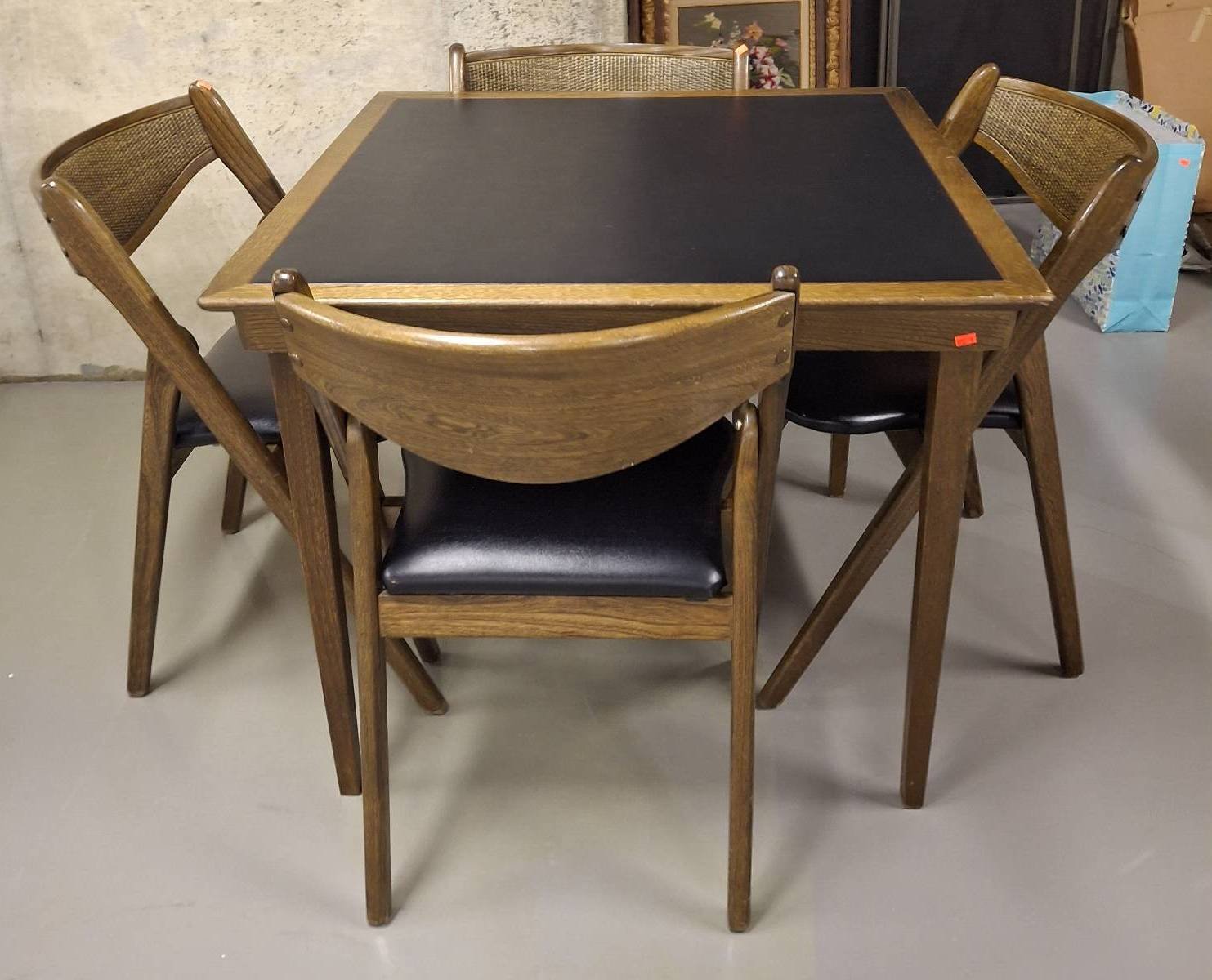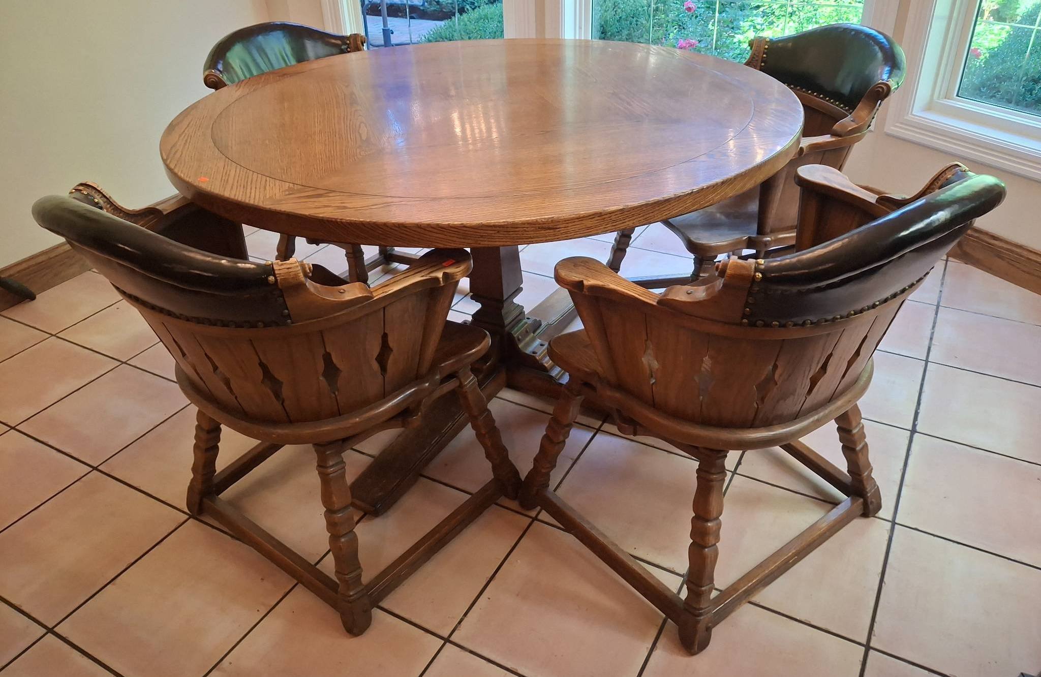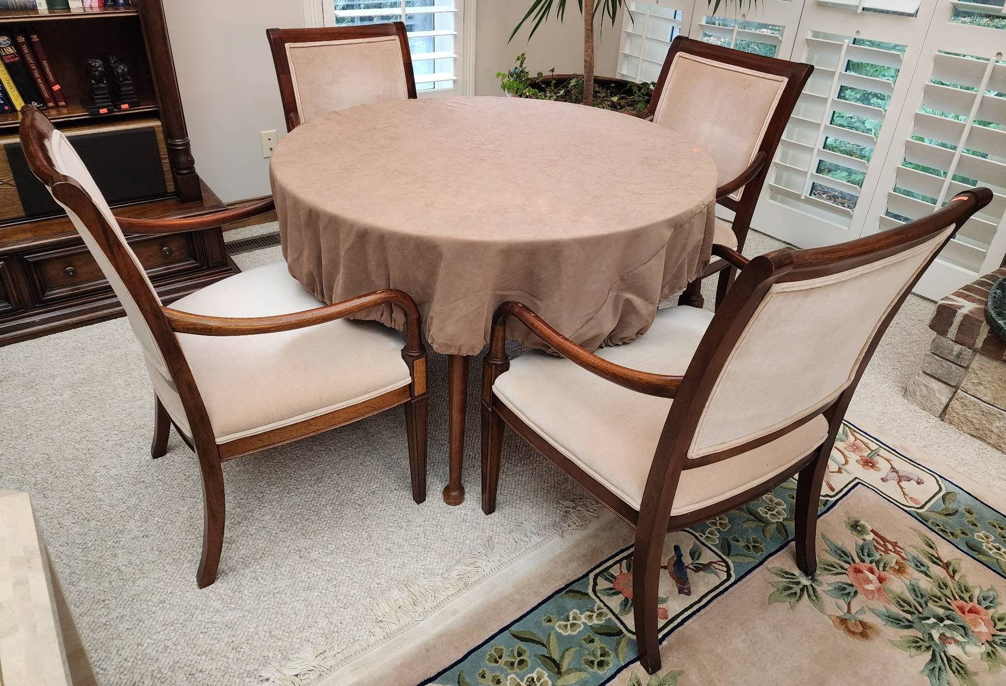 105 Cherry Round Dining Table with 4 Hickory Chair upholstered chairs-NO Cover Included. Top of Table shows wear, no table cover included. Features wood frame construction and fabric seat/back panels. chairs measure 24?x19?x36?. table, 44?x30?