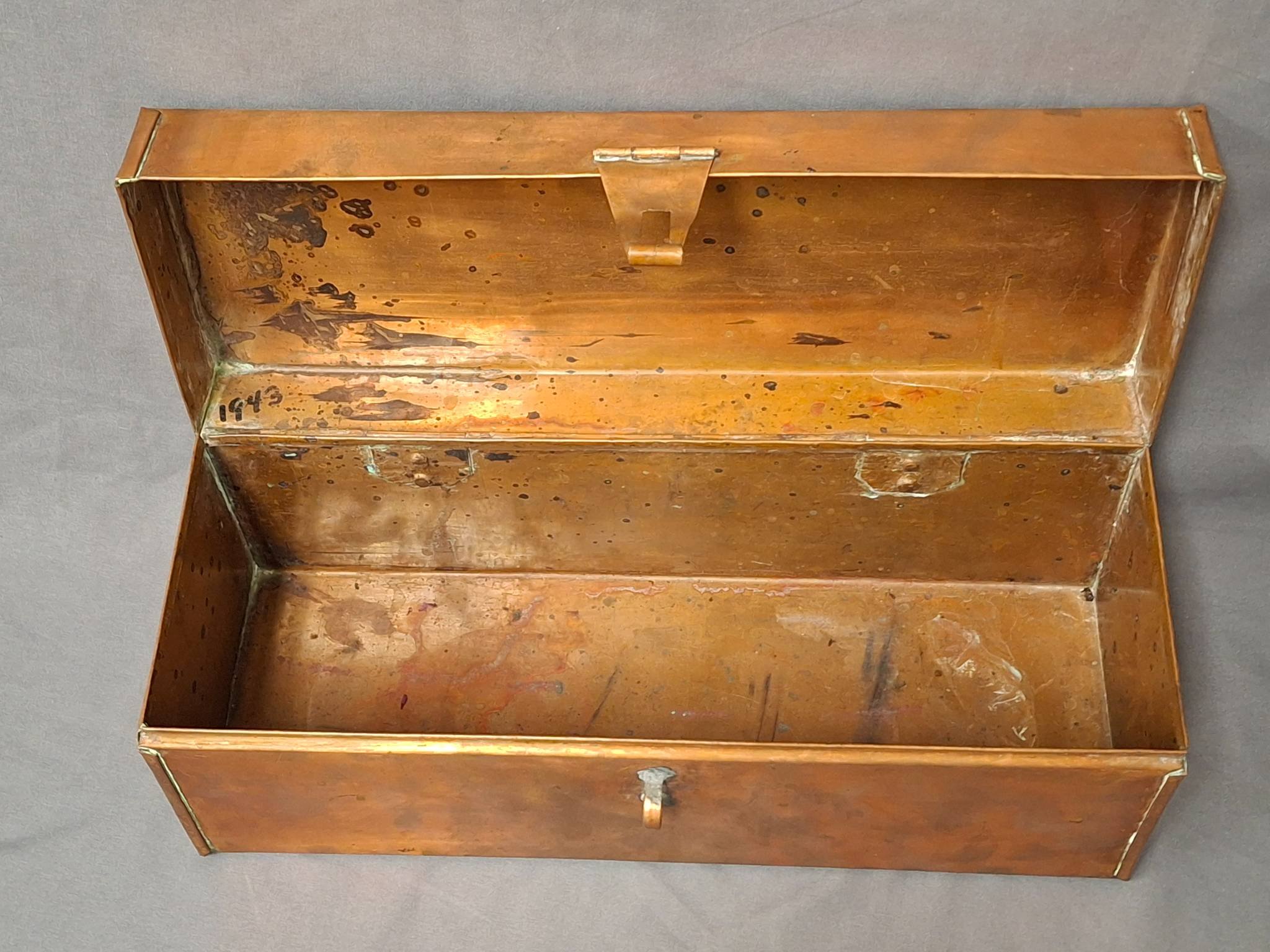 1411 Rectangular Copper Storage Box with Front Clasp Closure 14?x5?x6? (some tarnishing & signs of wear)