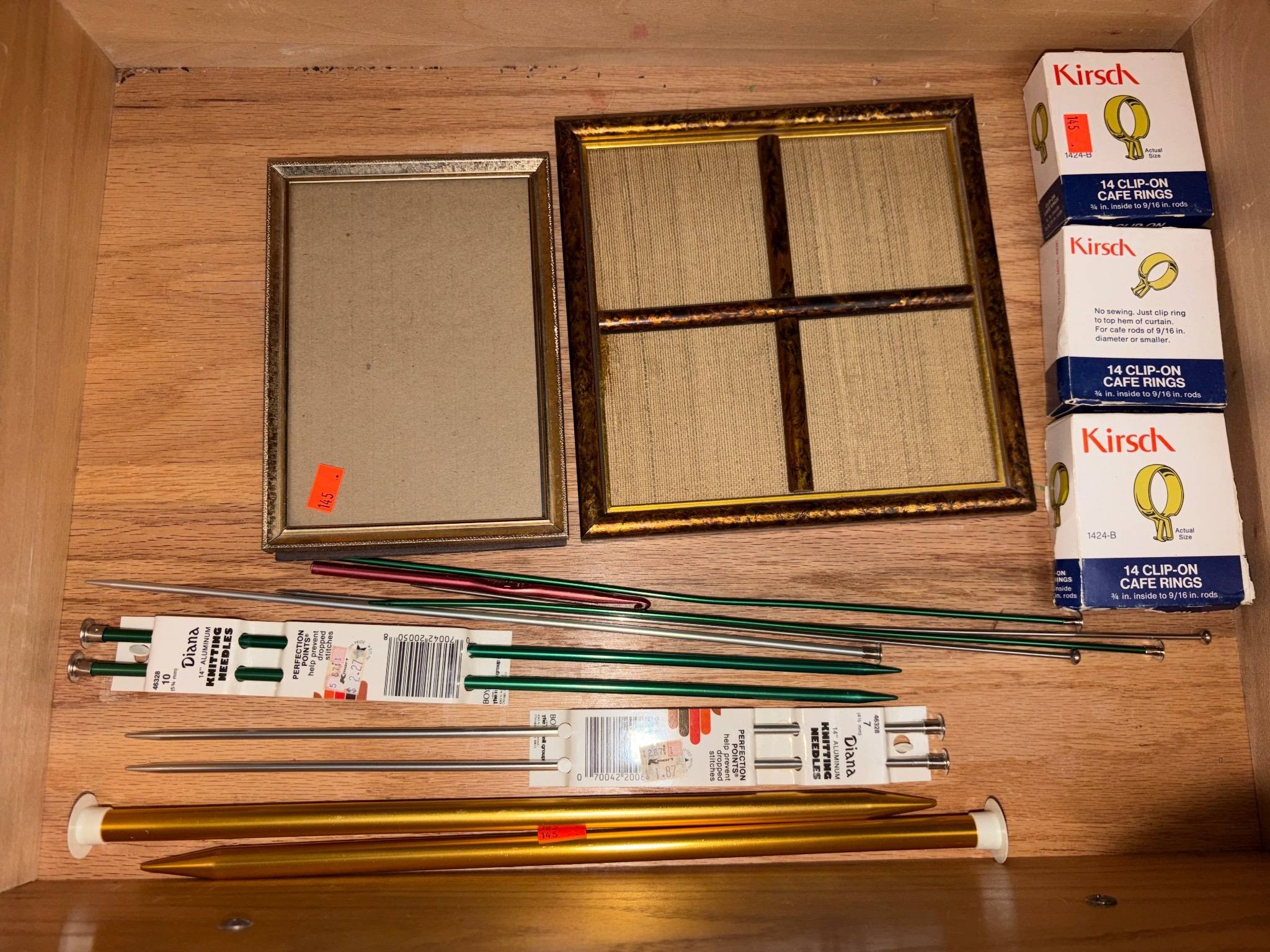 145 2 Picture Frames, Knitting Needles, Crochet Hook and Kirsch Clip-On Cafe Rings