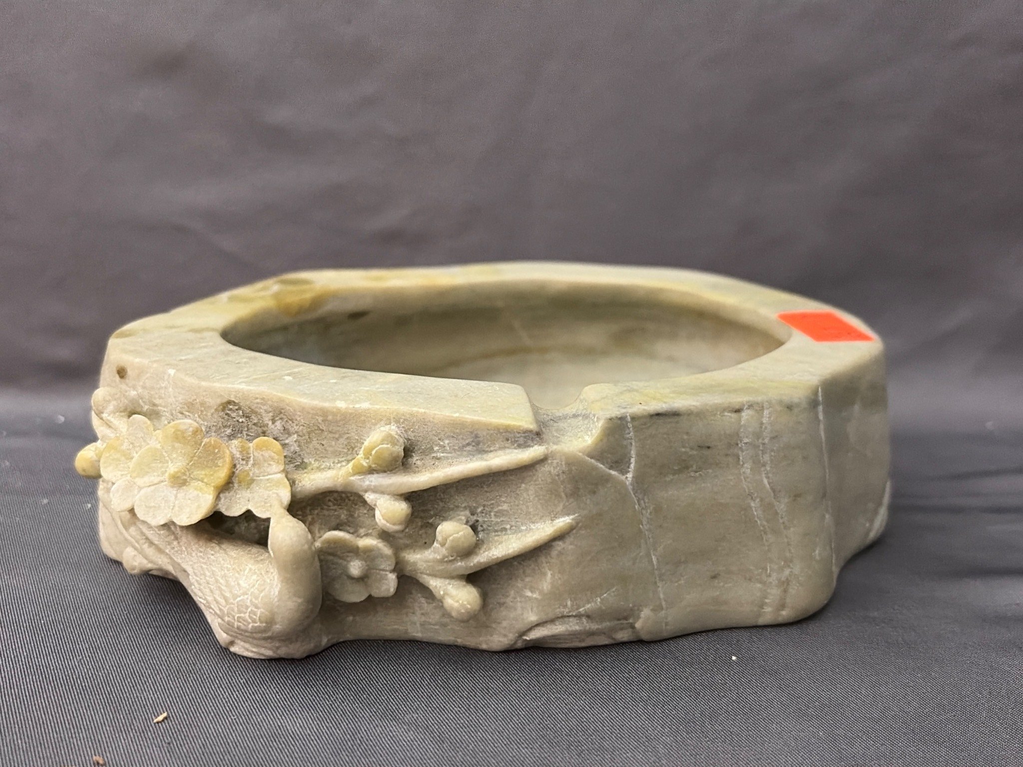 147 Carved Stone Dish with Floral and Bird Motif, 6”x4”x1.5”