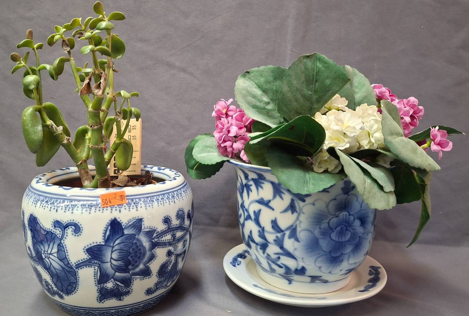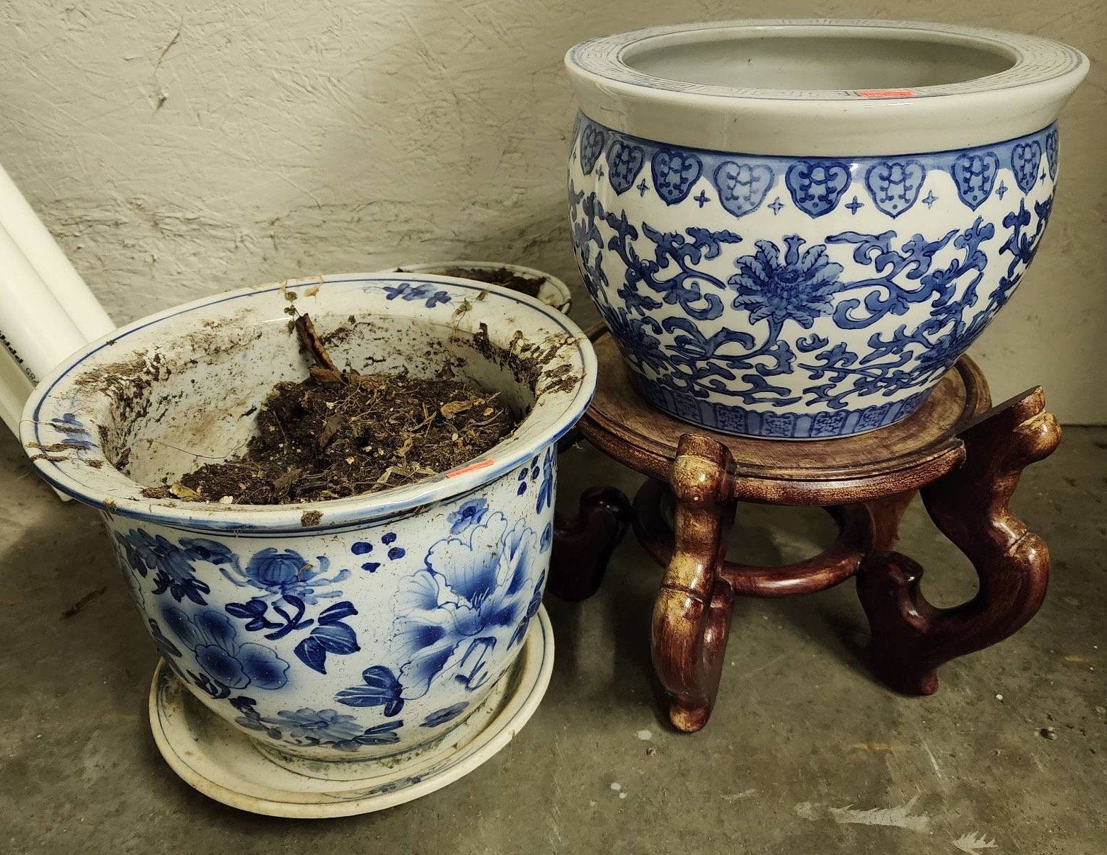 1501 3 Blue-and-White Planters with Wood Stand