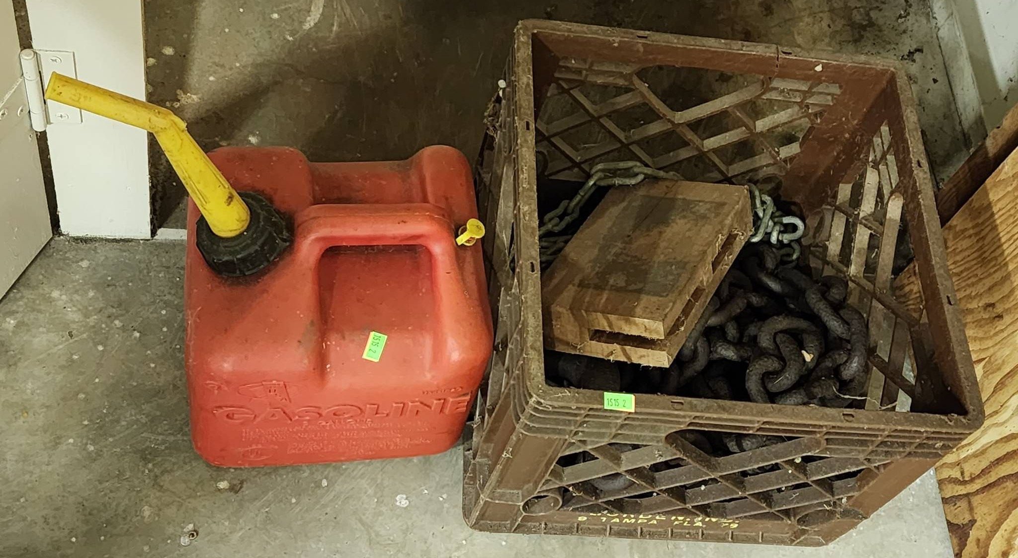 1515 Plastic Gas Container and Metal Chain in Plastic Crate