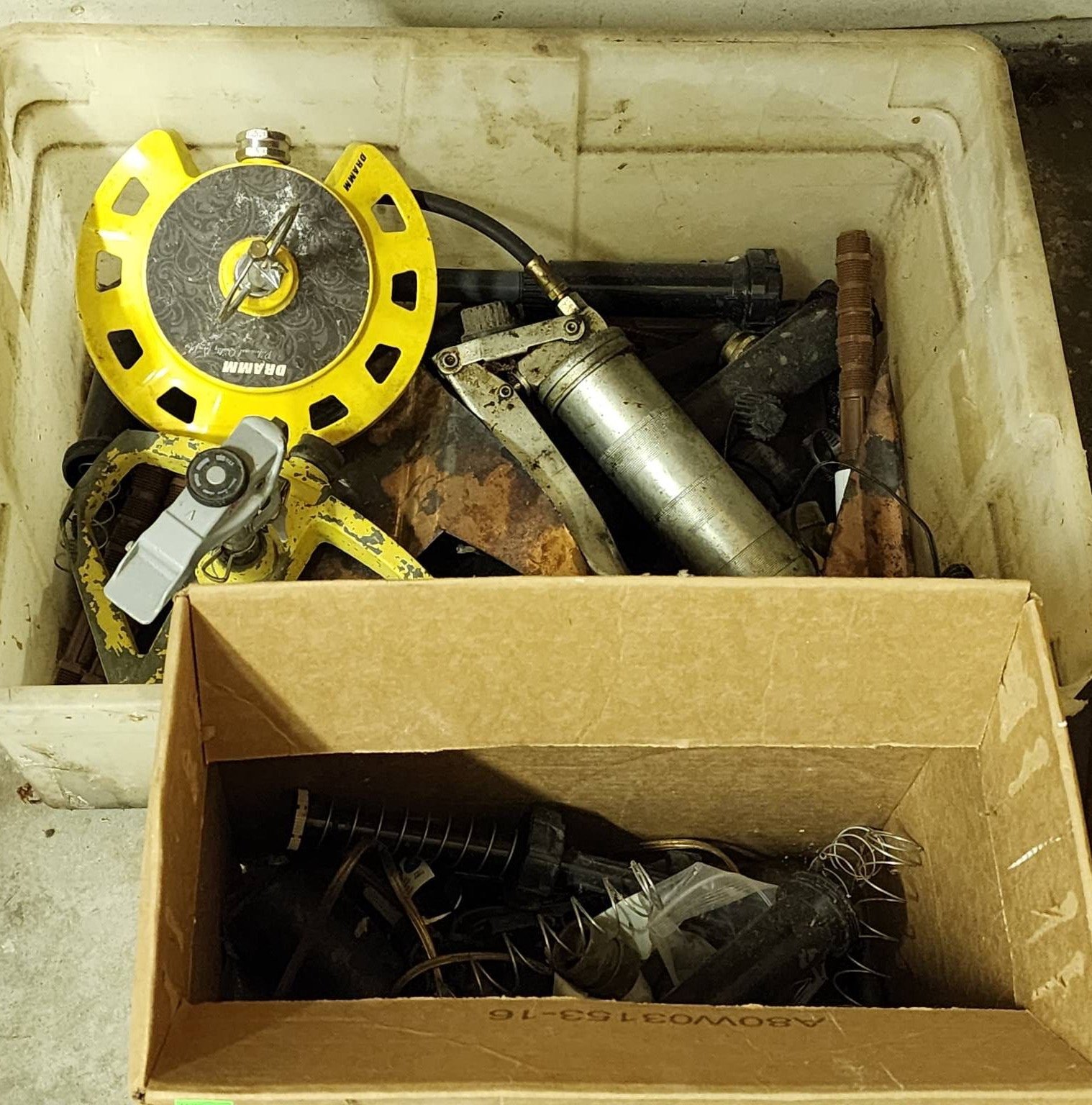 1520 Tools and Hardware Components inc. measuring reel, grease gun, springs