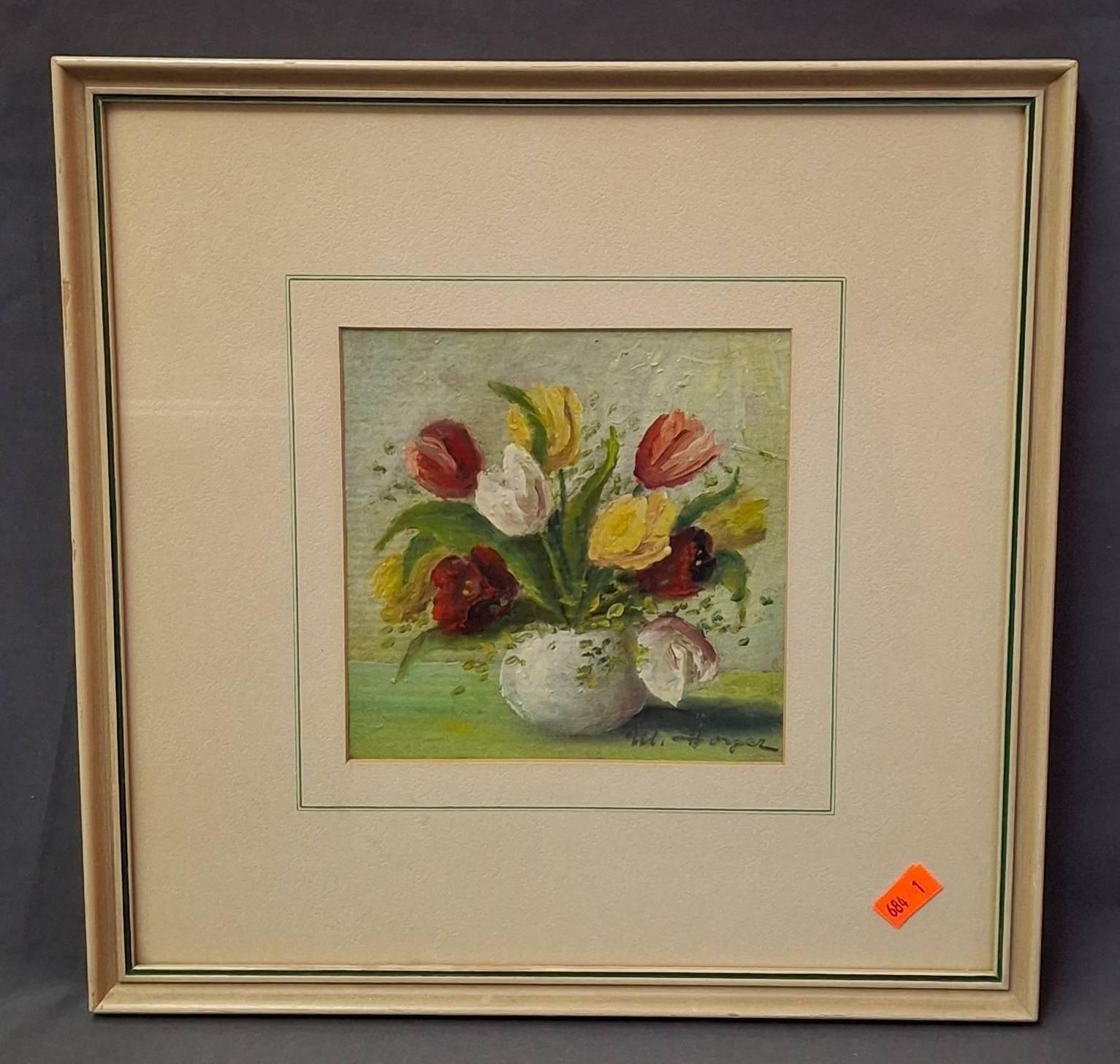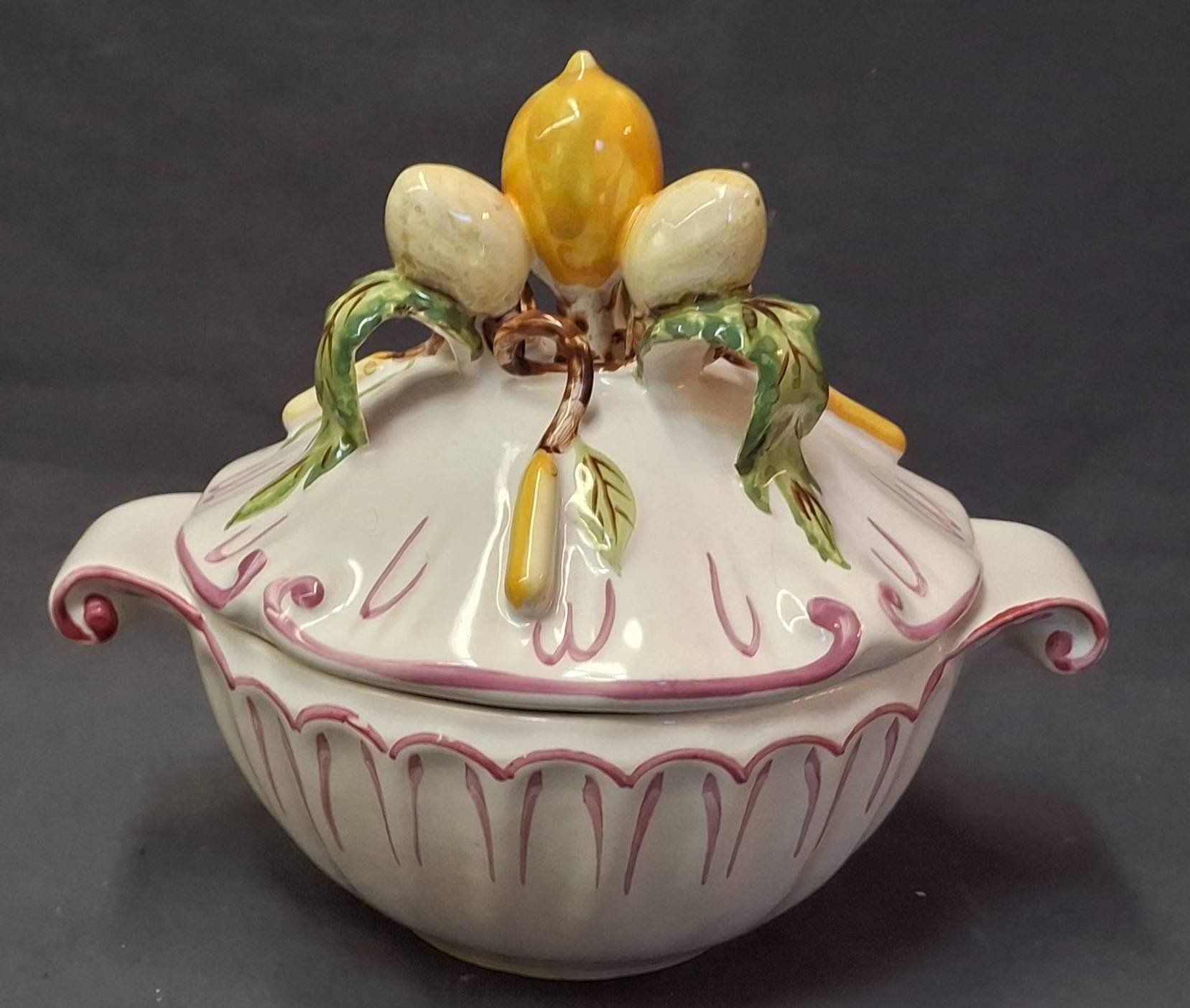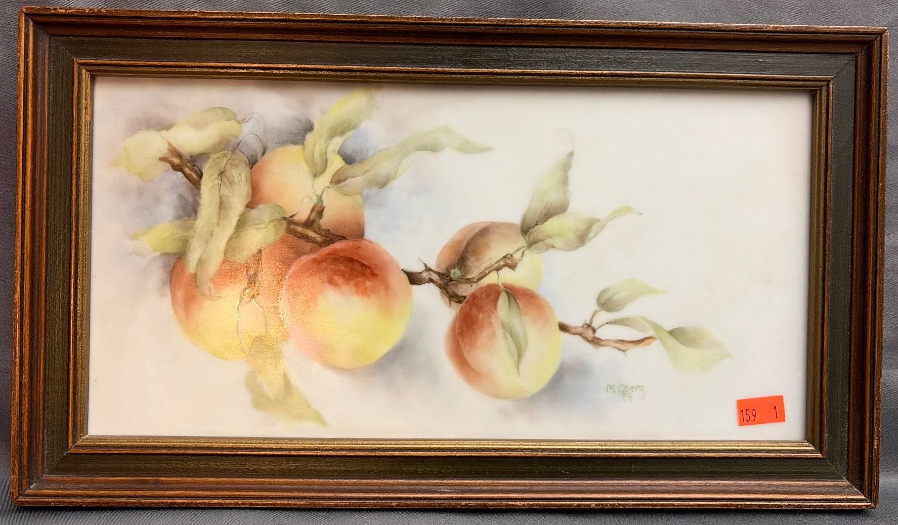 159 1979 Painted porcelain artwork Signed M. Oberg, Painting of Peaches, 13.5”x7.5”