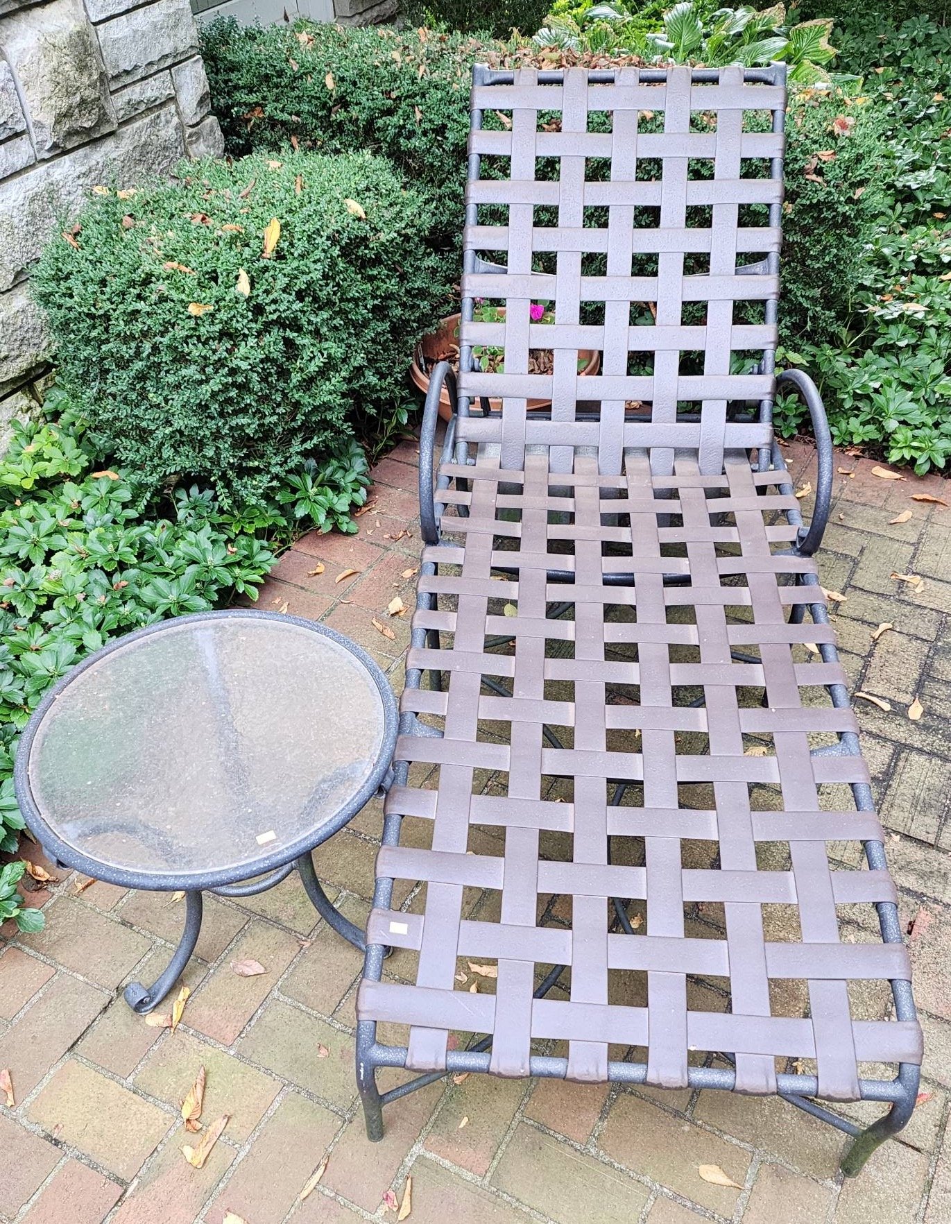 1601 Brown Jordan Metal Chaise Lounge Chair with Strap Design 72x26x33” and Matching Side Table 19×17”