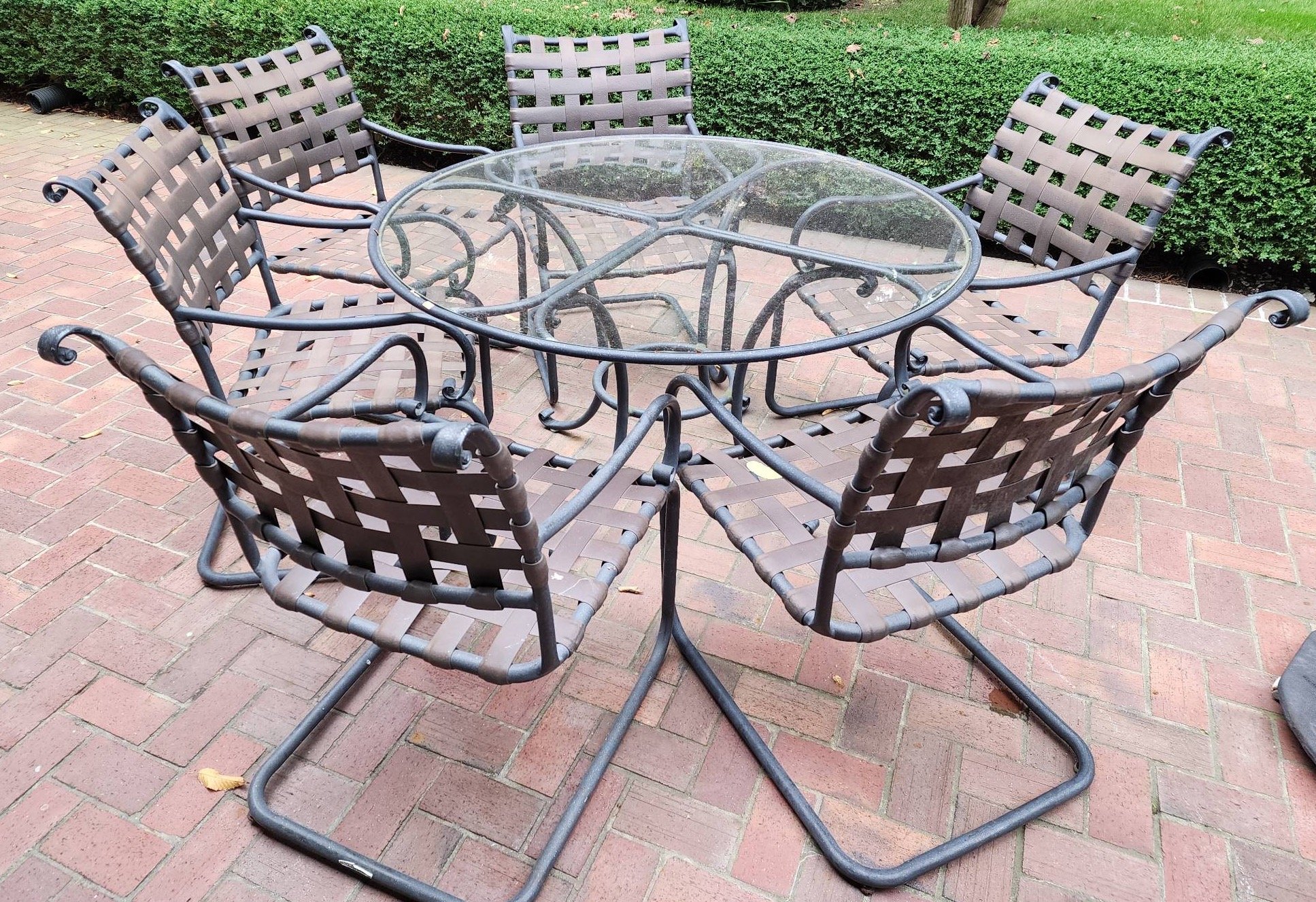 1602 Brown Jordan Metal and Glass Patio Table with 6 Strap-Designed Chairs 50×28”