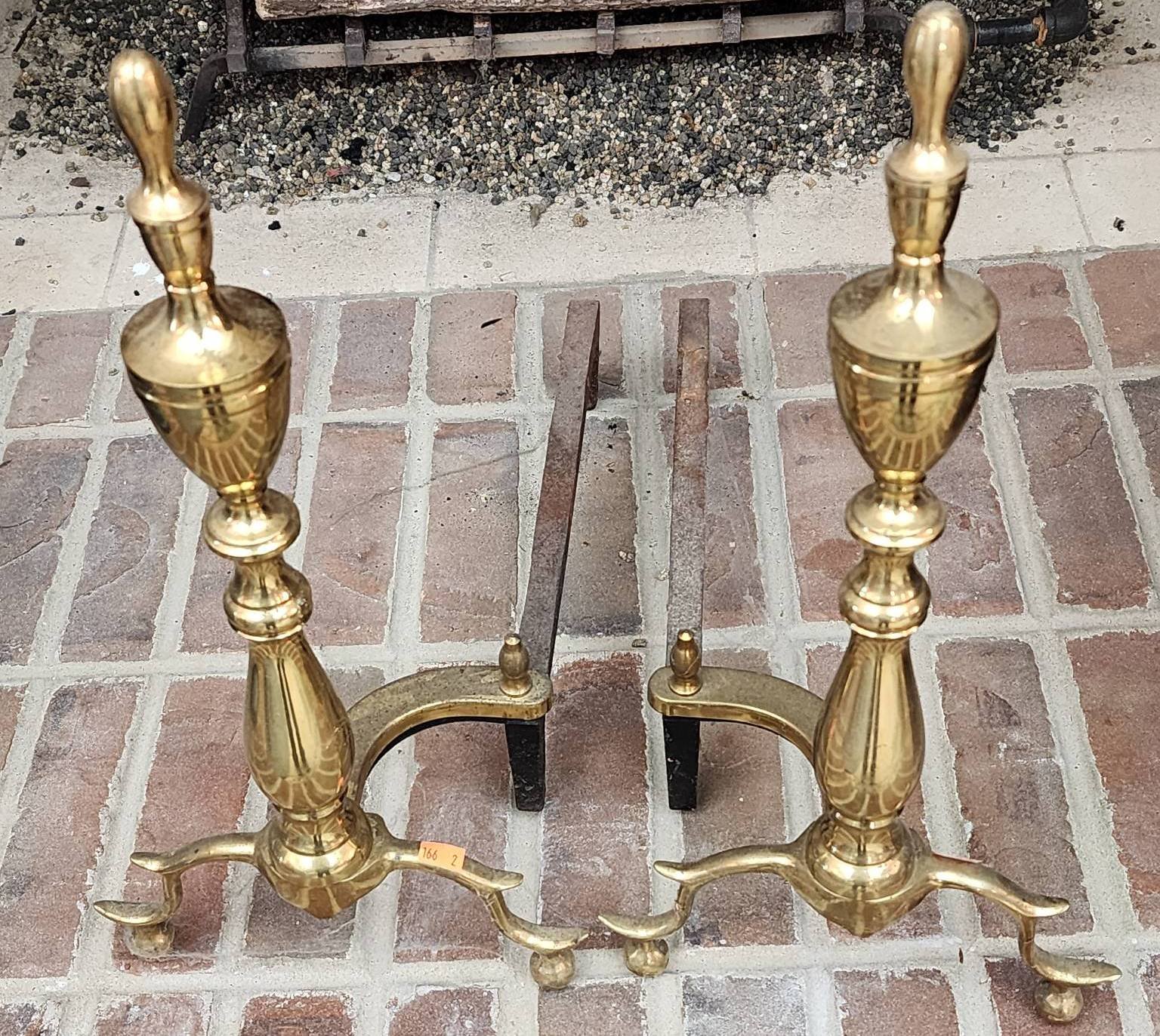 166 Brass Andirons with Finial Tops and Curved Supports