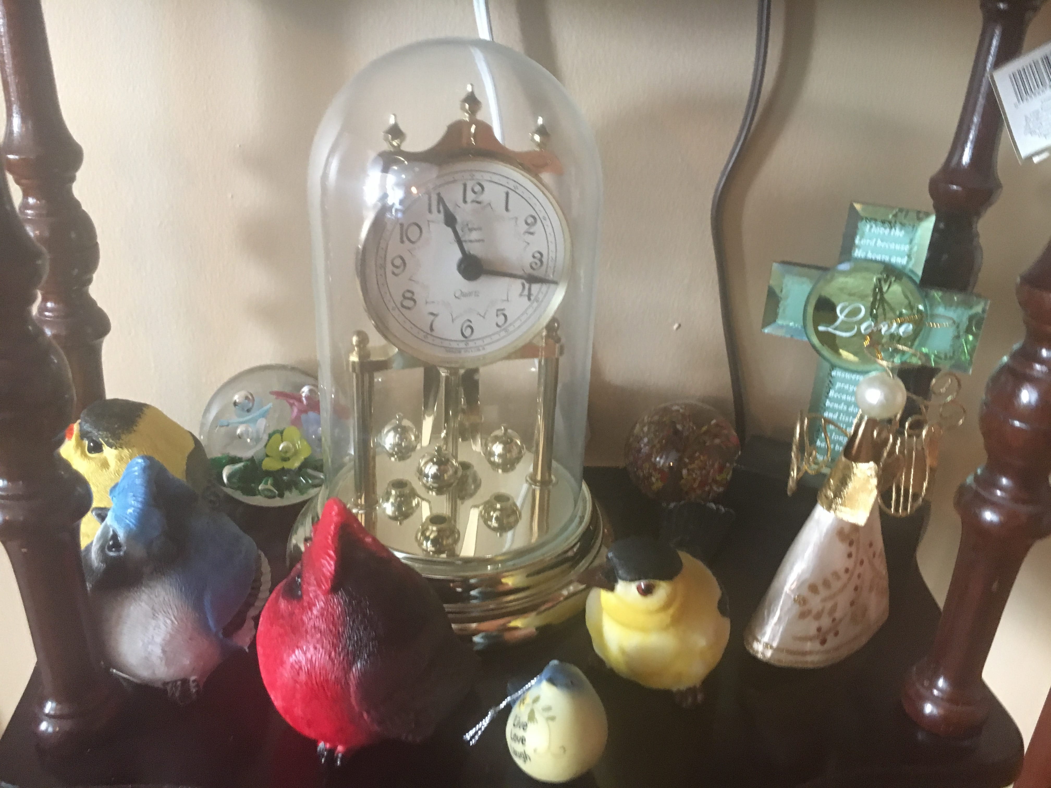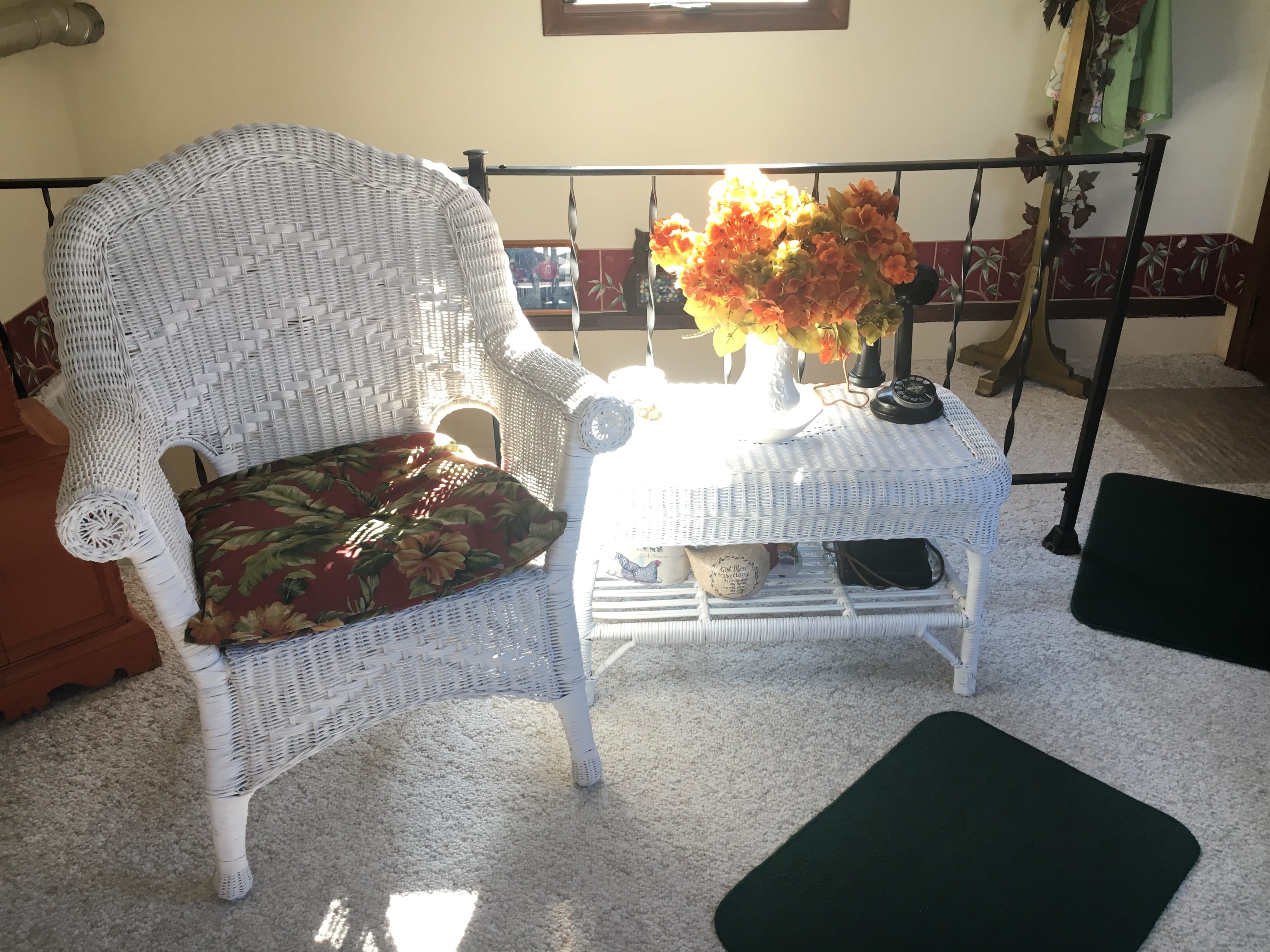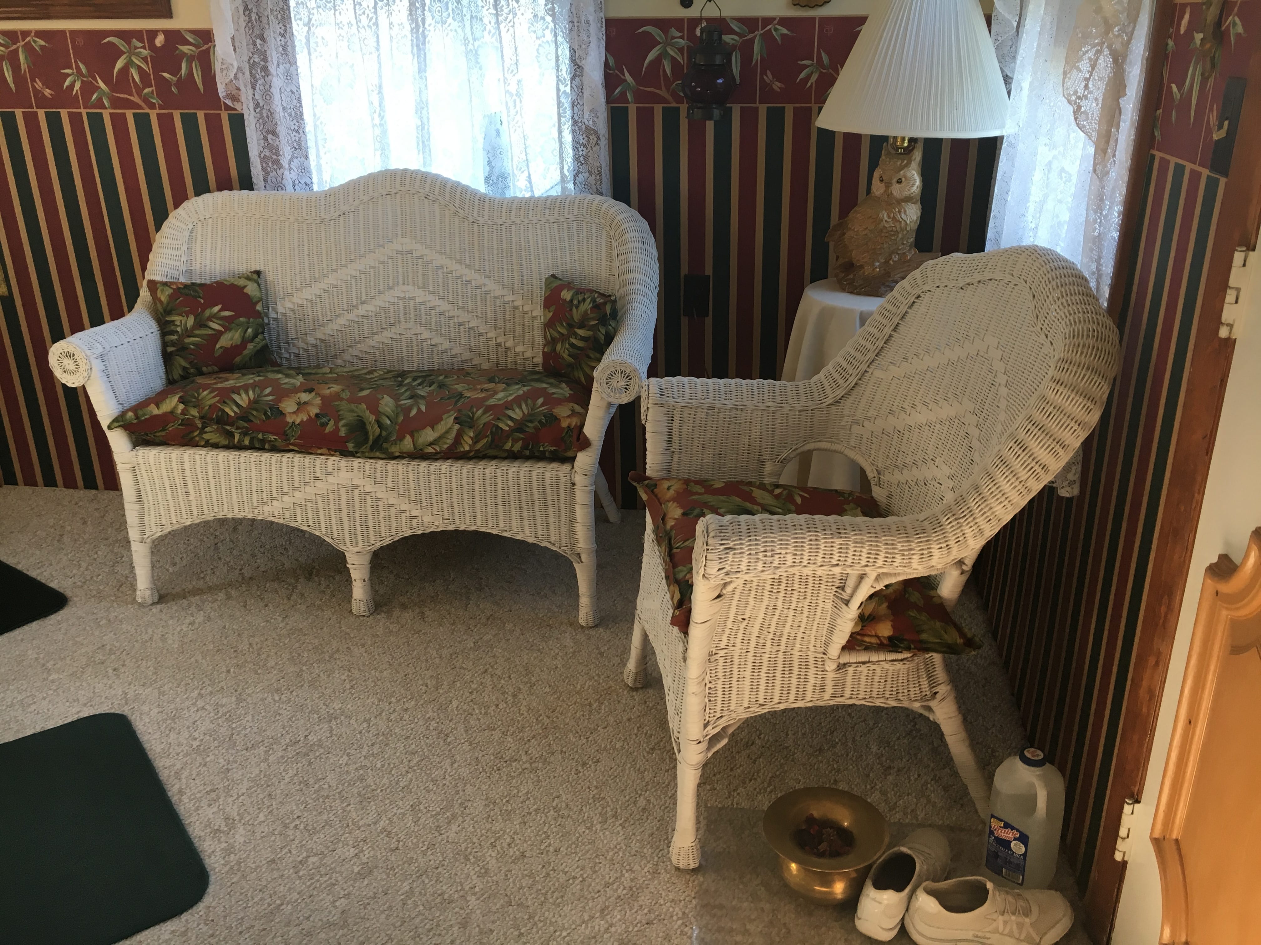 Sofa; Leather Recliner; Wicker Patio Set; Grandfather Clock; 3 pc. Bedroom Suite; Queen Size Bed; Armoire; 2 Twin Beds; Childs Rocker; Midcentury Desk; Office Chair; Filing Cabinet; Kimball Organ – Fascination the Entertainer; Hymnals; Pots, Pans, Dishes, Bakeware, Sm. Appliances; Pictures, Prints & Oil Paintings; Tapestry; Floral Arrangements; Mirrors; Longaberger Baskets; Console Radio; Sony Stereo System; Exercise Equip.; Puzzles & Games;