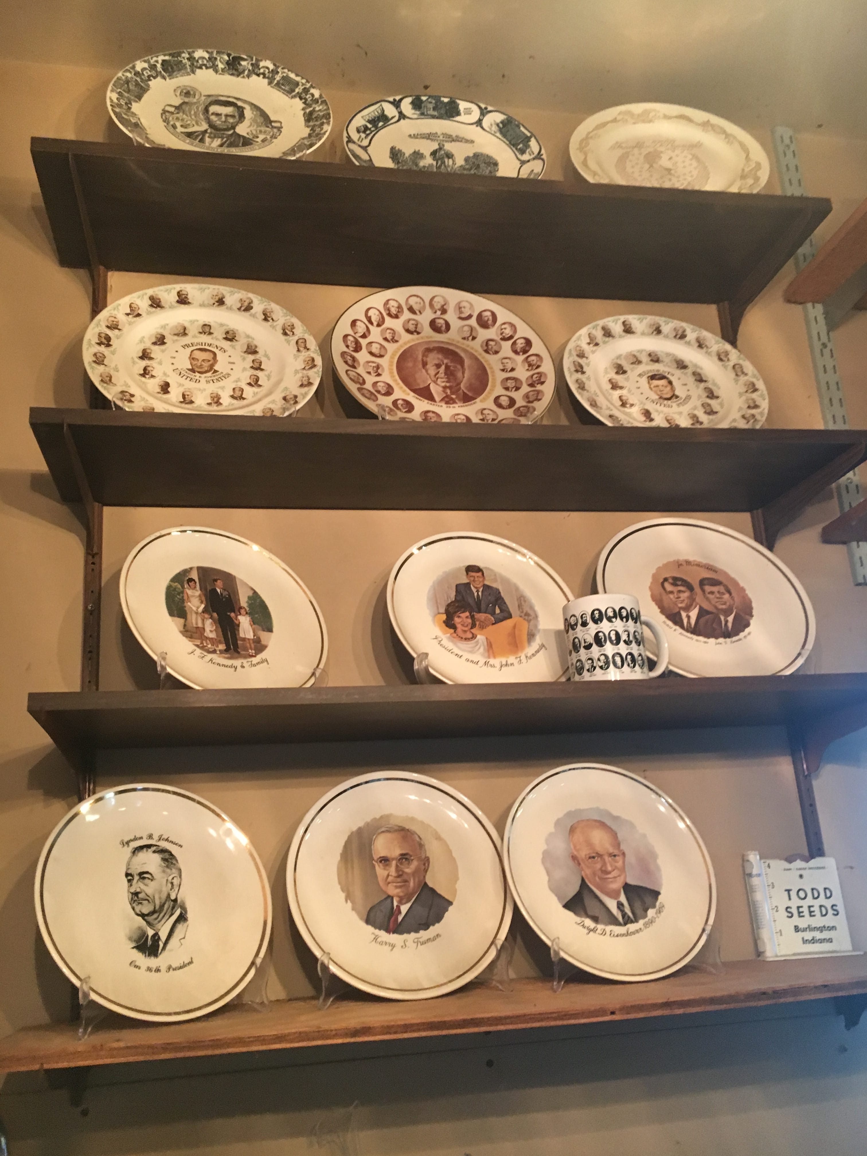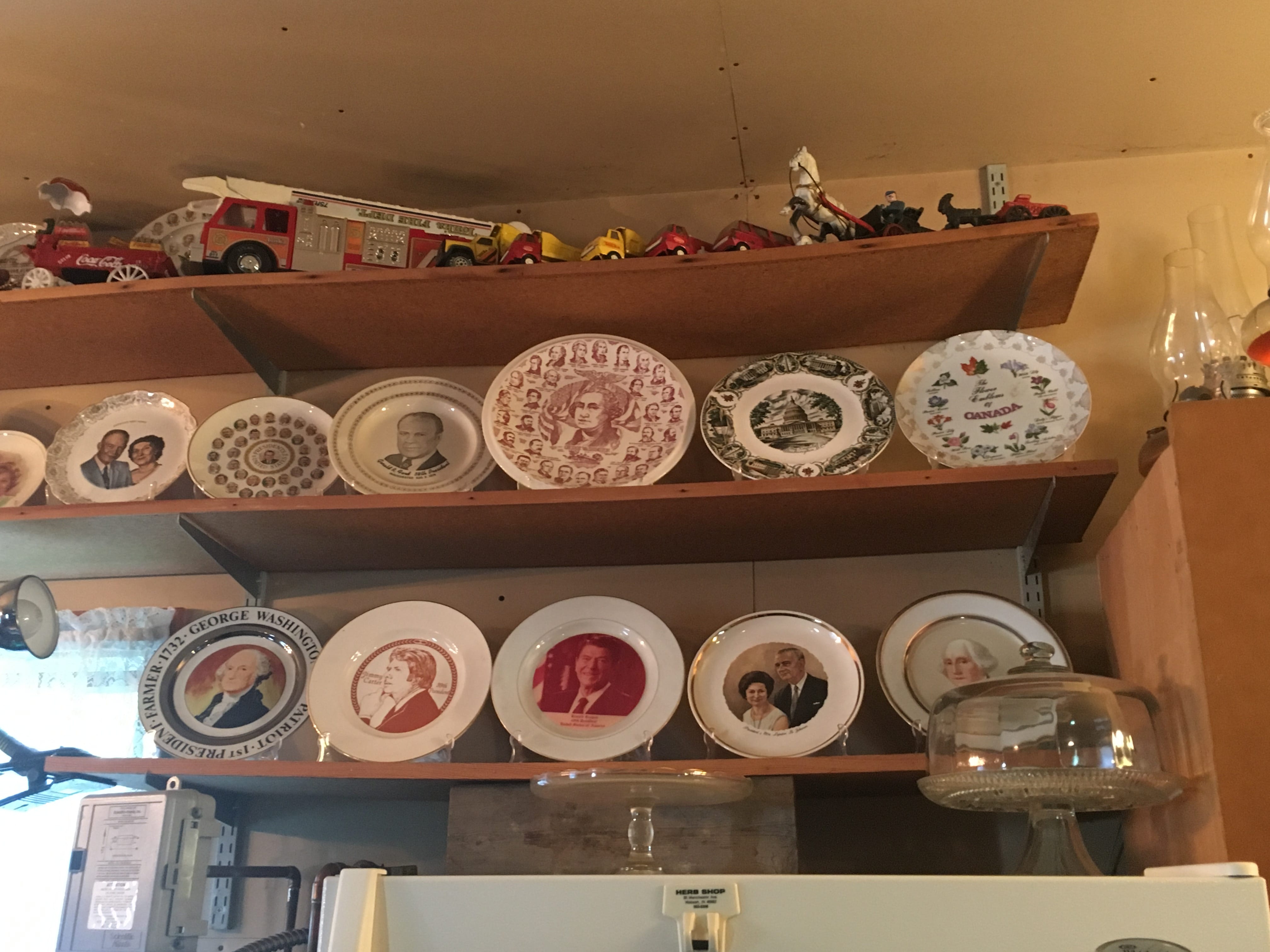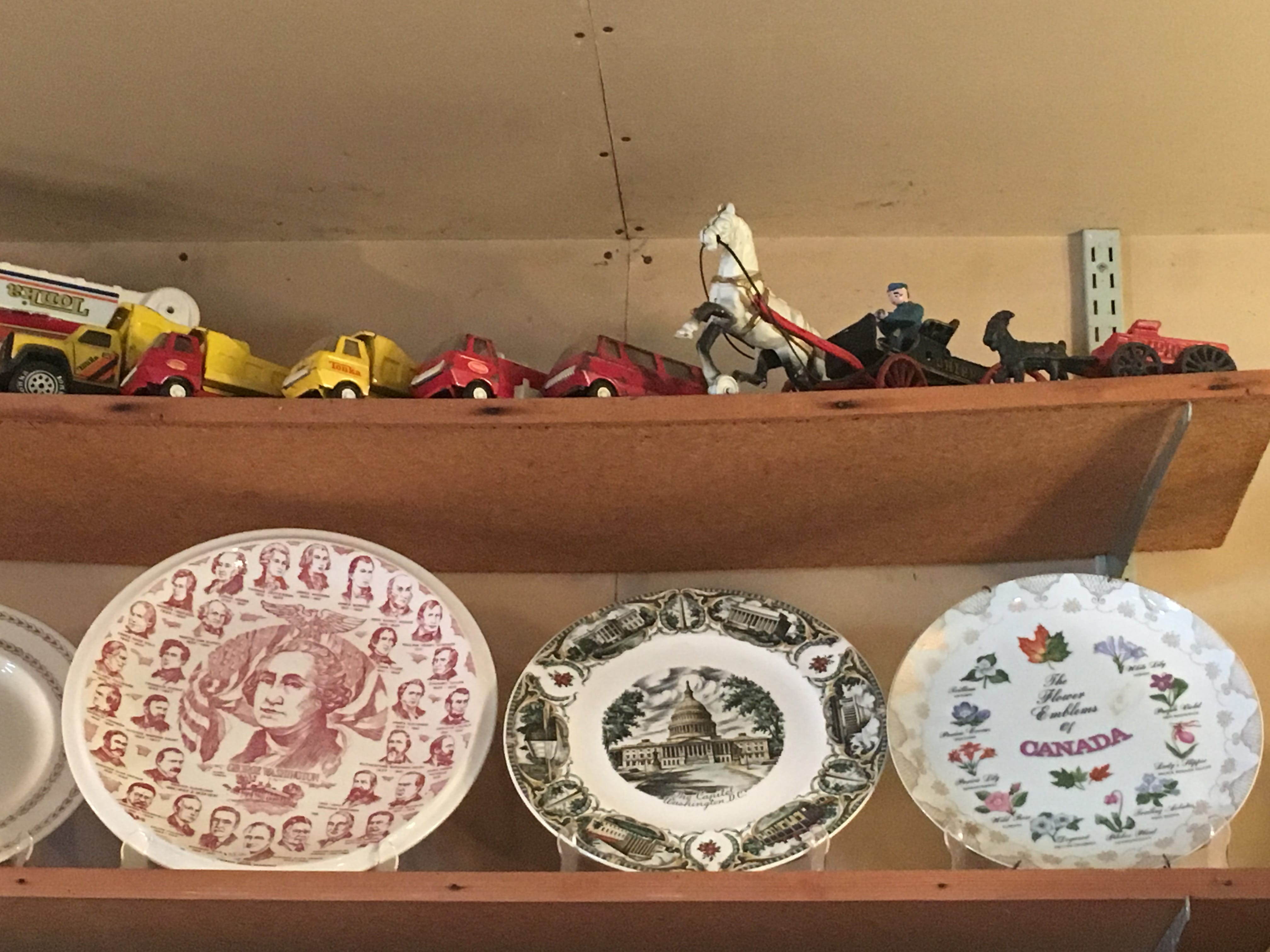 Oak Pedestal Table w/ Pressed Back Chairs; Dining Room Table & Cane Back Chairs; China Cabinet; Buffet; Dresser w/ Mirror; Lamp Table; Marble Top Plant Stand; Wood Desk; School Desks; Waterfall Cedar Chest; Trunks; Cast Iron Patio Furniture; Tiered Plantstands; Console Radio; Western Radio; Farnsworth Radio; Plymouth Mantle Clock; Cuckoo Clock; Anniversary Clock; Master Crafters Clock; Oil Lamps; Oil Lamps w/ Cast Iron Bracket; Gone w/ Wind Lamp; Birdcage; Ped. Cake Plate; Hull; Fenton; Carnival; Alabaster Glass; Pitchers; Bells; Pitcher & Bowl; Ironstone & Brown Stoneware; Stemware; Tea Pots; Hand Painted Porcelain; Avon pcs.; Glass Shoes; Norman Rockwell Cup; Owl & Bird Figurines; Snow Globes; Music in Motion Figurines; Collector Plates; Quincentenaries Presidential Plates; Spirit Of 76’ Plate; Candlestick Telephone; Western Elec. Wood Wall Phone; Vintage Cameras; Typewriter; Picnic Basket; Spittoon; Copper Boilers; Apothecary Bottles, Akron IN; Canning Jars inc. Blue; Glass Butter Churn; Arrowheads; Indian Stones; Axe Heads; Pocket Knives inc. Case & Barlow; Lightning Rods & Balls; Cast Iron Bell; Sambo Sprinkler; Chrome Fire Extinguishers; Parking Meter; Stoplight; Platform Scale; Double & Single Trees; Pitcher Pump; Barn Pulleys; Scythe; Wood Torch; Oilers; Hand Crank Corn Sheller; Cherry Pitter; Apple Peeler; Reel Mower; Barn & RR Lanterns; Candle Molds; Match Holder; Lunch Pail; Cow Bells; Hanging Scale; Lil Red Wagon; Adv. & Street Signs; Sled; Root Beer Barrel; Spring Seat; Hay Trolley; Ox Yoke; Crosscut Saw; Hand Saws; Buck Saw; Broad Axe; Barn Beam Augers; Draw Knives; Grain Cradle; Ice Tongs; Egg Basket; 1927 License Plates; Mailboxes; Hand Tools; Lard Press; Corn Jobber; Block & Hand Planes; Hay Forks; Hay Knife; Galvanized Sprinkling Cans; Milk Crates; Milk Cans; Kitchen Scale; Vintage Books inc. School & Time Life; Engineering Books; Fulton County History Books; Horn; Mannequin; Vintage Hats Men & Women; Linens; Porcelain Dolls; Antique Ventriloquist Doll; Dress Form; Camel Saddle; Cast Iron Door Stop; Model Cars; Farm Toys; Tonka Toys inc. Fire Truck; Cast Farm Toys; Toy Gas Pumps; Marbles;