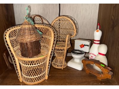 419 Wicker Chairs, Miniature Toilet, Bowling Pins, and Nutcracker
