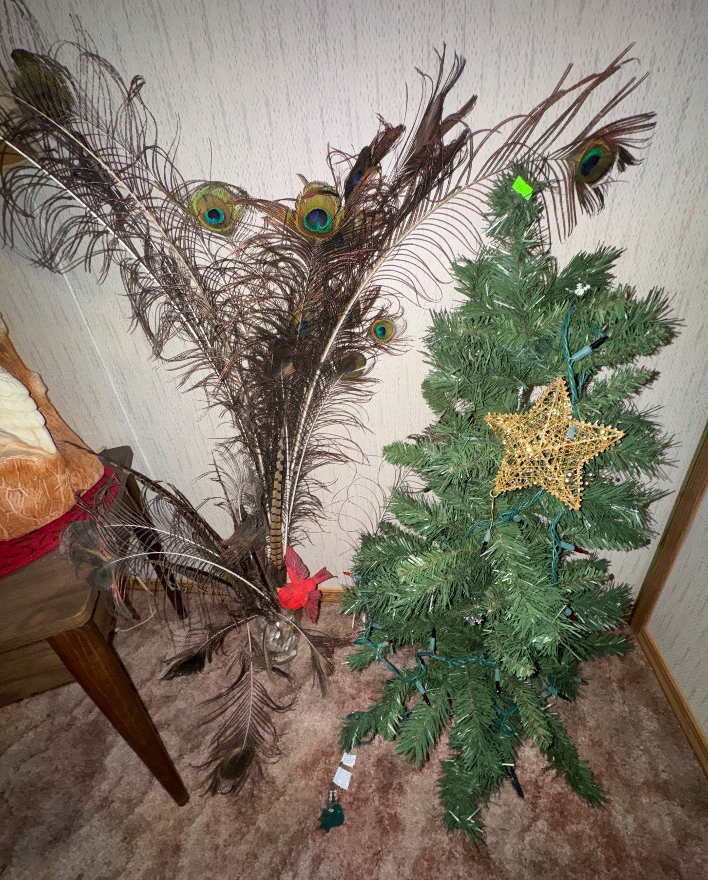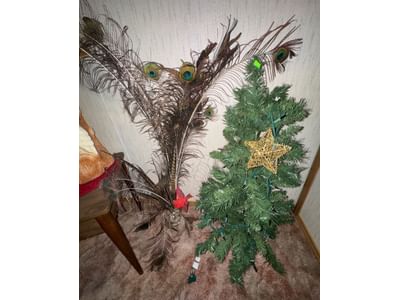 433 Artificial Green Tree with Star Topper and Vase with Peacock Feathers