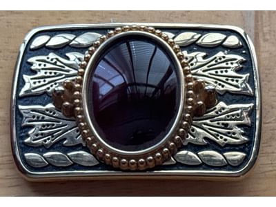 439 Metal Belt Buckle with Gold-Tone Accents and Central Red Cabochon