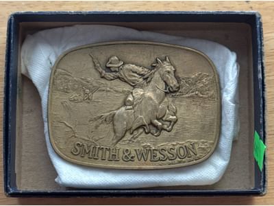 441 1975 Smith & Wesson Brass Belt Buckle with Cowboy and Horse Motif
